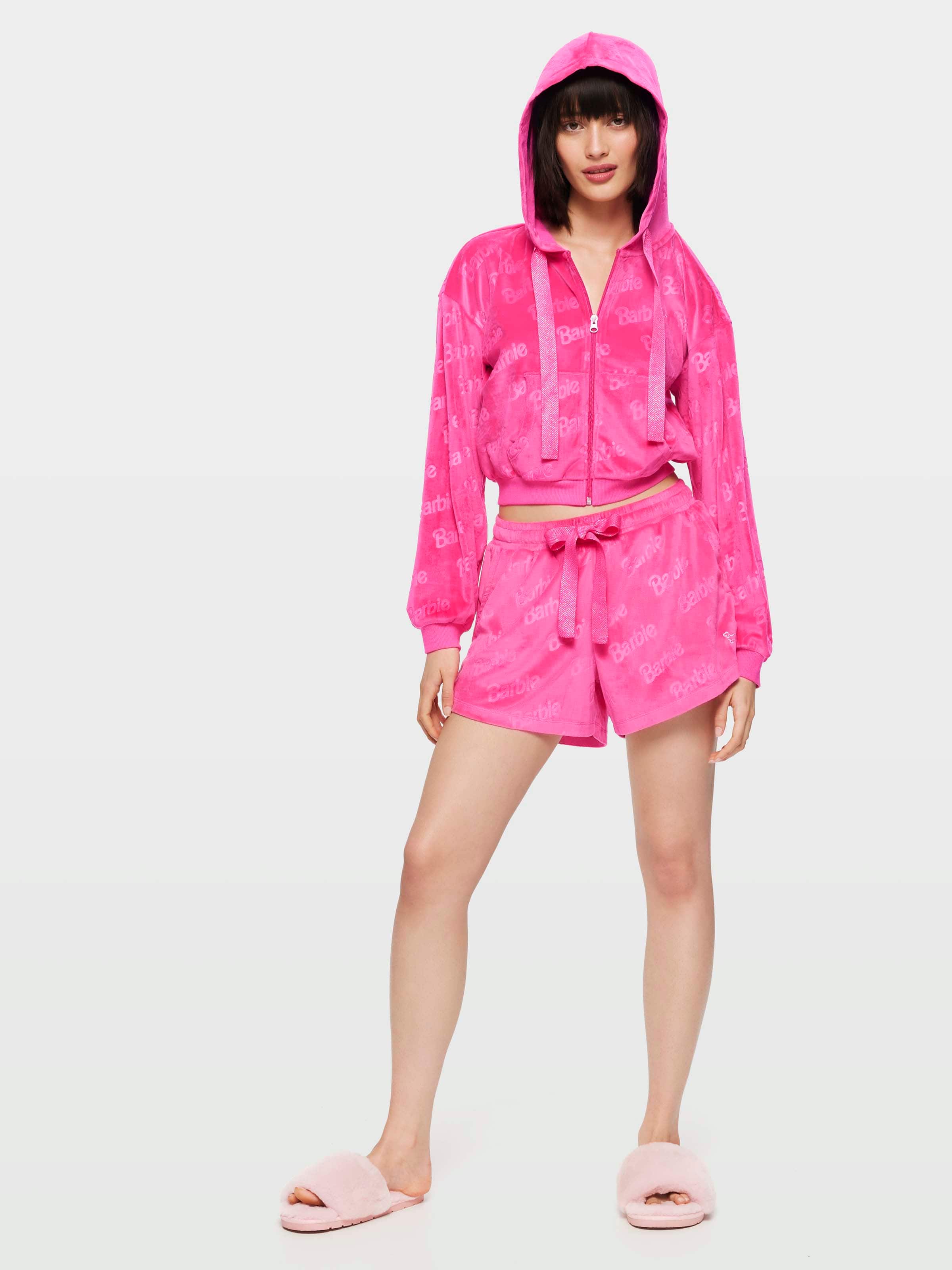 This bright pink Barbie embossed velour PJ short is sure to put a sparkle in your eye! Designed for day or loungewear, this luxe mid length fashion style pairs perfectly with the matching cropped hoodie for a show-stopping, yet comfy look.