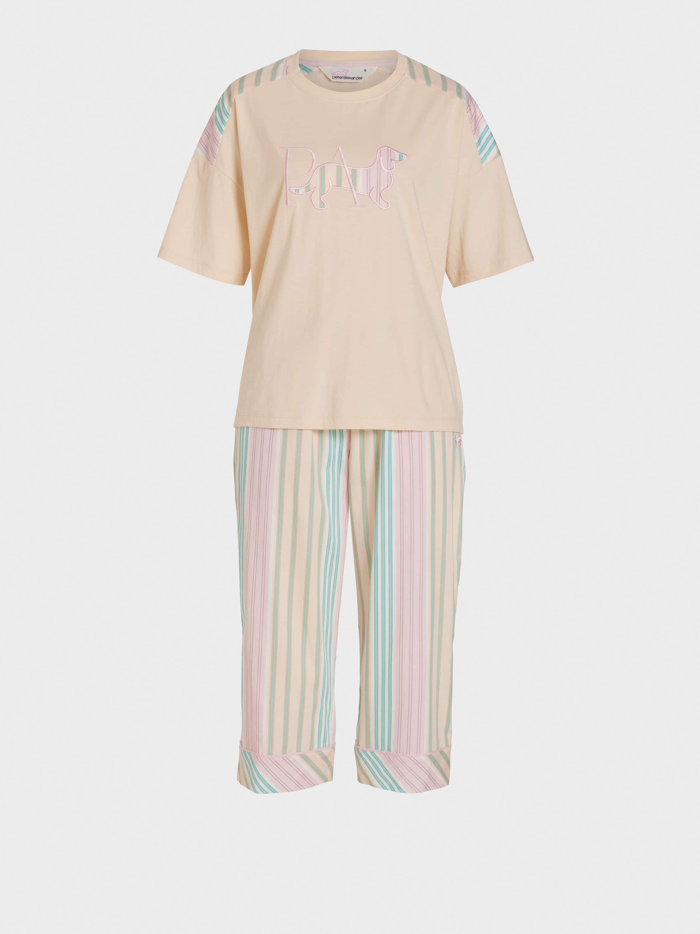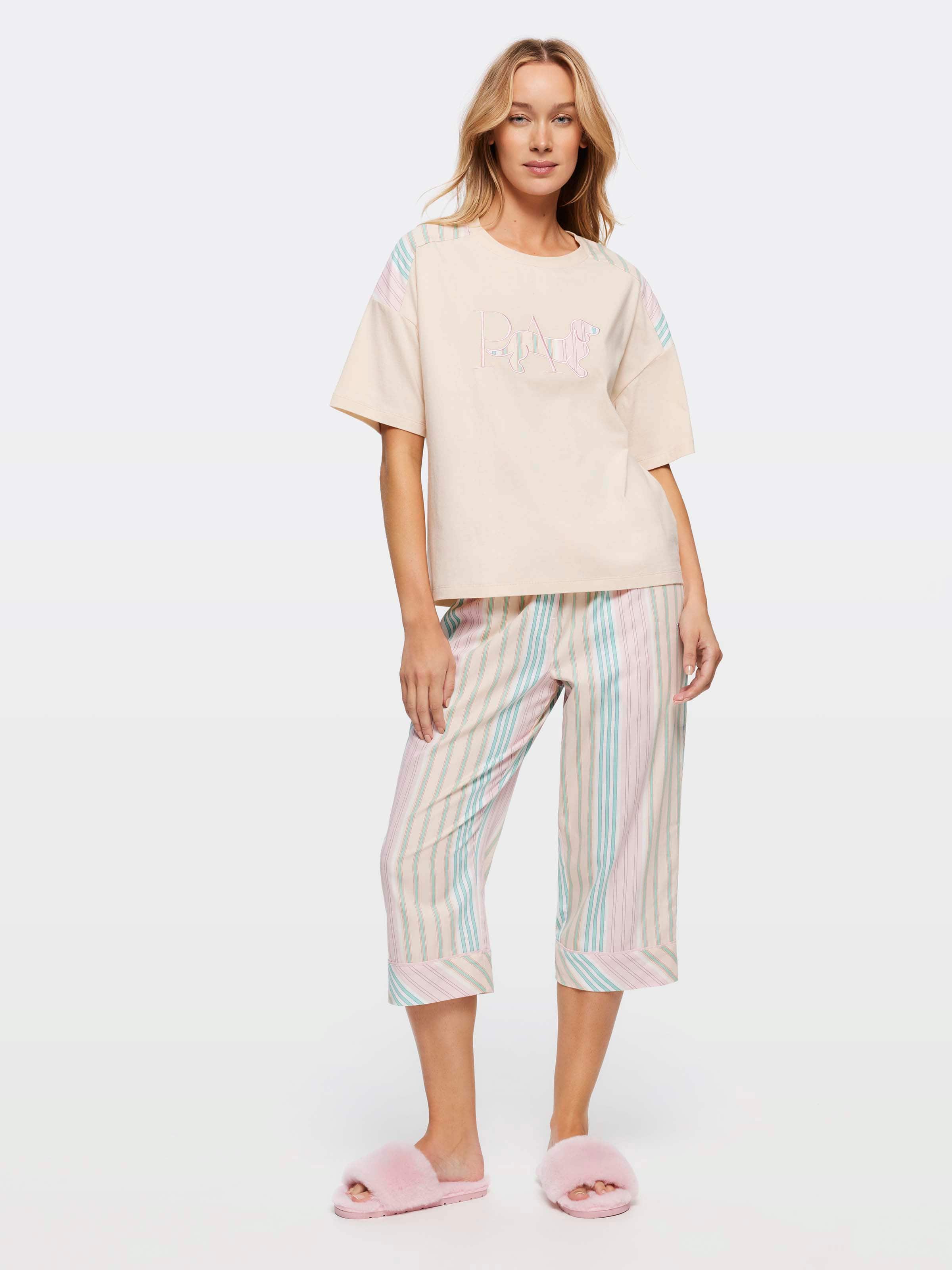 A quirky summer spin on a classic pastel stripe! This women's PJ set features an oversized contrast-print tee and matching pants, ideal for transition weather through the warmer months of the year. Complete with our iconic P.A. Penny logo, this set is perfectly packaged in a gift box and ready to pop straight under the Christmas tree!