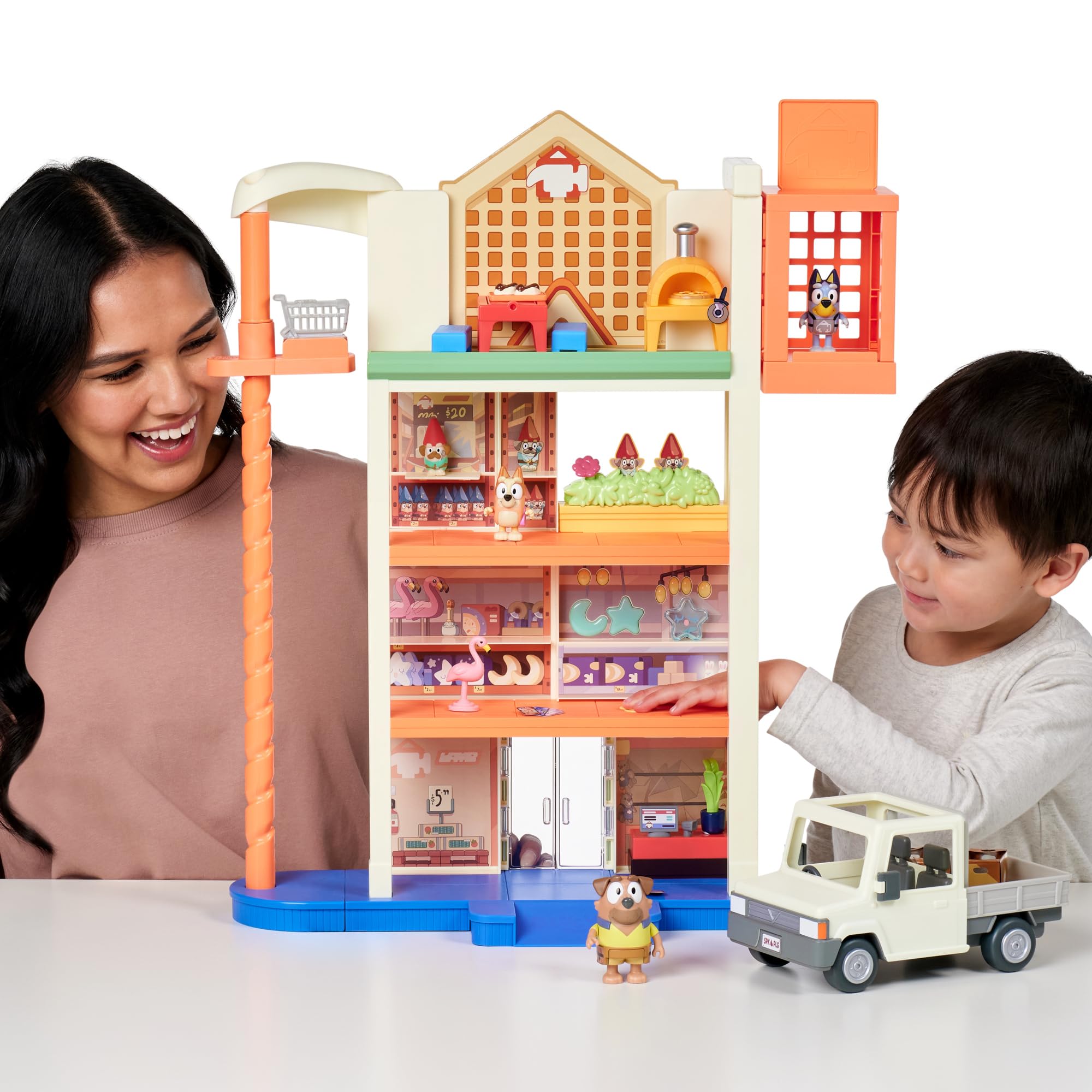 - Comes with Bluey figure dressed as a Hammerbarn store assistant, Bingo and Tradie 2.5-3" figures.