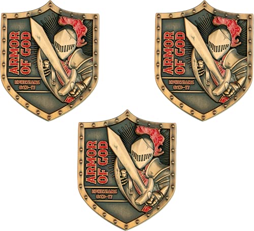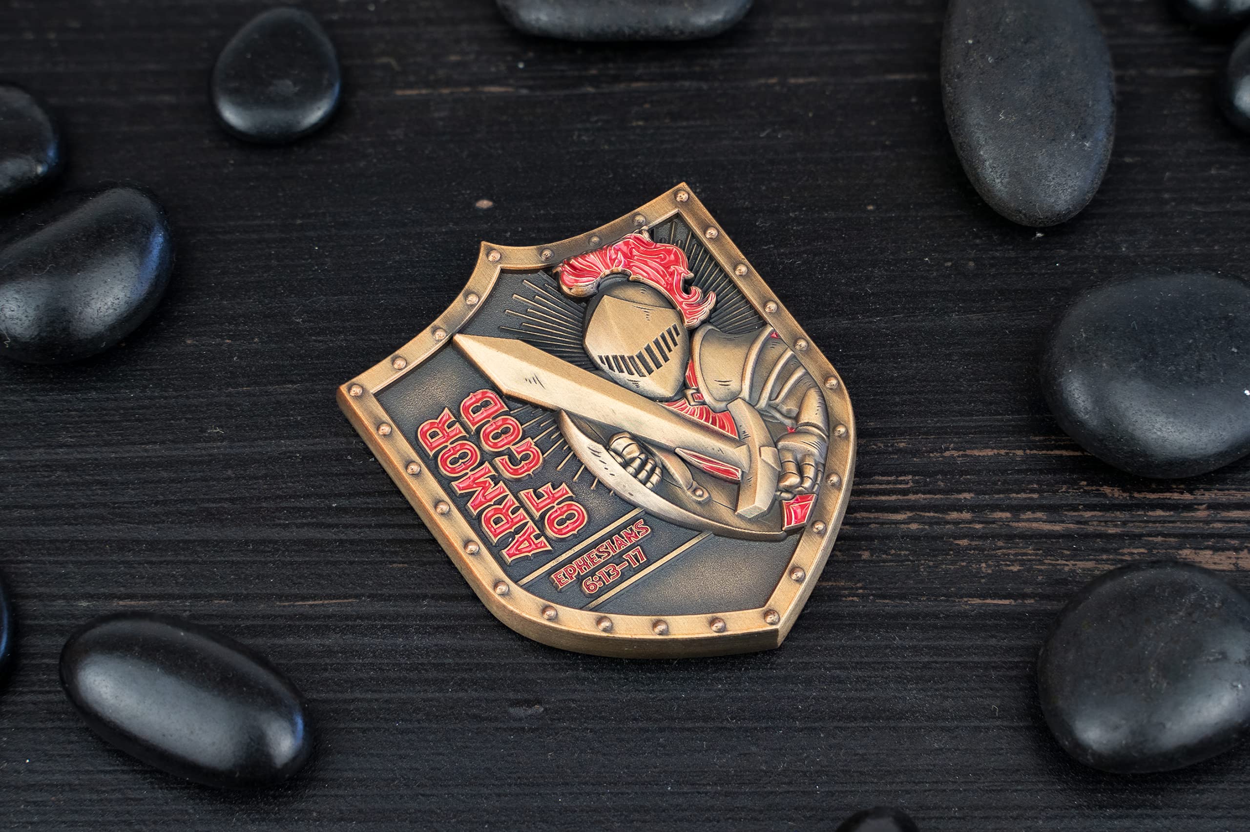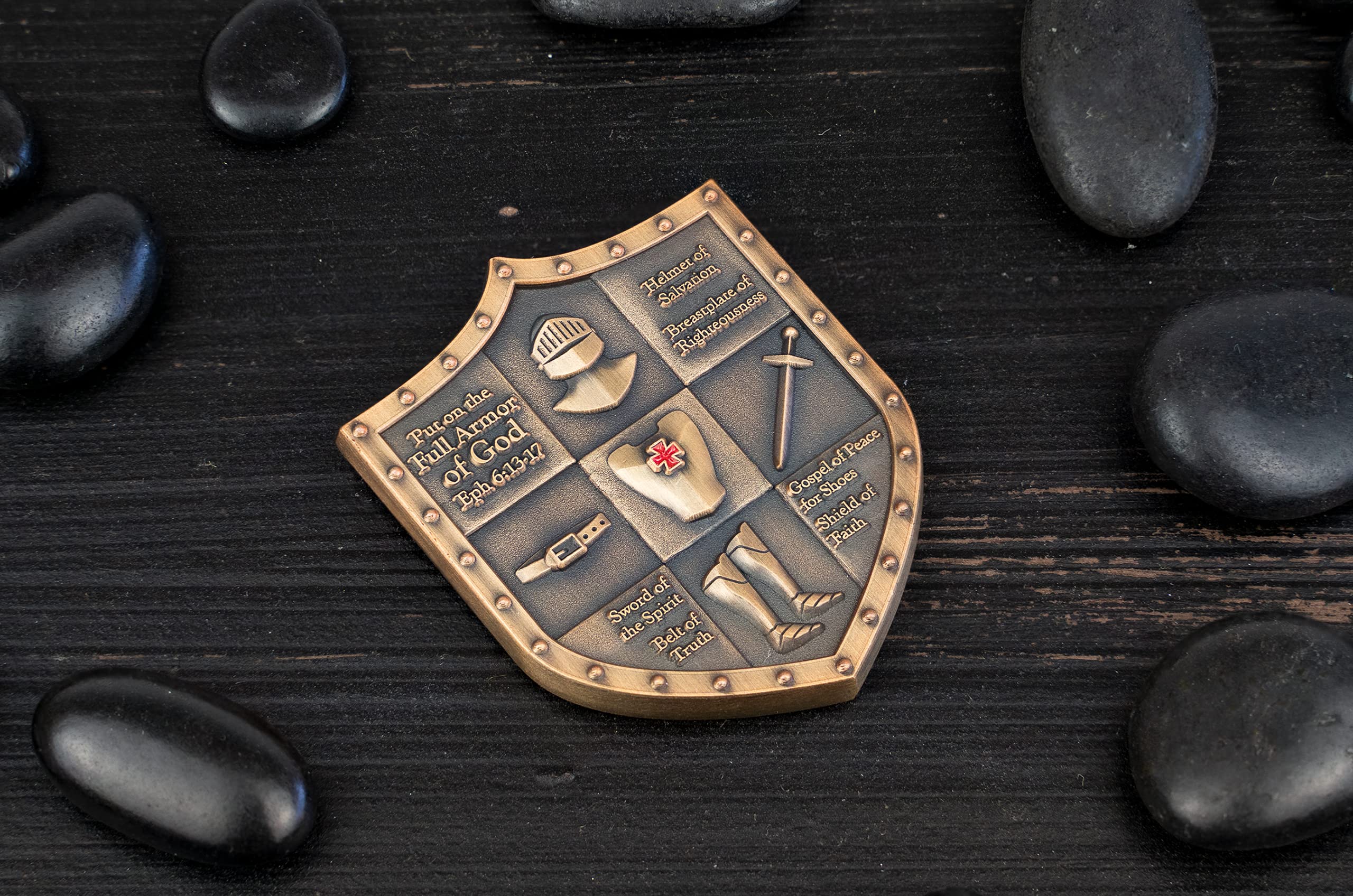 - GOLD PLATED COLLECTIBLE COMMEMORATIVE KEEPSAKE: This Armor of God Shield makes a great gift of strength for military personnel, soldiers, active duty, and veterans - a perfect religious challenge coin to serve as a reminder of faith. Great to keep in a pocket, purse, or backpack to carry with you wherever you go, or put it on display on any table or desktop.