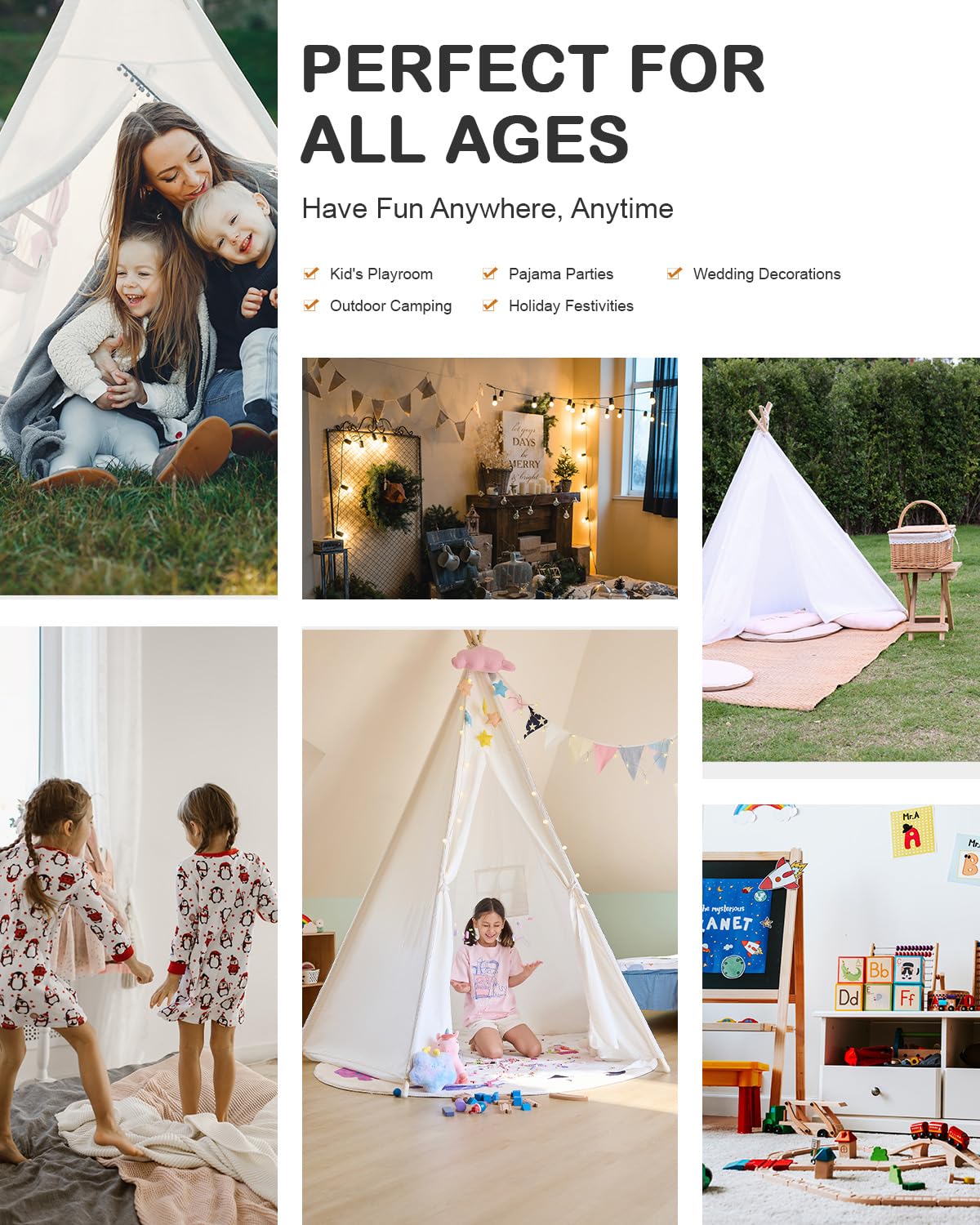 - Accommodate 3 Kids ----- Measured at 49u201d x 49u201d x 85u201d, this cute kids teepee can accommodate at least 3 kids to play at the same time, making a great hangout place for your kids and their friends.