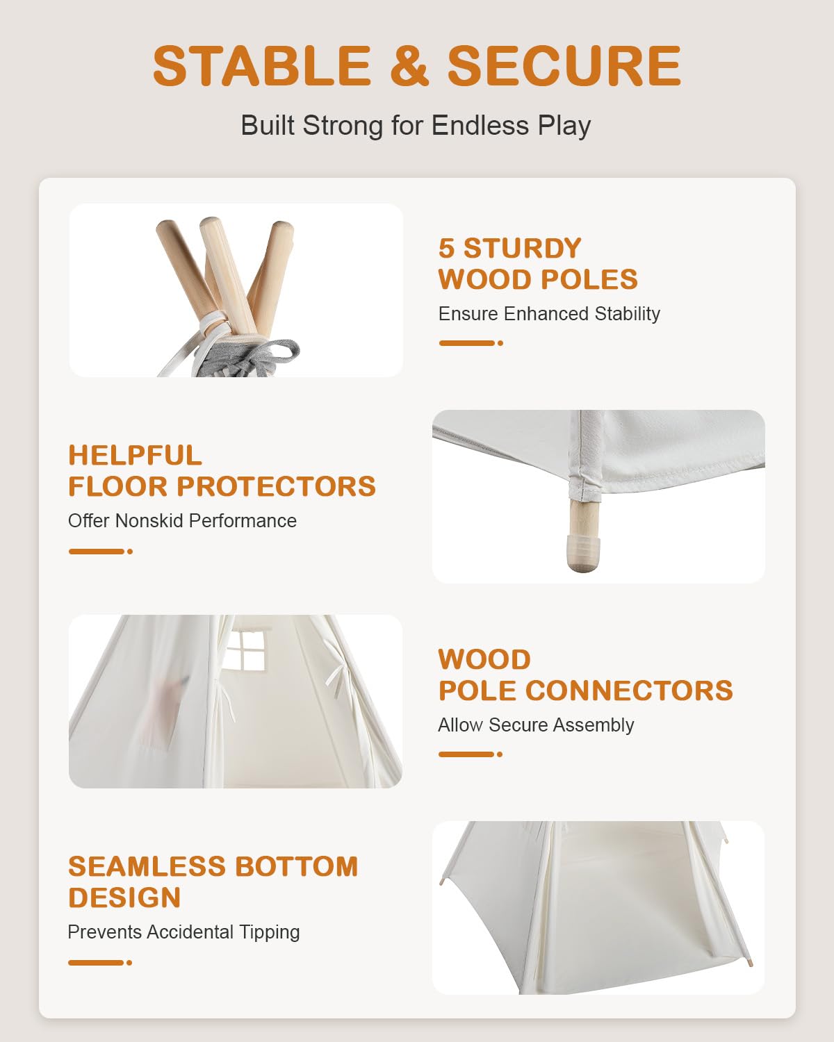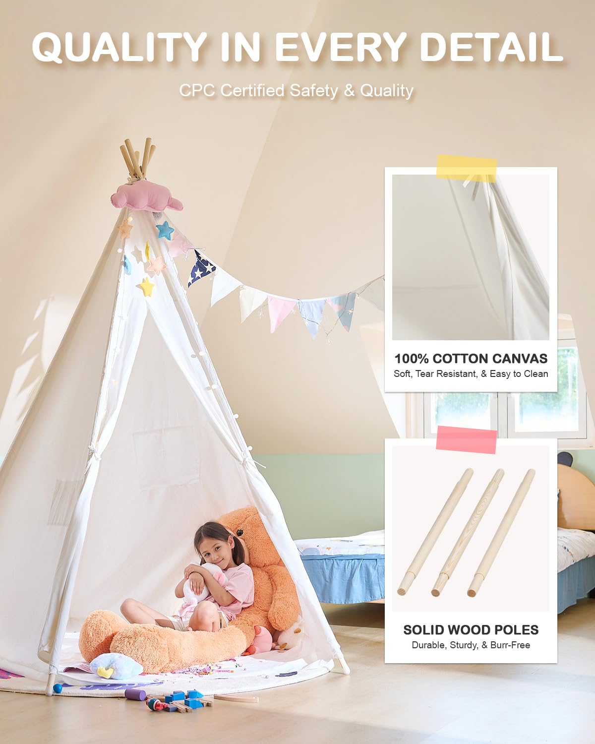- CPST Certificated for Safety ----- CPST certificated for childrenu2019s safety; 100% chemical-free & odorless cotton cloths construction safeguards kidsu2019 health and keeps inner environment breathable; sturdy pine wood poles support this teepee with optimal stability.