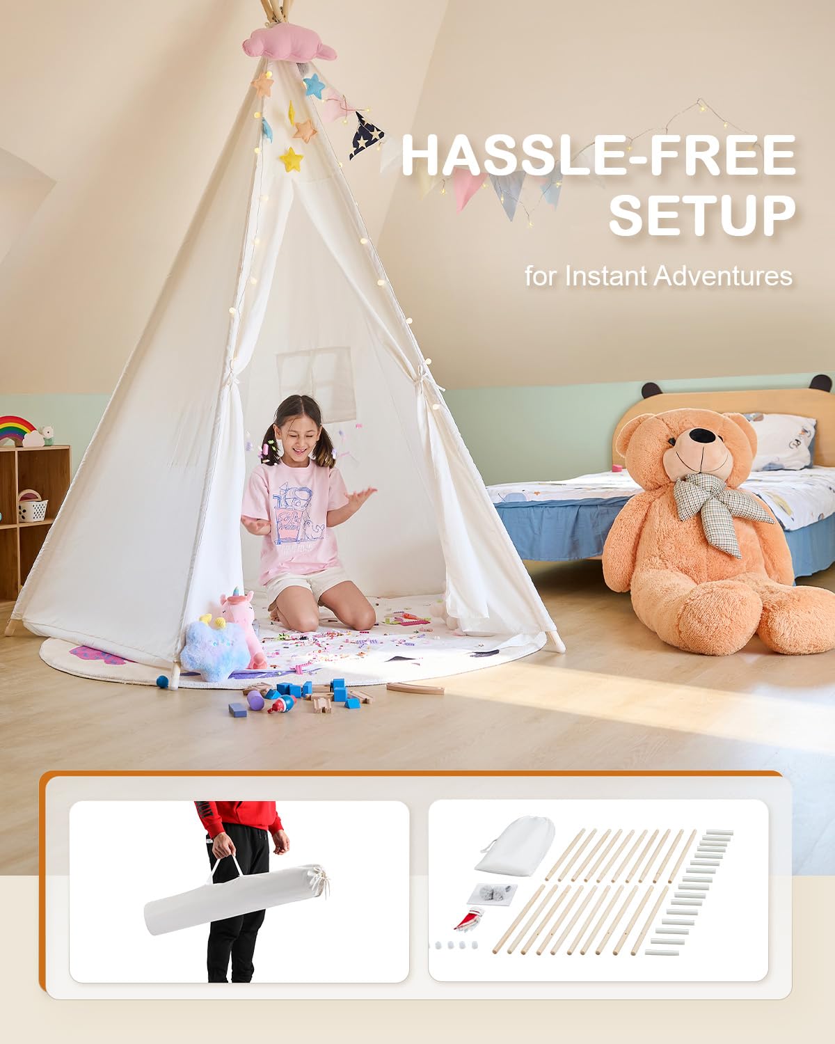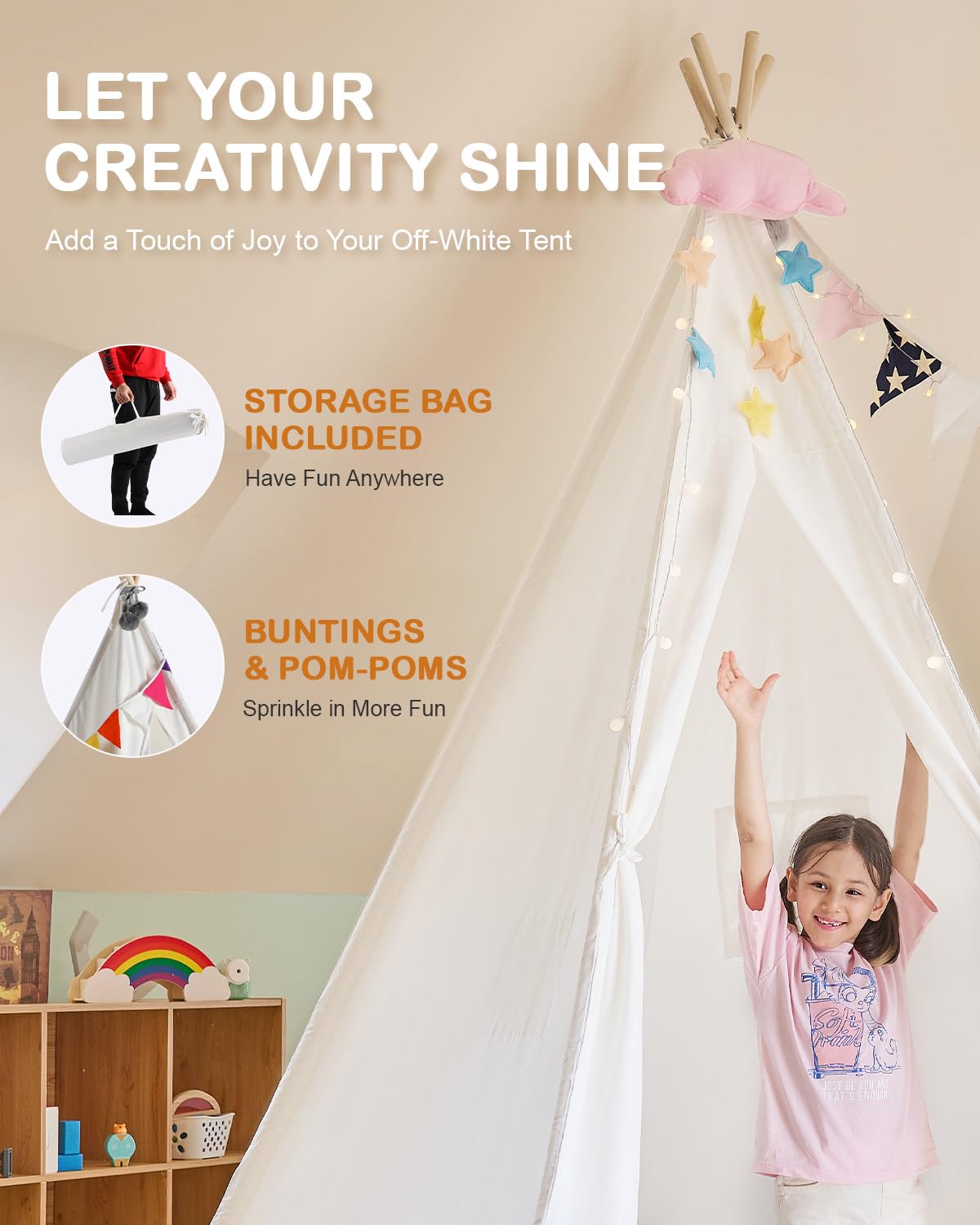 - Unleash Your Kids Imagination ----- White surface allows your kids to paint whatever they like on the teepee, turning this play tent into a magical and lovable castle with their imagination and creativity; complimentary burgees and fur balls add more fun to this item.