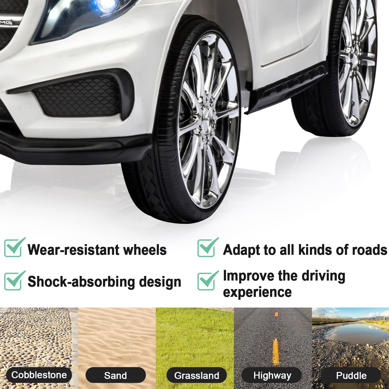 - u3010More Safetyu3011 We deliberately add handrails beside the seat and an adjustable safety belt with a buckle to prevent your child from falling off,15-inch weels make driving more stable, can run smoothly on a variety of pavements, such as grassland, sandy beach, road etc, ideal for outdoor playing. Parental remote control & seat belt offer maximum safety for your kids.