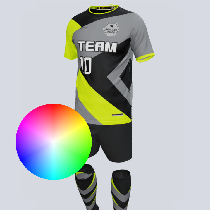 "Unleash the speed of style with our Custom 'Nitro' soccer uniform set! This high-octane ensemble is fully customizable, allowing you to revamp your team, club, or school's look with a design that sets pulses racing. Trust that your investment in this turbocharged custom soccer uniform will ignite team spirit like never before. Create a design that is truly your own and accelerate your team's presence on the field. With customizable jerseys and socks, you'll leave your opponents in awe as you zoom past them. Thanks to advanced moisture-wicking technology, you can trust that this uniform will keep you cool under pressure. Strap in, fuel up, and gear up to conquer the game in blazing style!"