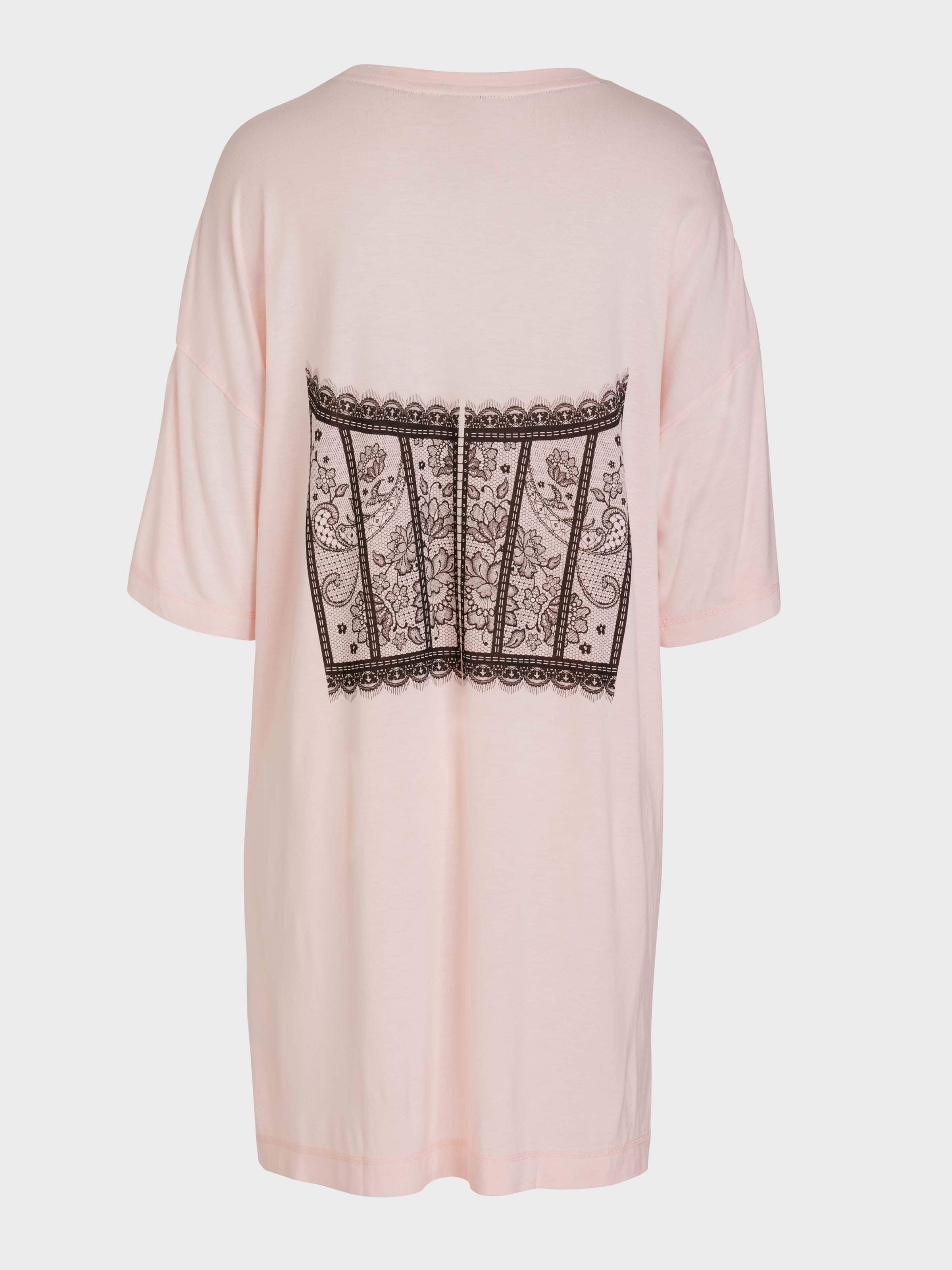 Ooh la la! This fashion style nightie is perfect for a night in or out of bed. A pale pink sleep tee with a twist- the black lace corset print takes this statement piece from simple to stylish.?