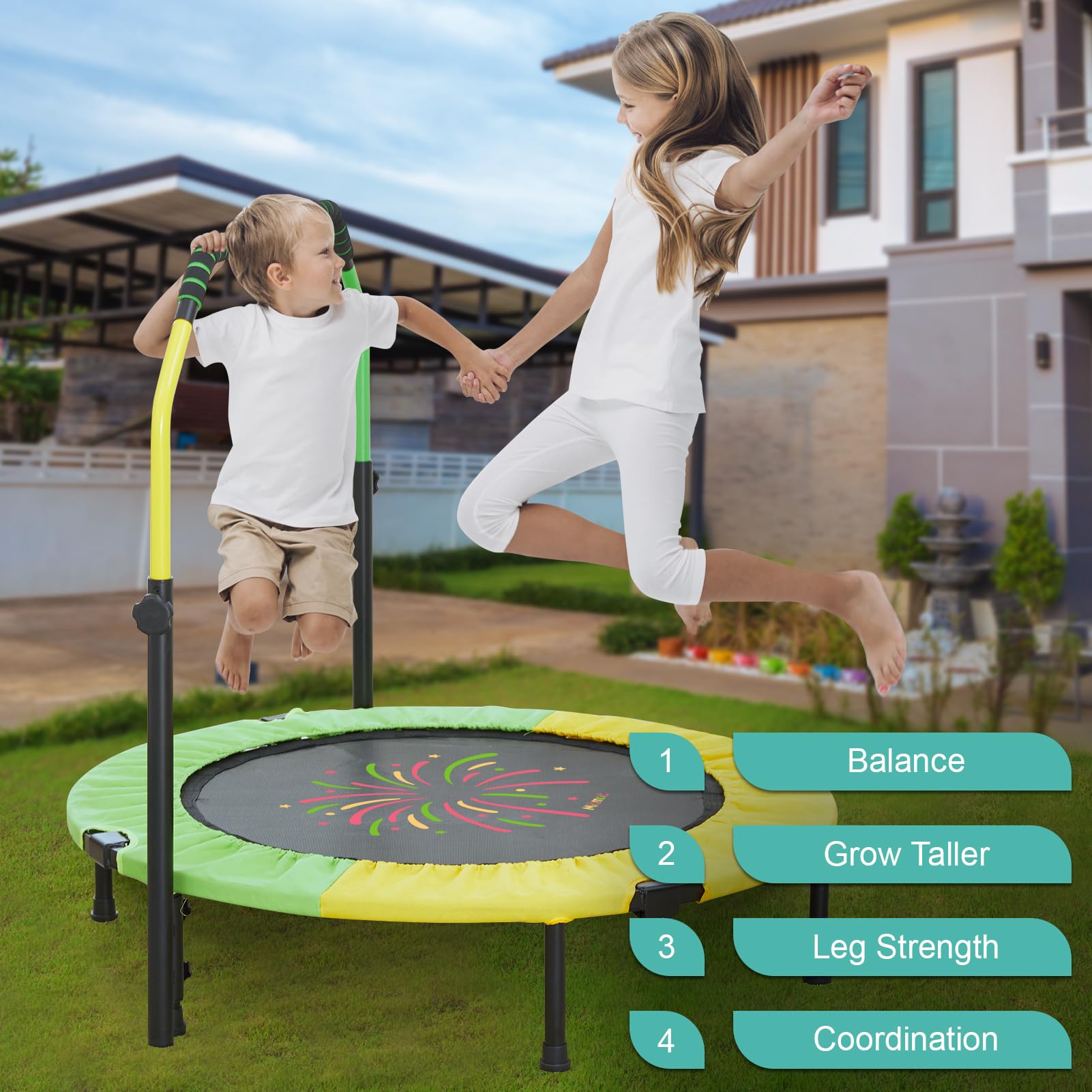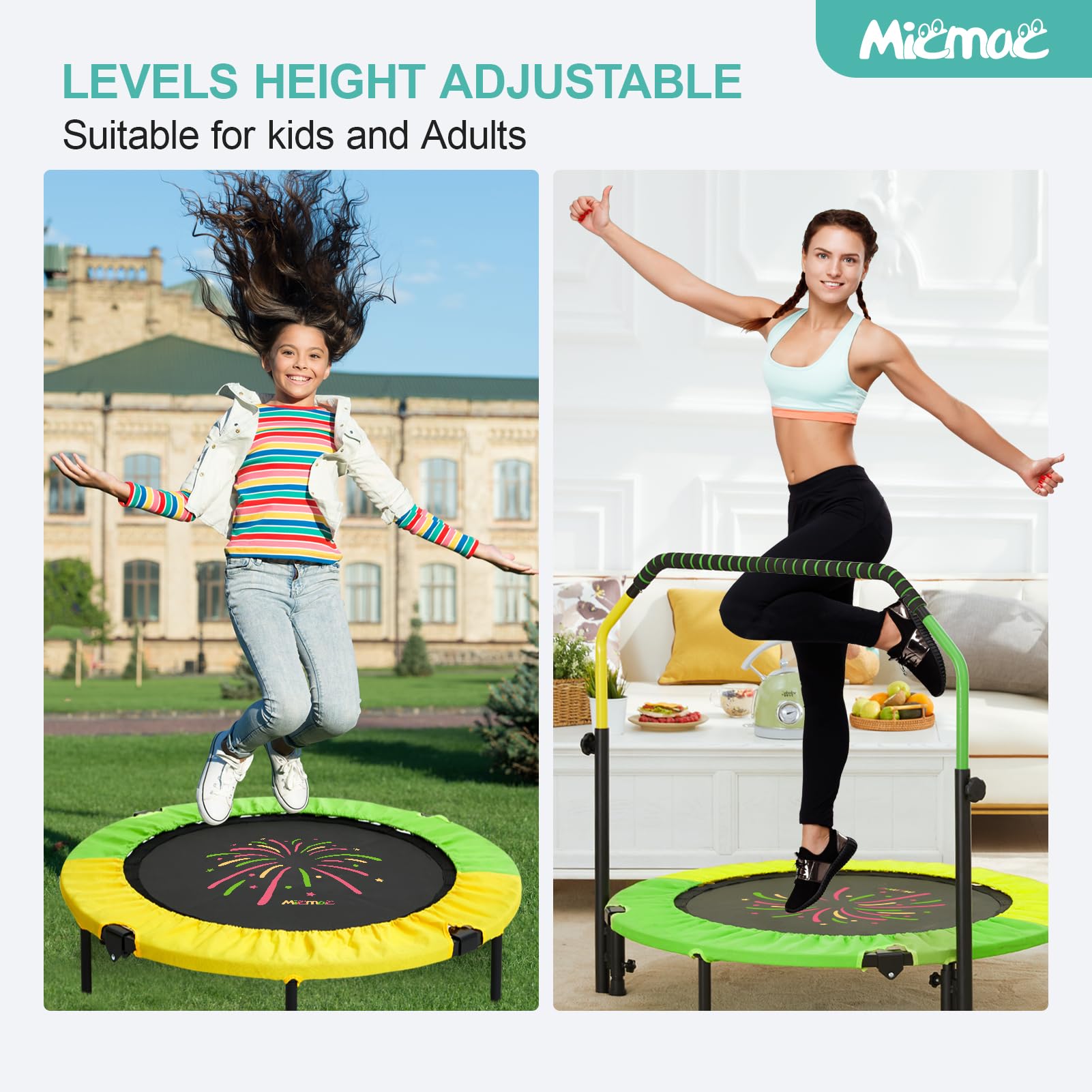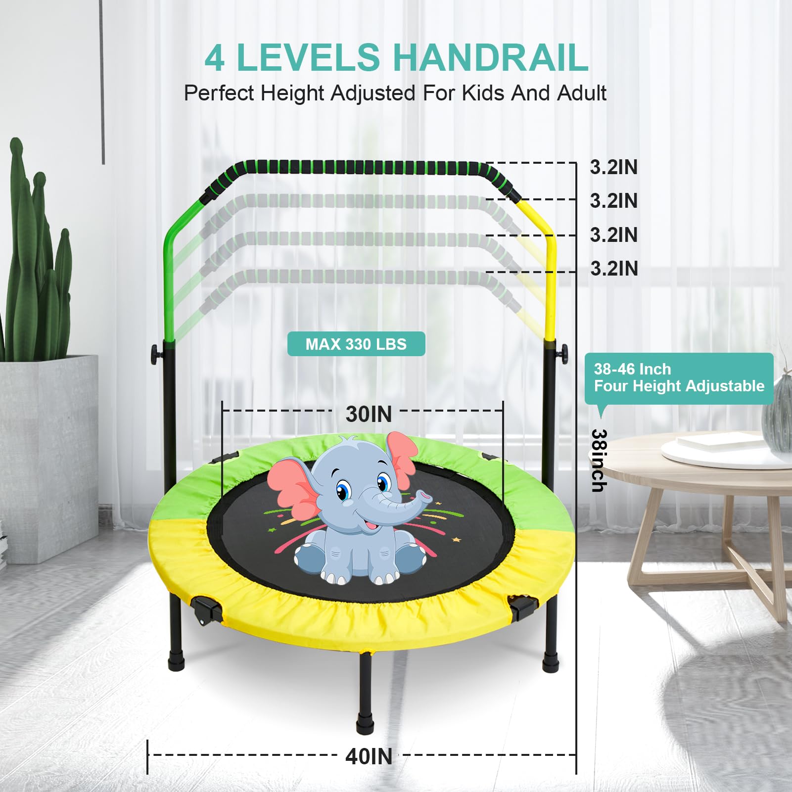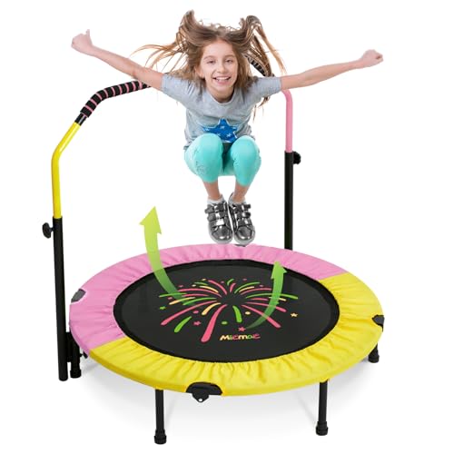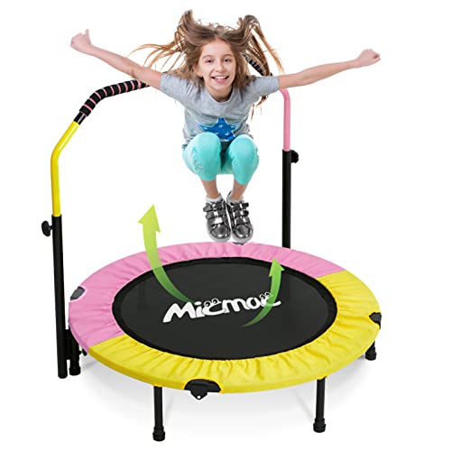 - ud83dudca6u3010Adjustable Handle Heightu3011Our rebounder trampoline for kids with a detachable handle prevents kids from falling. it also can be adjusted up and down, height adjustable from 38" to 46", which is suitable for kids of various hight.