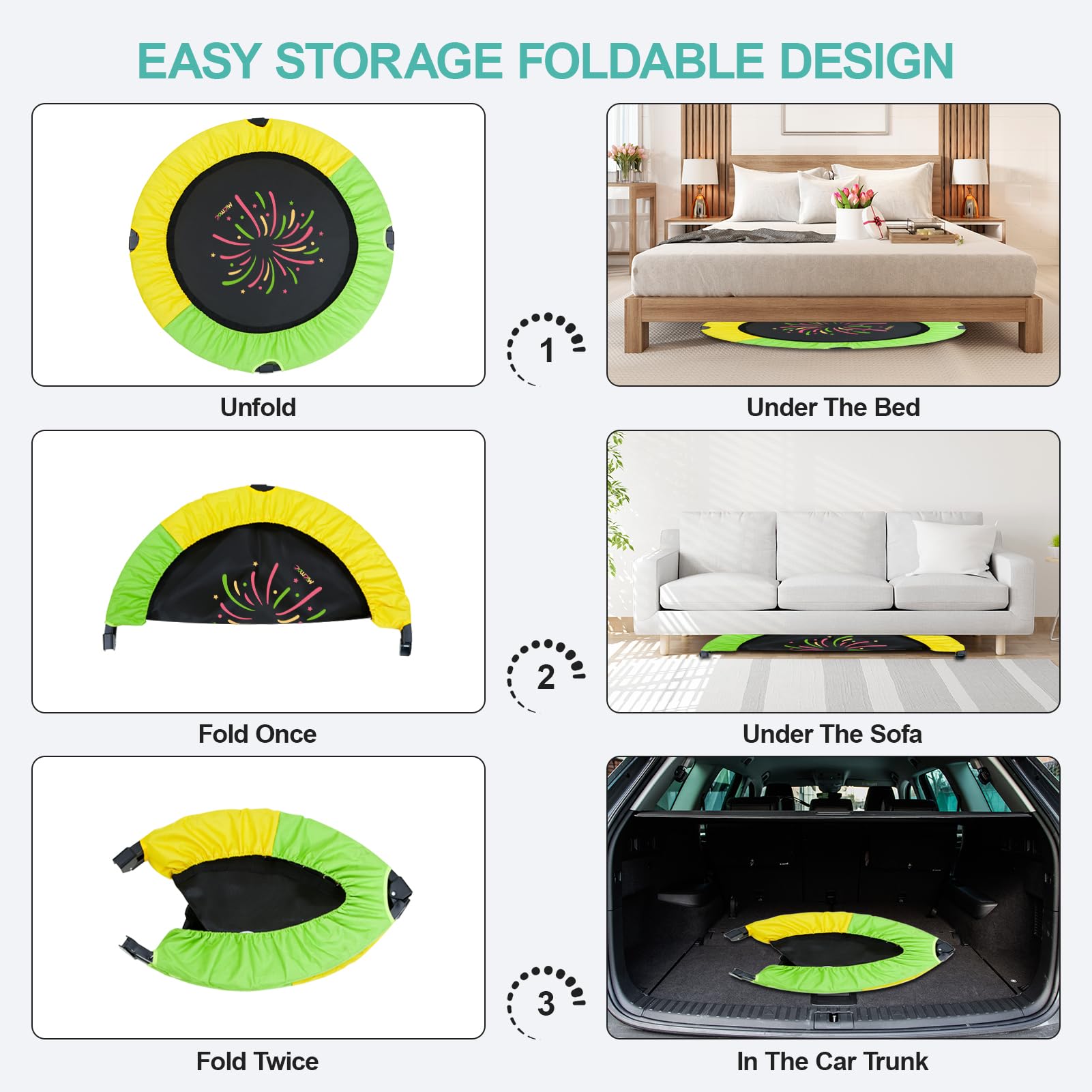 - ud83cudf1eu3010Easy to Assemble & Storeu3011No tools are required, mini trampoline for toddlers can be easily assembled or disassembled in less than 10 minutes. it can easily fold into the car and carry outdoor, a good outdoor trampoline for kids at a picnic or parade.