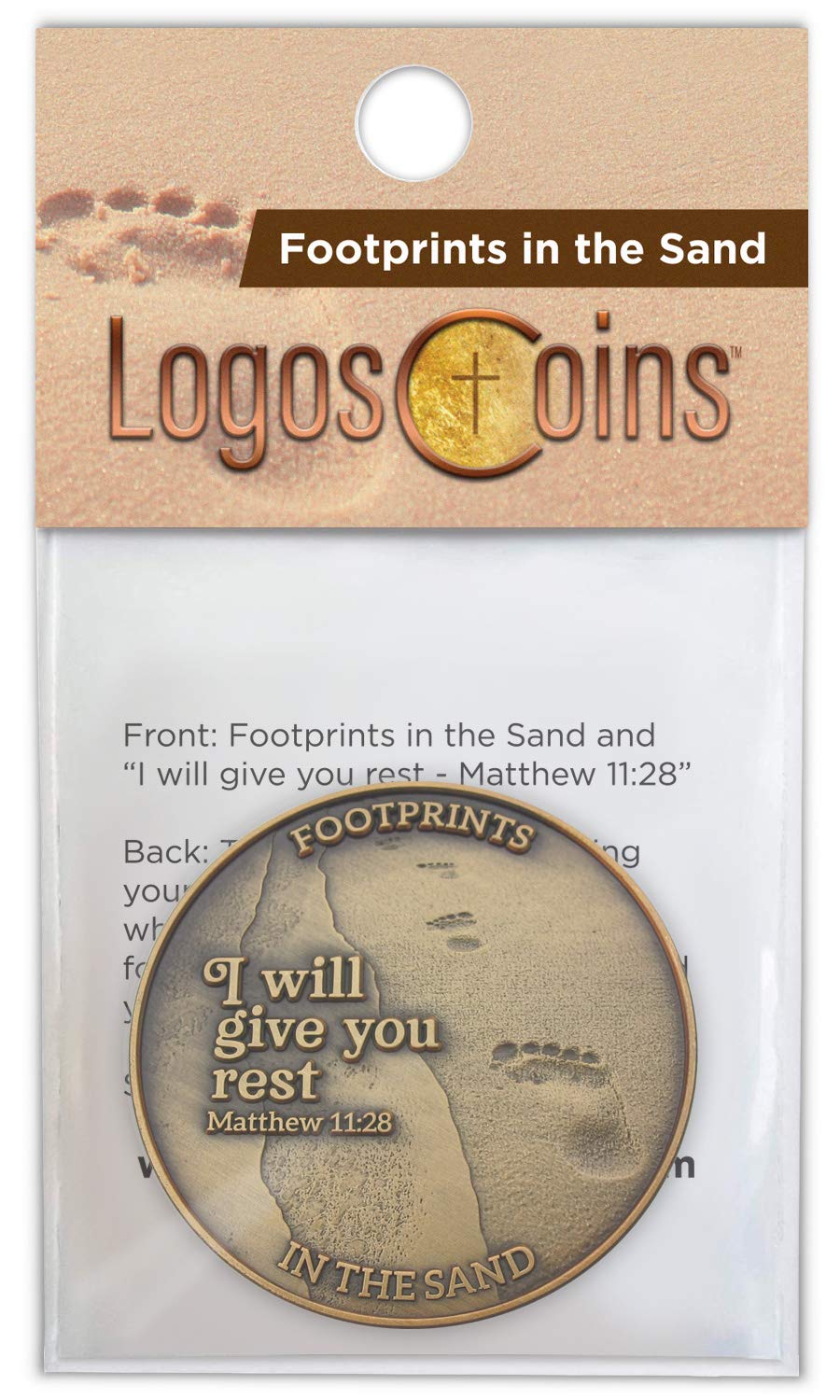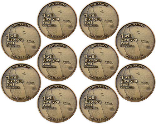 - IT WAS THEN THAT I CARRIED YOU COIN WITH BIBLE VERSE: Bulk Pack of 10 coins. Front: Line of footprints, with text "Footprints in The Sand" / "I will give you rest. Matthew 11:28". Back: Three crosses with text "During your times of trial and suffering, when you see only one set of footprints, it was then that I carried you." Size: 1.75" diameter, 4 millimeters thick