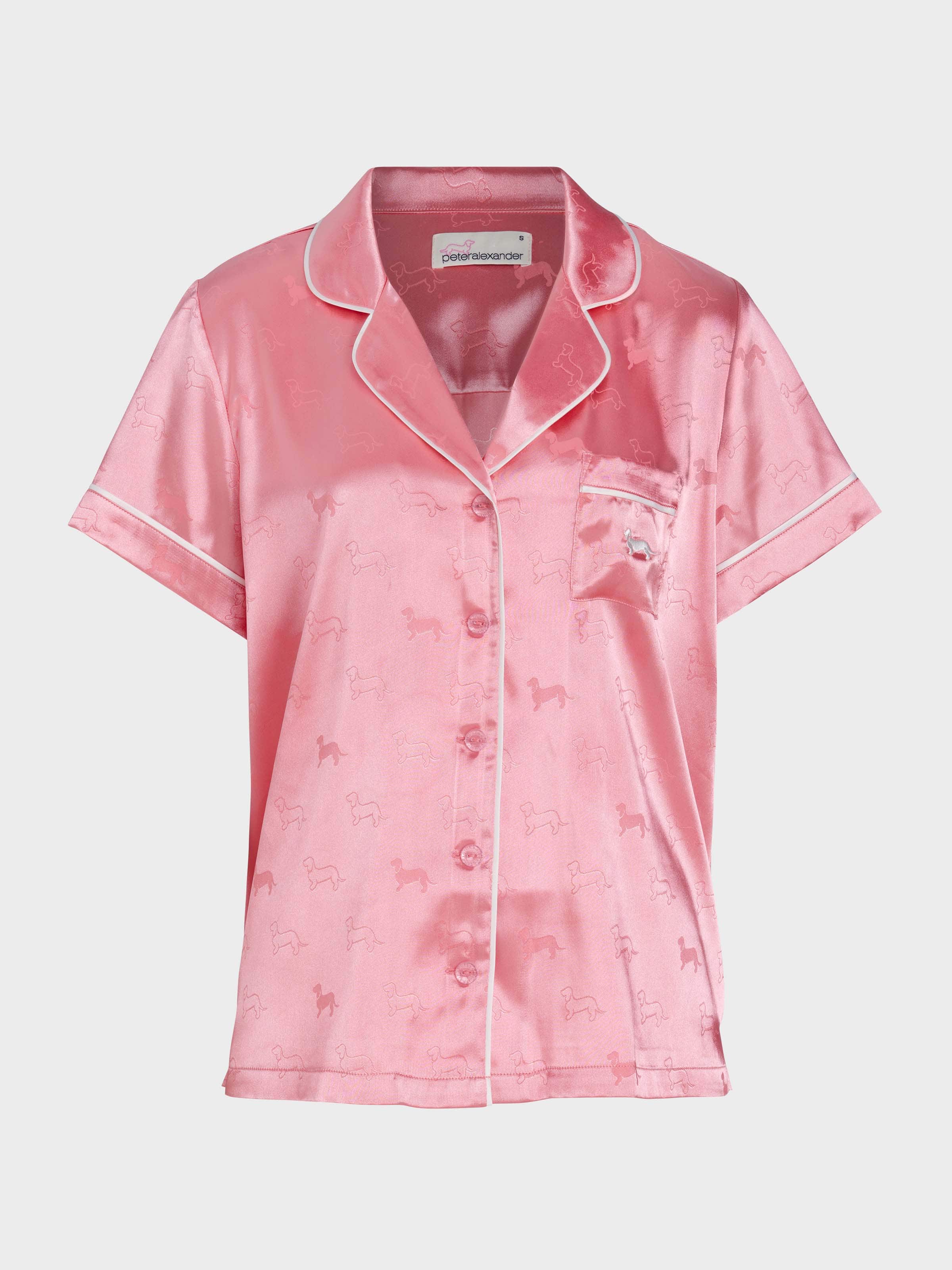 Look effortlessly stylish in this satin short sleeve shirt, featuring all over jacquard penny dogs on your favourite silky style. Pair it with matching tux luxe satin shorts to create a paw-some PJ combo.