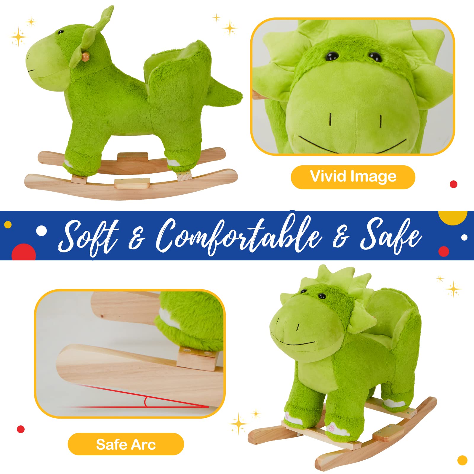 - CALMING OR PLAYFUL: Built on a sturdy wood base reinforced by screws, and covered with a soft plush cover that your child will love, this dinosaur rocking horse is both comfortable and durable. Smooth rolling wood and handlebars help your child with movement and balance when they are in a playful mood, while the soothing rocking function of the chair can help calm them after a long day of play.