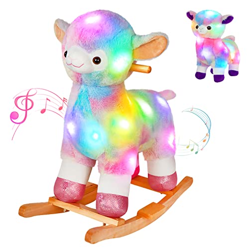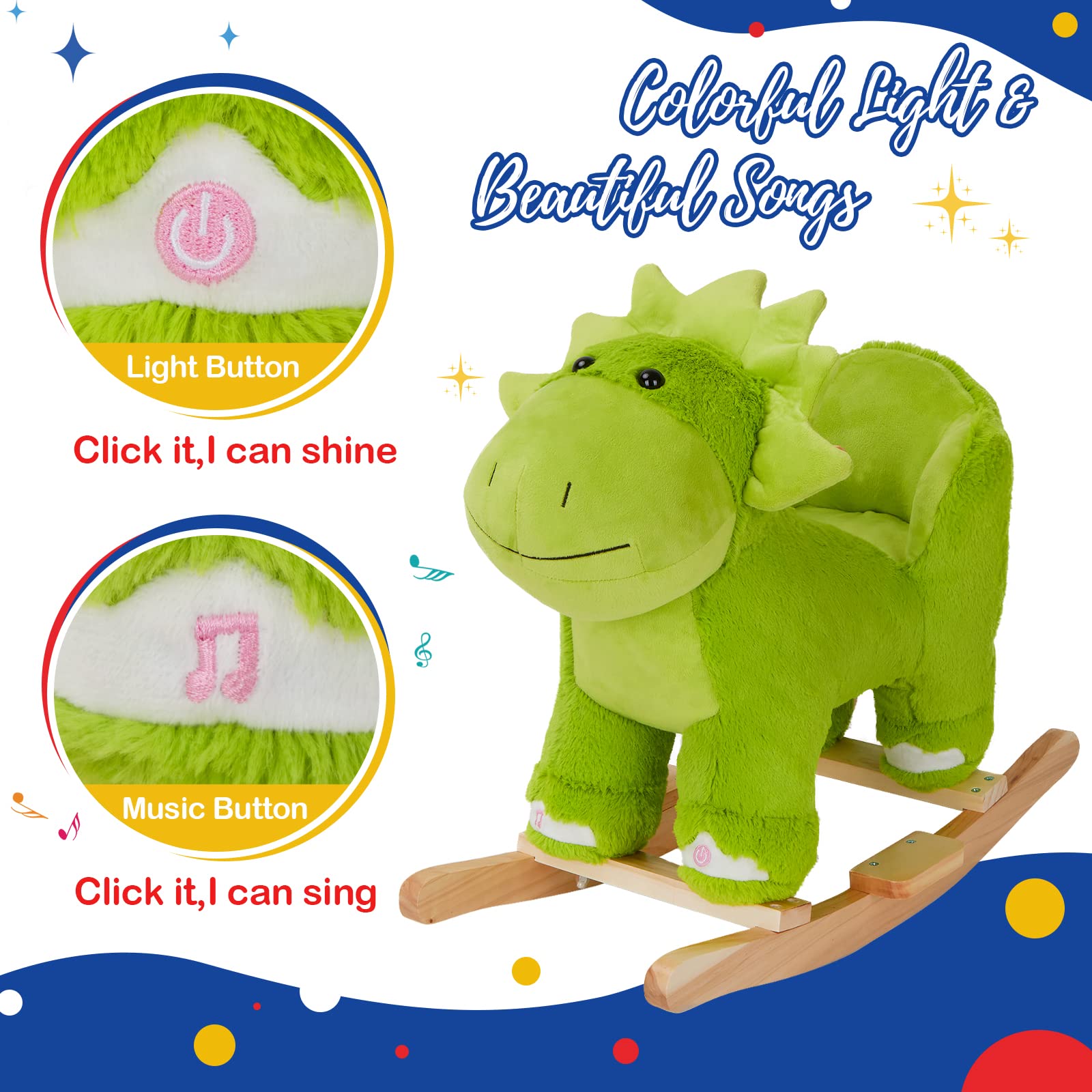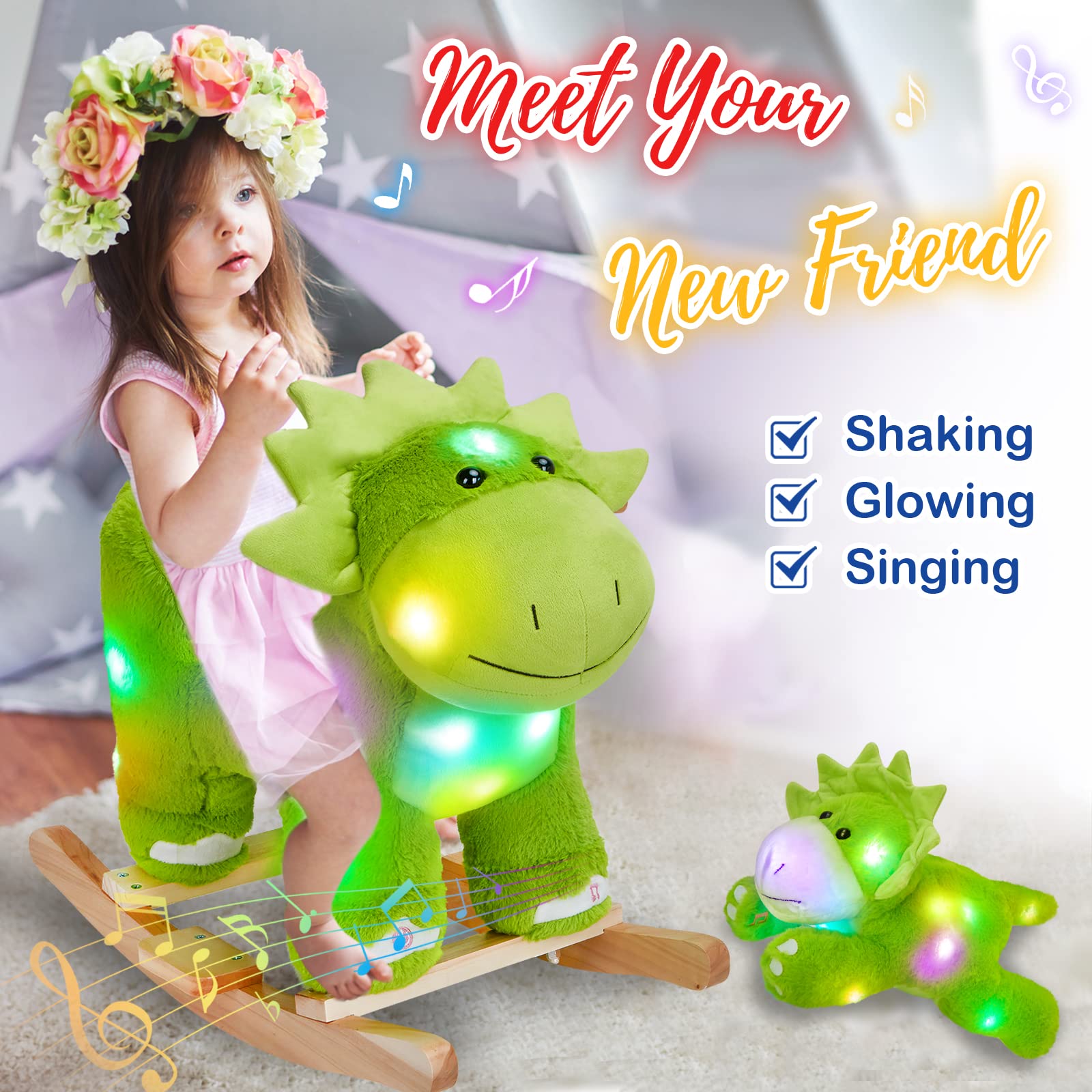 - GLOWING & SINGING: This rocking dinosaur is installed with electronic devices inside. Simply press the light button, and it will give out colorful lights. Simply press the music button, and it will sing lullabies or songs for your kids. Your little ones will enjoy hours with this wonderful plush rocking hours.uff08Batteries are not includeduff09