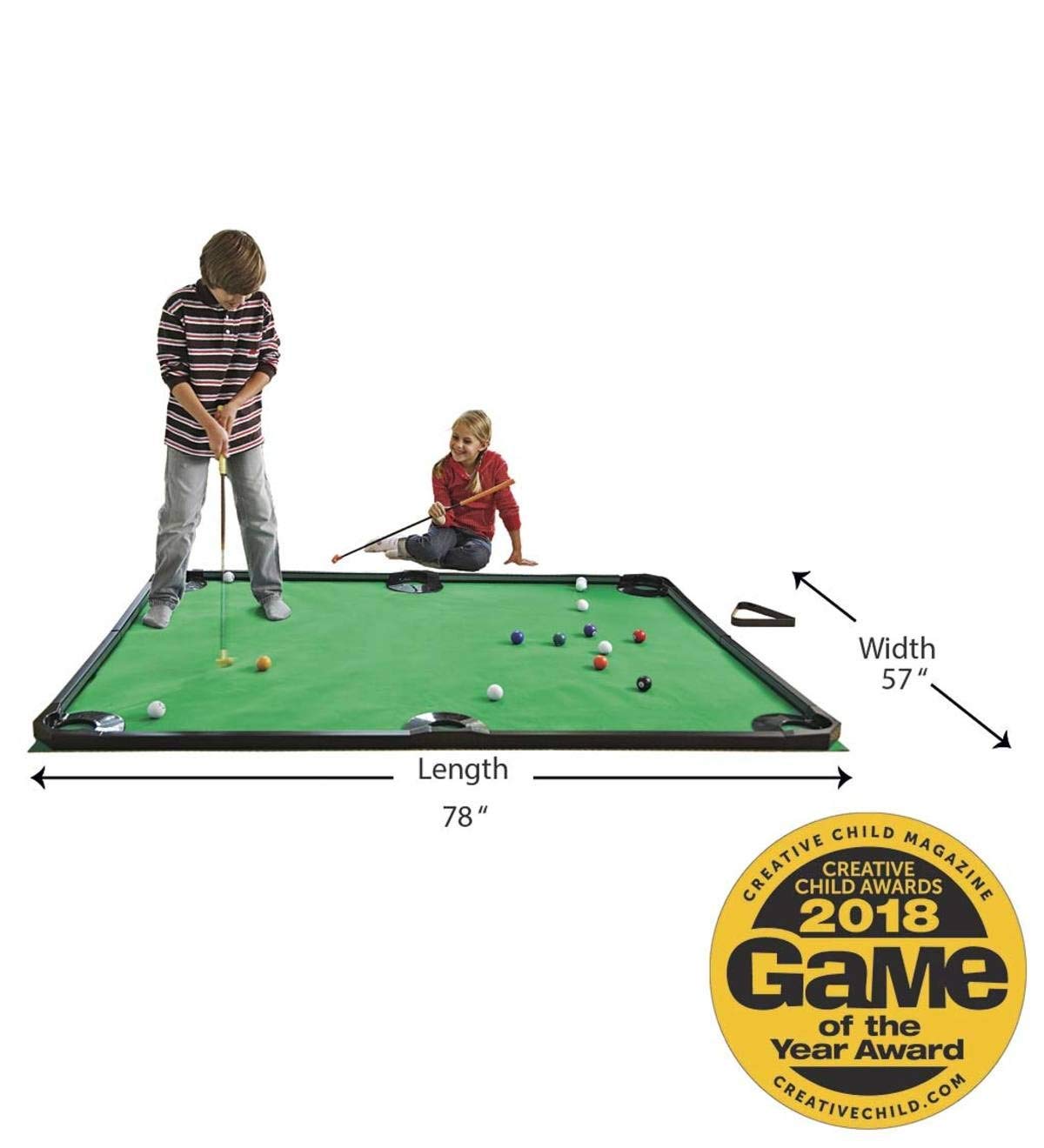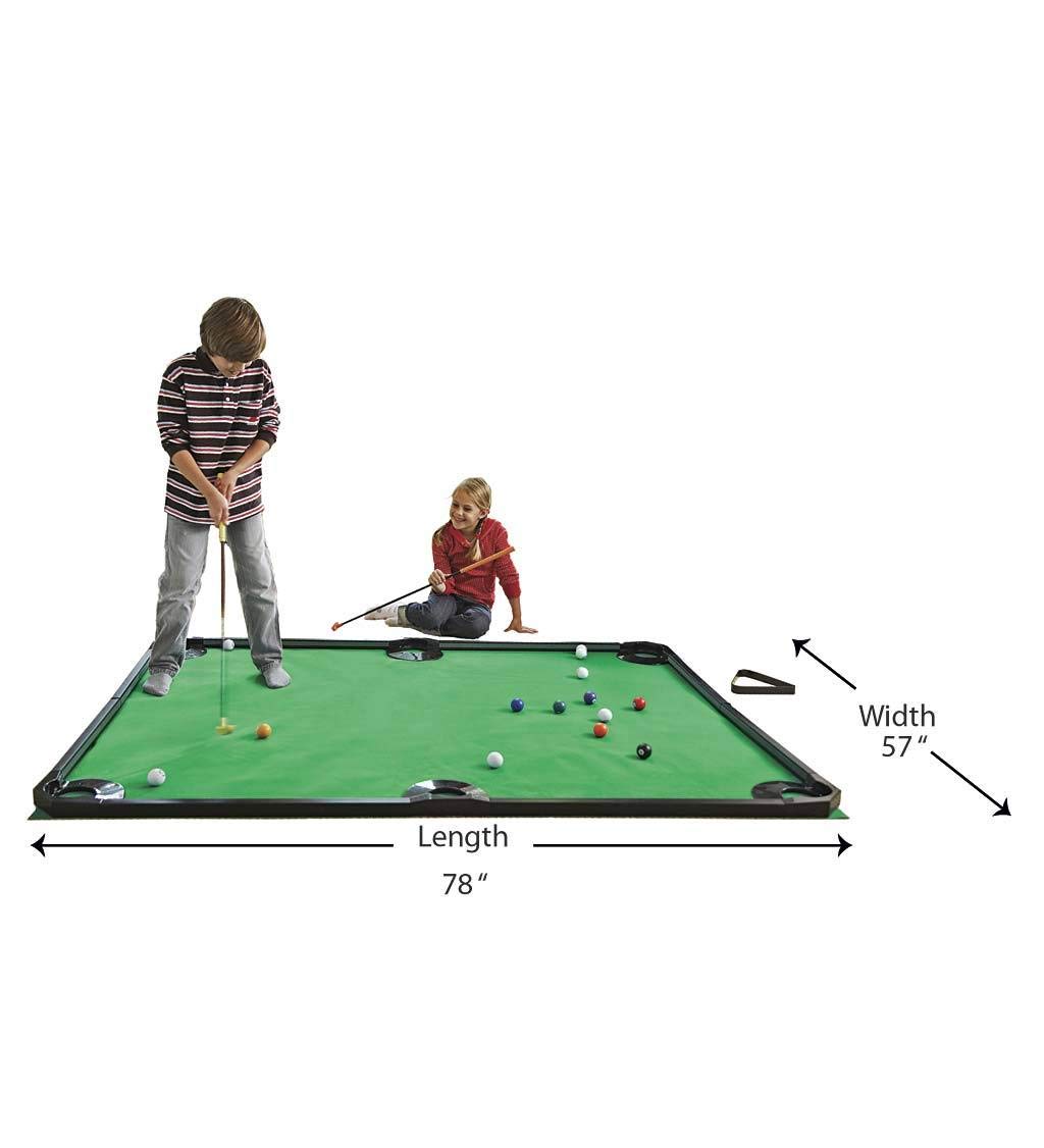 - CREATIVE WITH THE CUES: Our 78u201dL x 57u201dW game set includes a green mat to mimic bentgrass, rails to keep your 16 included billiards balls from rolling away, and 2 clubs for your golfing all-stars to use. Looking to increase the difficulty for your PGA protu00e9gu00e9? Youu2019ll find two wooden arches and ramps in your pool golf kit so you can add more challenging fun to your game!