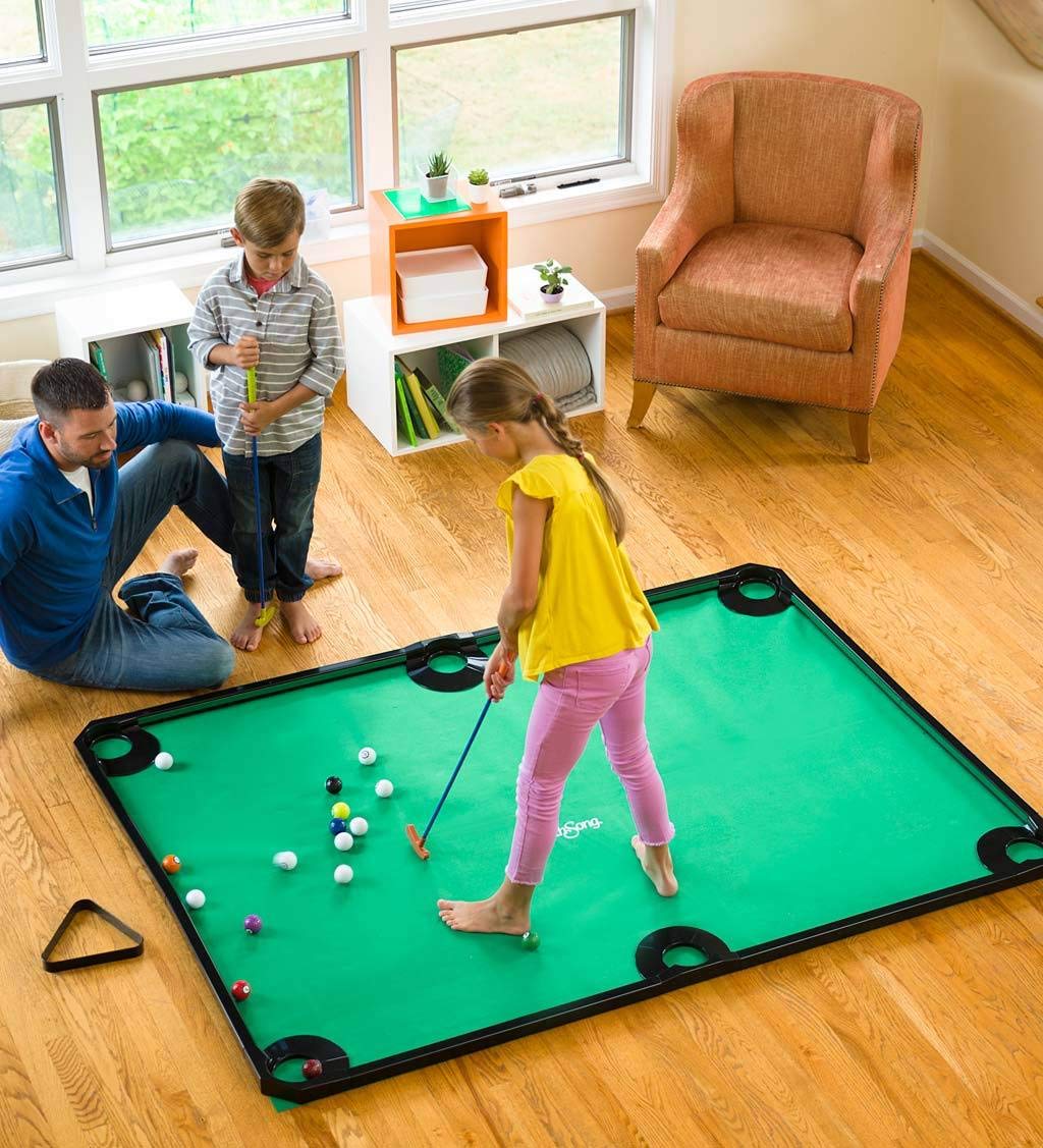 - SET UP Nu2019 SWING: With easy setup and storage, the Hearthsong Indoor Golf Pool Game is perfect for family game nights or fun party activities. The golf pool game comes in a compact size that can fit easily in most indoor spaces, and it can be assembled within minutes (so your little athletes wonu2019t need to wait too long to swing!) The boardu2019s design is also great for storing under beds or in bedroom closets, so you can enjoy terrific tourneys without taking up too much space in your home