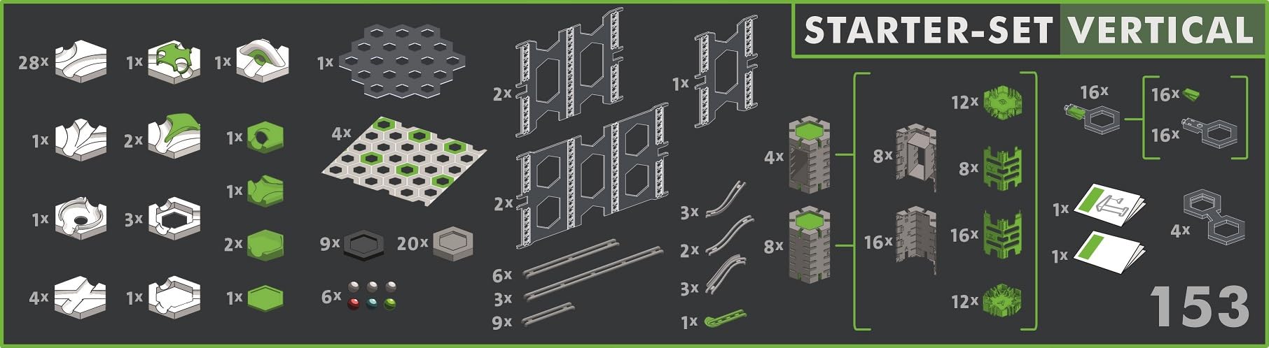 - [GraviTrax PRO: Starter-Set] Go vertical and raise your marble run to extreme heights with the u201cGraviTrax PRO Starter-Setu201d! This set includes 153 pieces to help build your marble run.