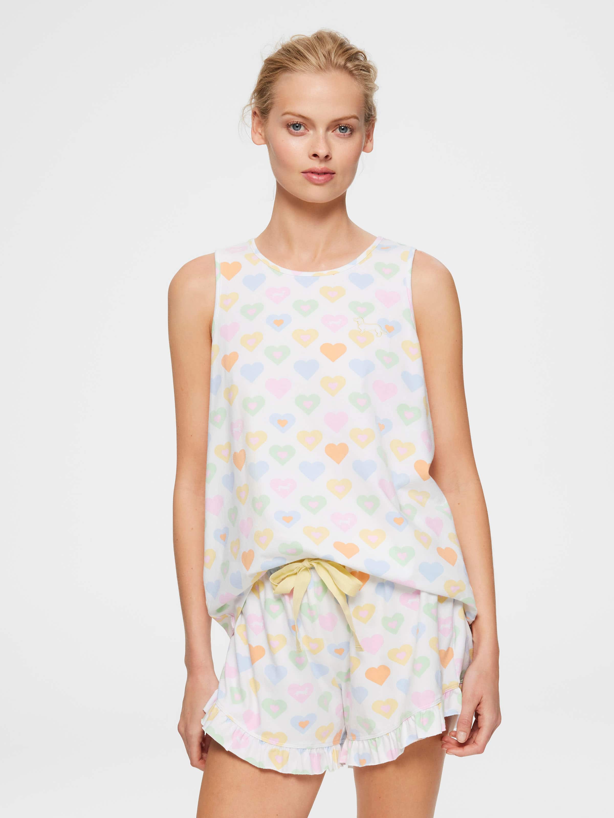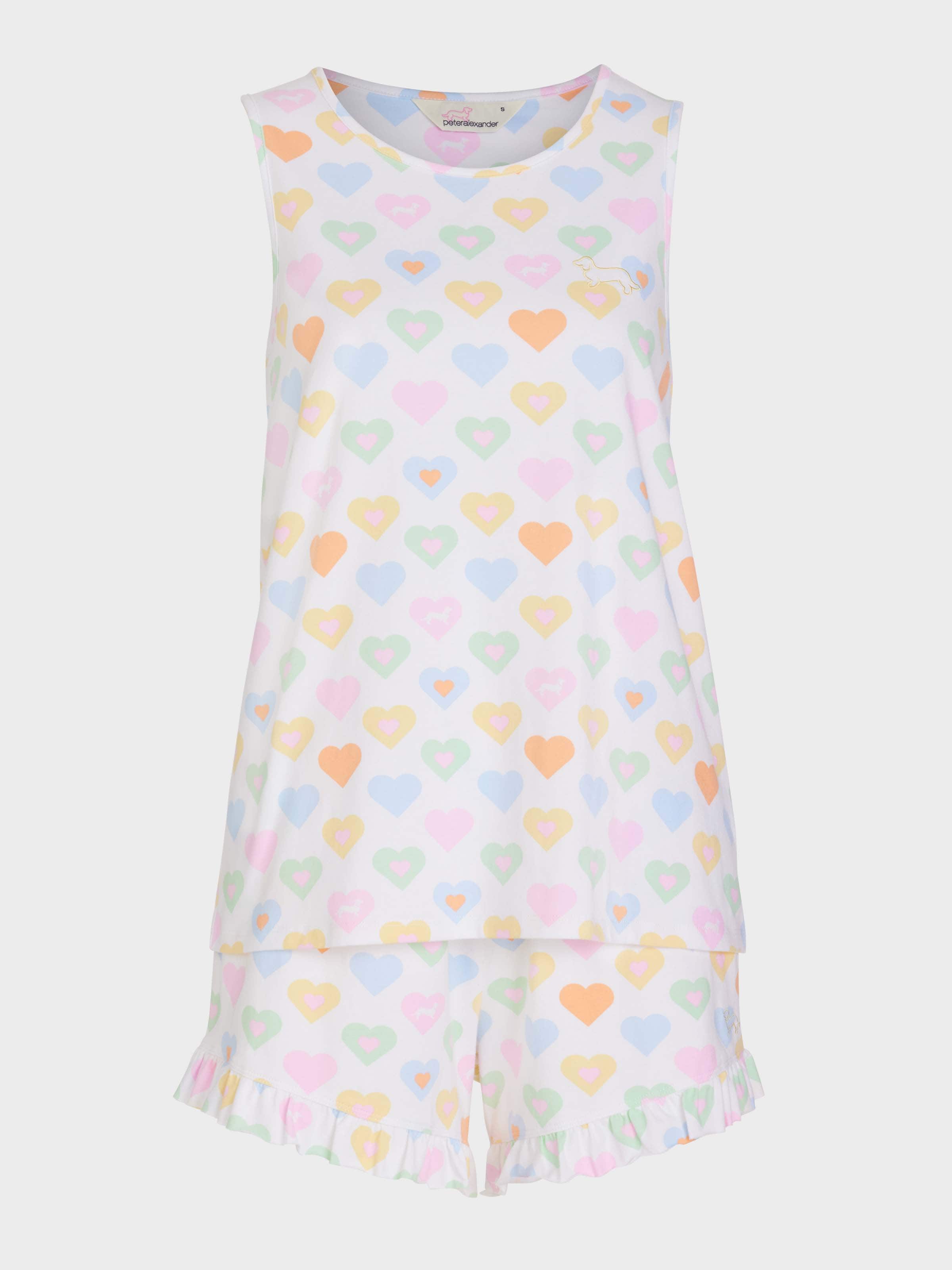 These PJs will be sure to melt your heart this summer. This adorable pyjama set features an all-over heart print on a flirty muscle tank and matching flutter shorts, a perfect gift for someone special - or even for yourself!