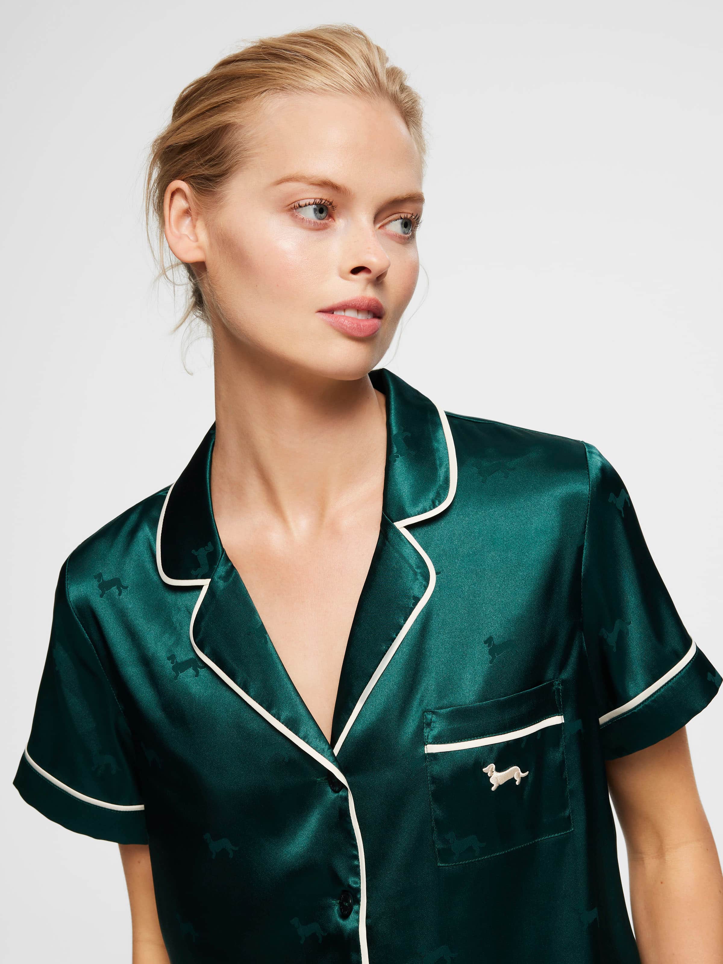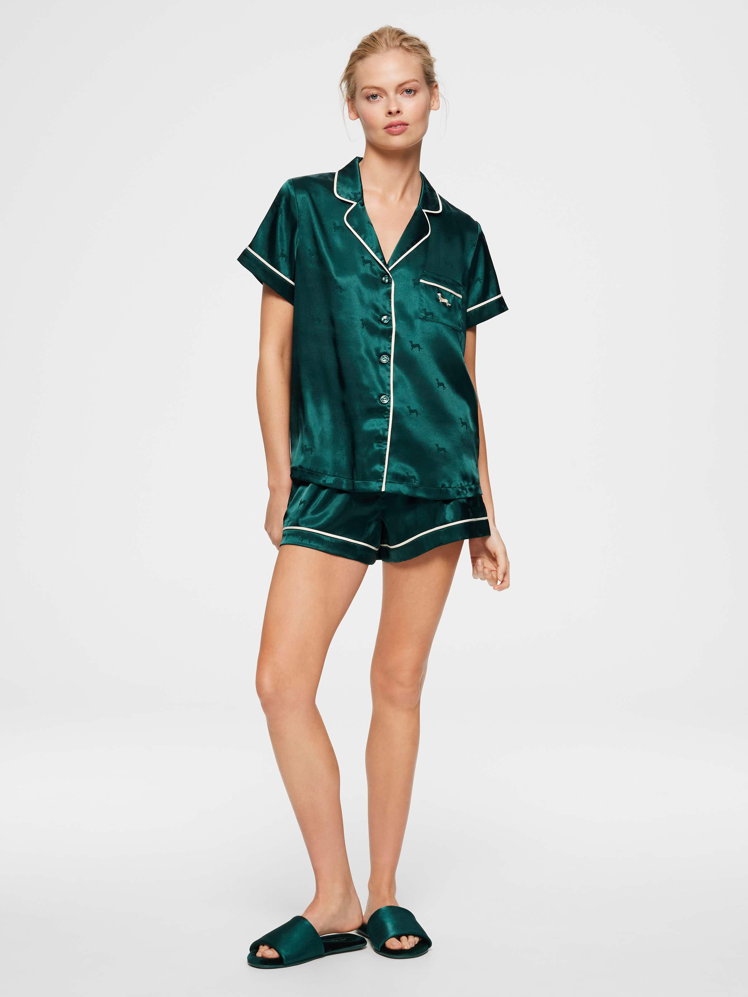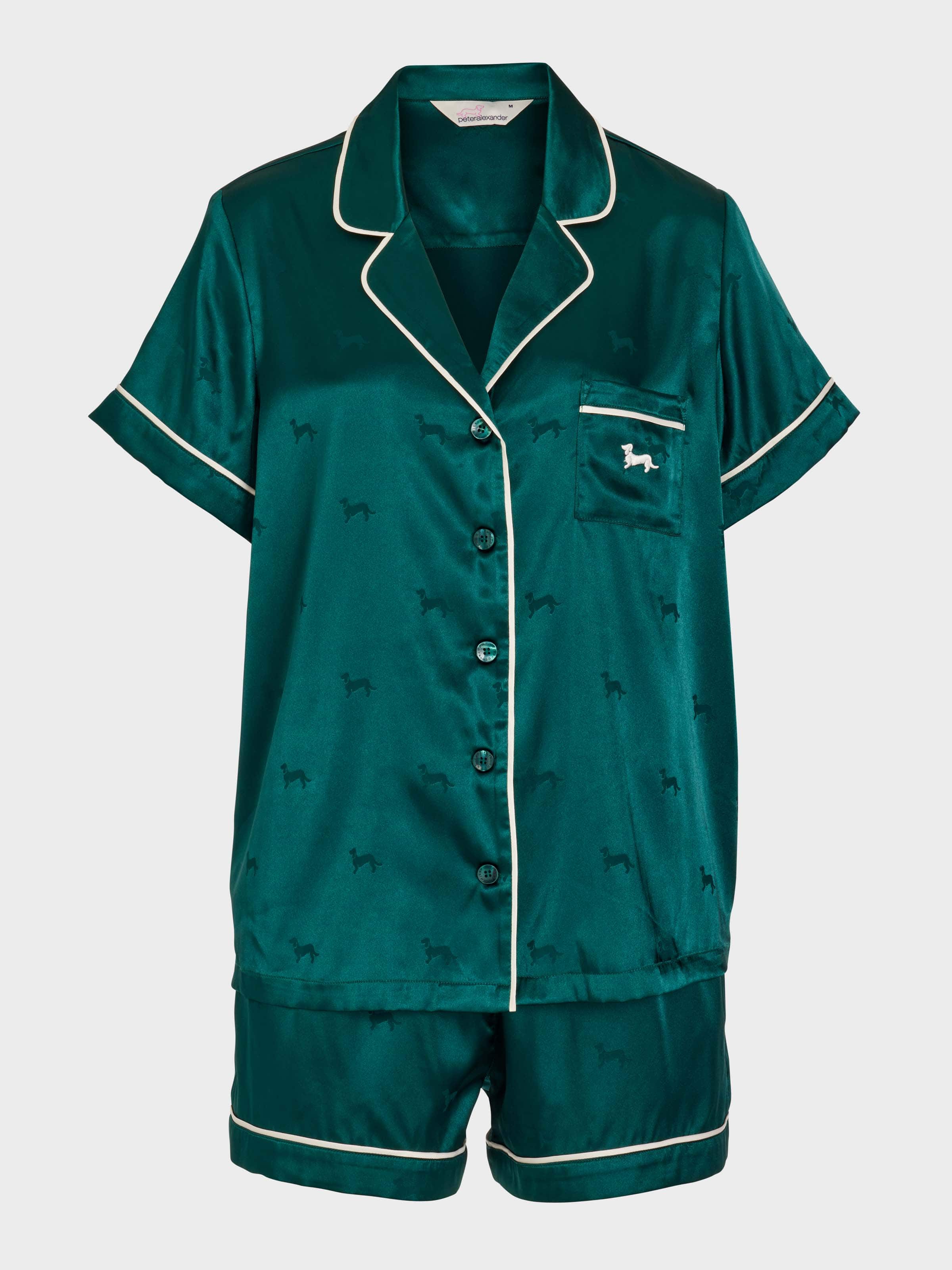 Have a holly jolly Christmas in this stunning satin PJ set. In a silky finish with matte jacquard penny dogs all over, this short sleeve top & mid short set makes the perfect gift for those who crave a slice of luxury in bed.
