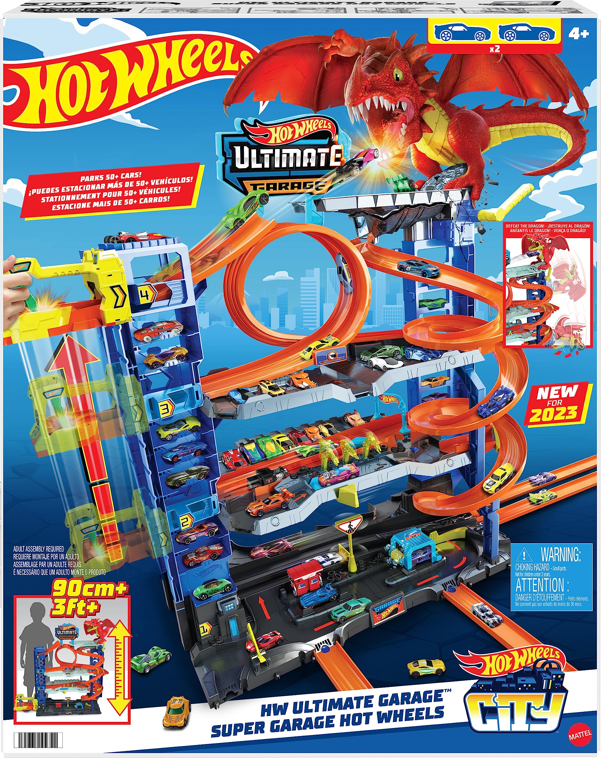 - Race, stunt and do battle with a dragon in the multi-level Hot Wheels City Ultimate Garage.