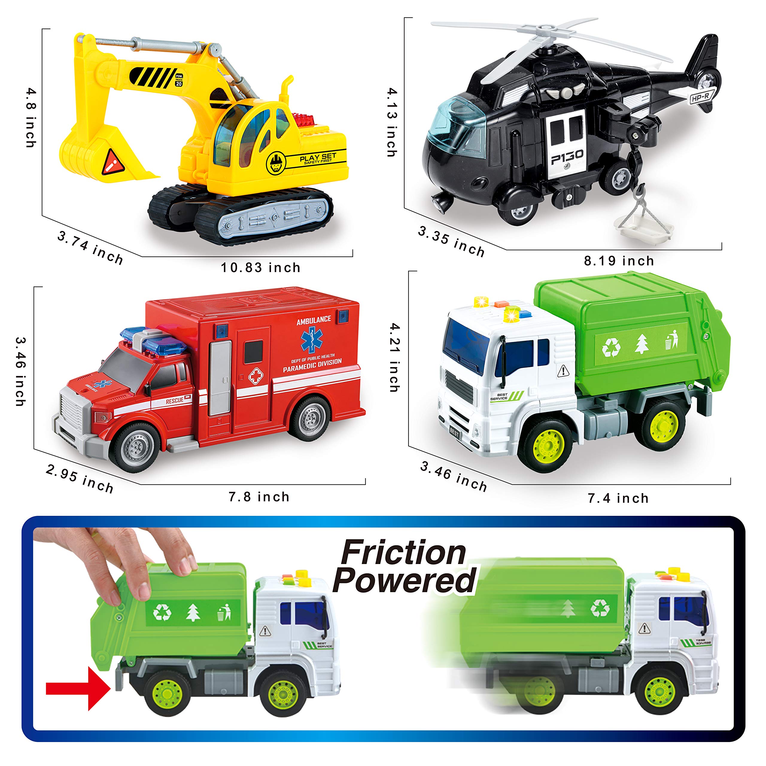 - VALUED SET: This Friction Powered Vehicle Set Includes 1 Construction Exvactor, 1 Police Helicopter, 1 Garbage Truck, and 1 Ambulance. All the vehicles are about 7u201d~8u201d long, 3u201d wide, and 3~4u201d High as estimated. The size might vary a little due to different shapes.