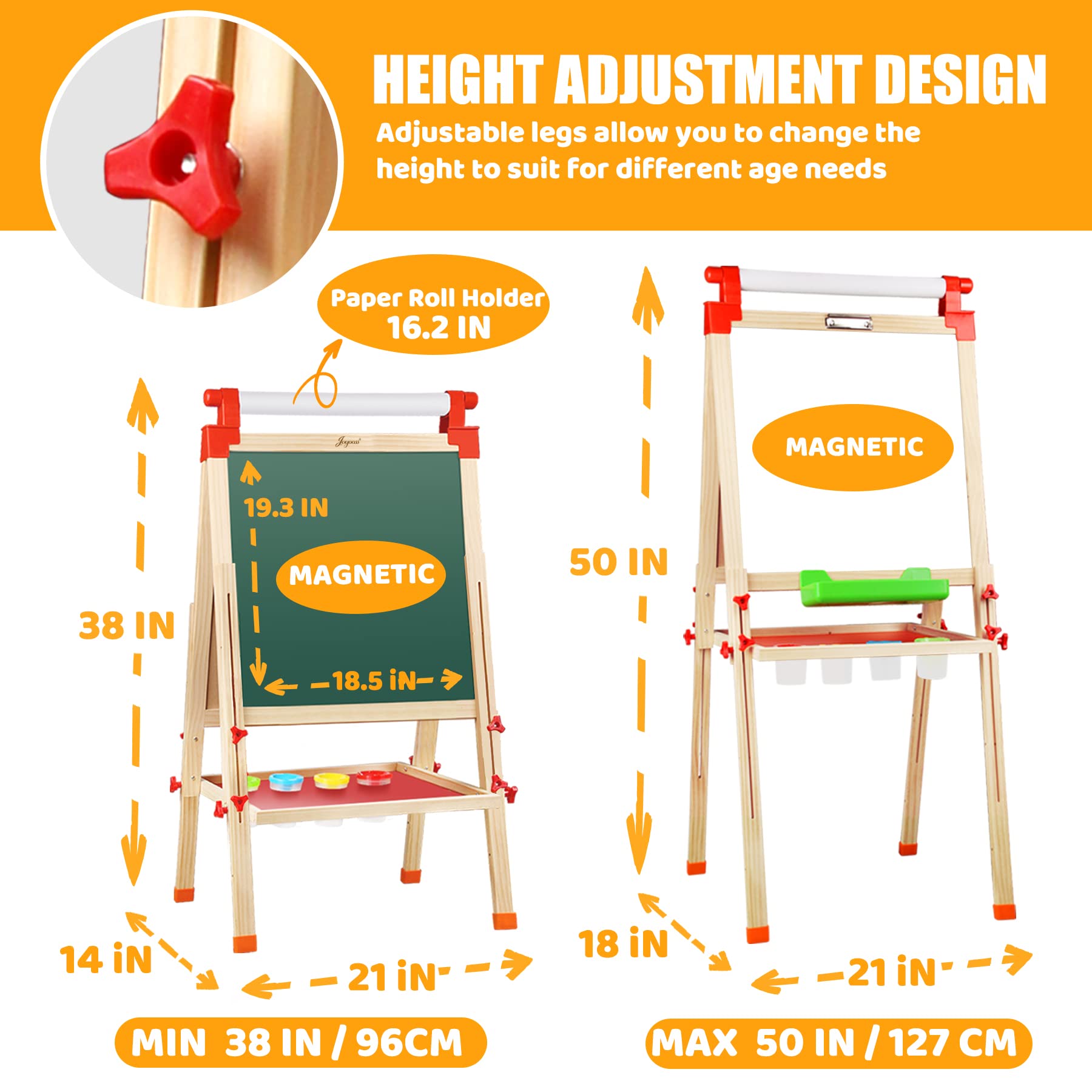 - u3010ADJUSTABLE HEIGHTu3011 -- The height of the easel can be adjusted from 38" to 51", and the board size is 18.5" x 19.29", which is used for 3 to 12 years old children.The height of easel can be adjusted according to different ages of kids. It means that you only need one easel for kids to be sufficient for them from kindergarten to elementary school.