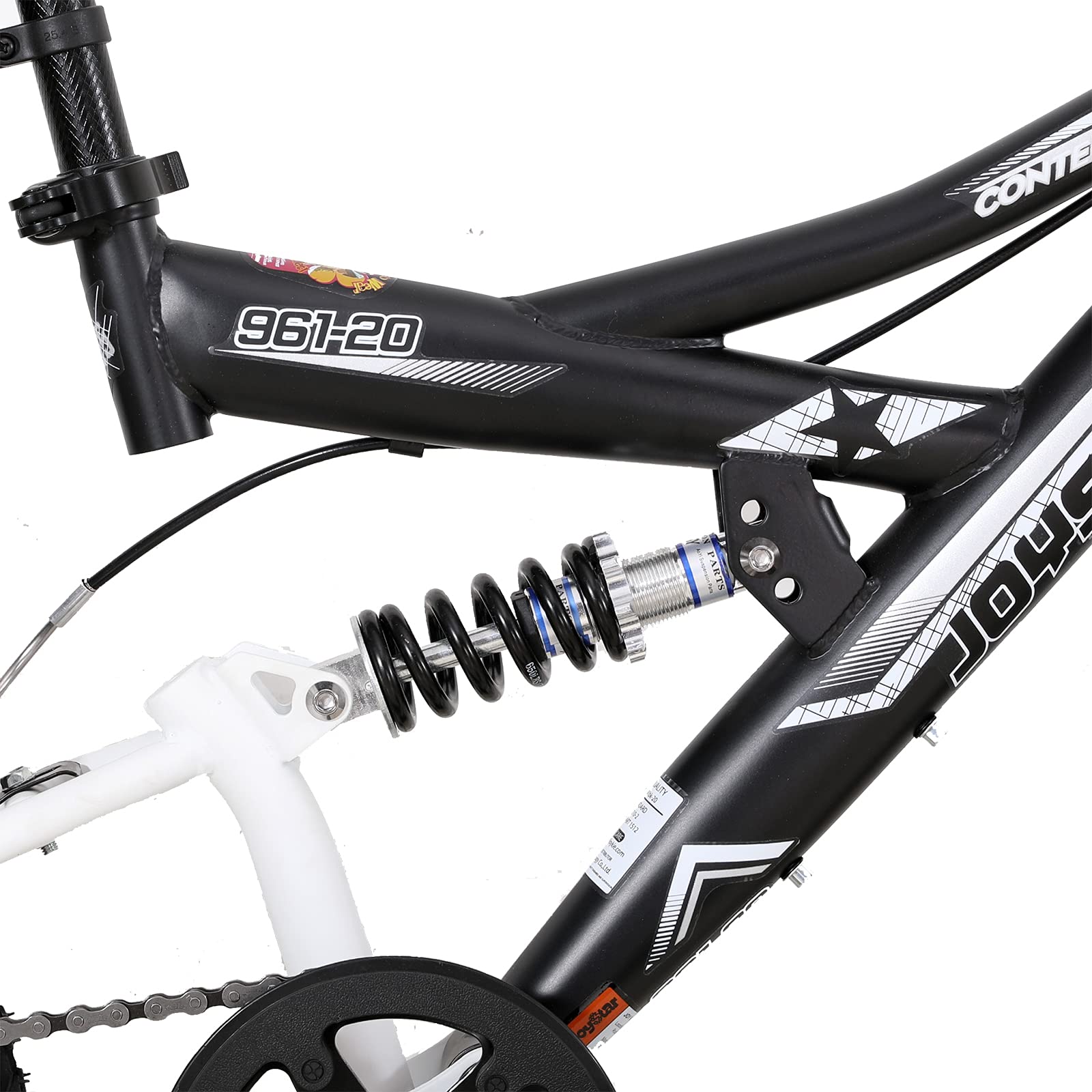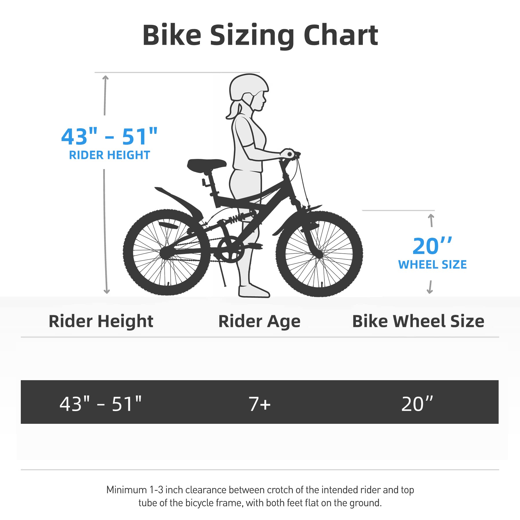 - u2705 Ready for Riding! JOYSTAR Contender 20 inch bike is ideal for ages 7+ and a rider height of 46-61 inches; the sleek stylish frame with vibrant colors, the rugged 20-inch tires and full suspension make this single speed bike ready for real riding adventures.