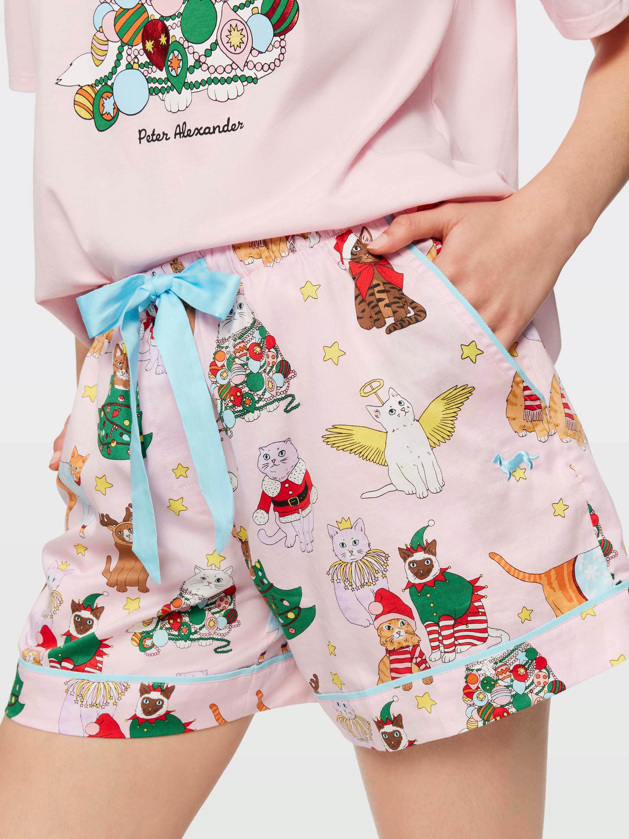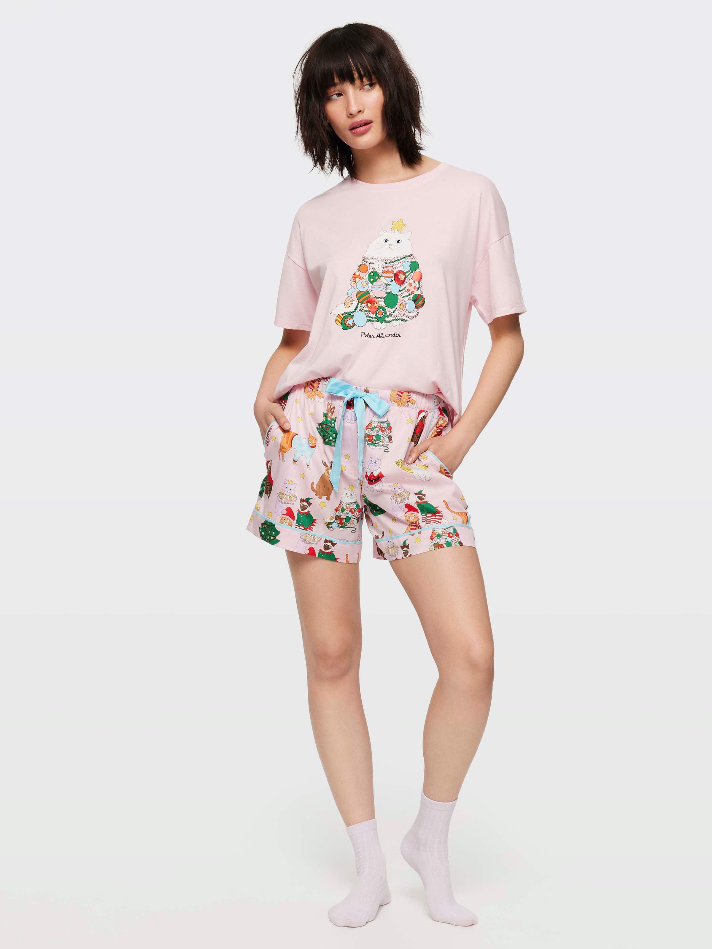 We all know the top of the Christmas tree is reserved for an angel or a star... this women's colourful Karen Mabon PJ set features an oversized viscose tee and matching short with an all-over print of our favourite feline friends celebrating the silly season. Packaged in a matching gift box, this PJ set would be the purrfect gift for any cat mum!