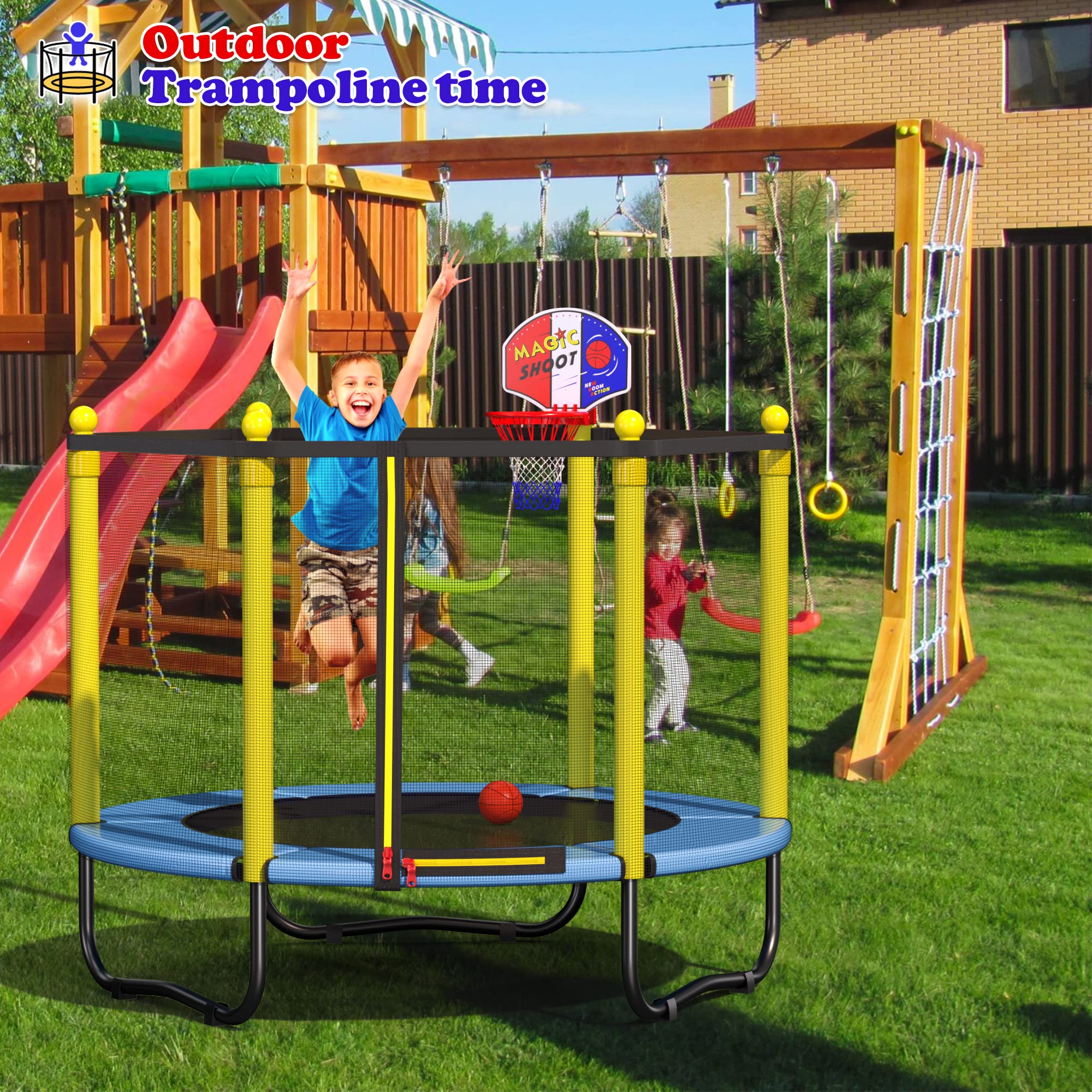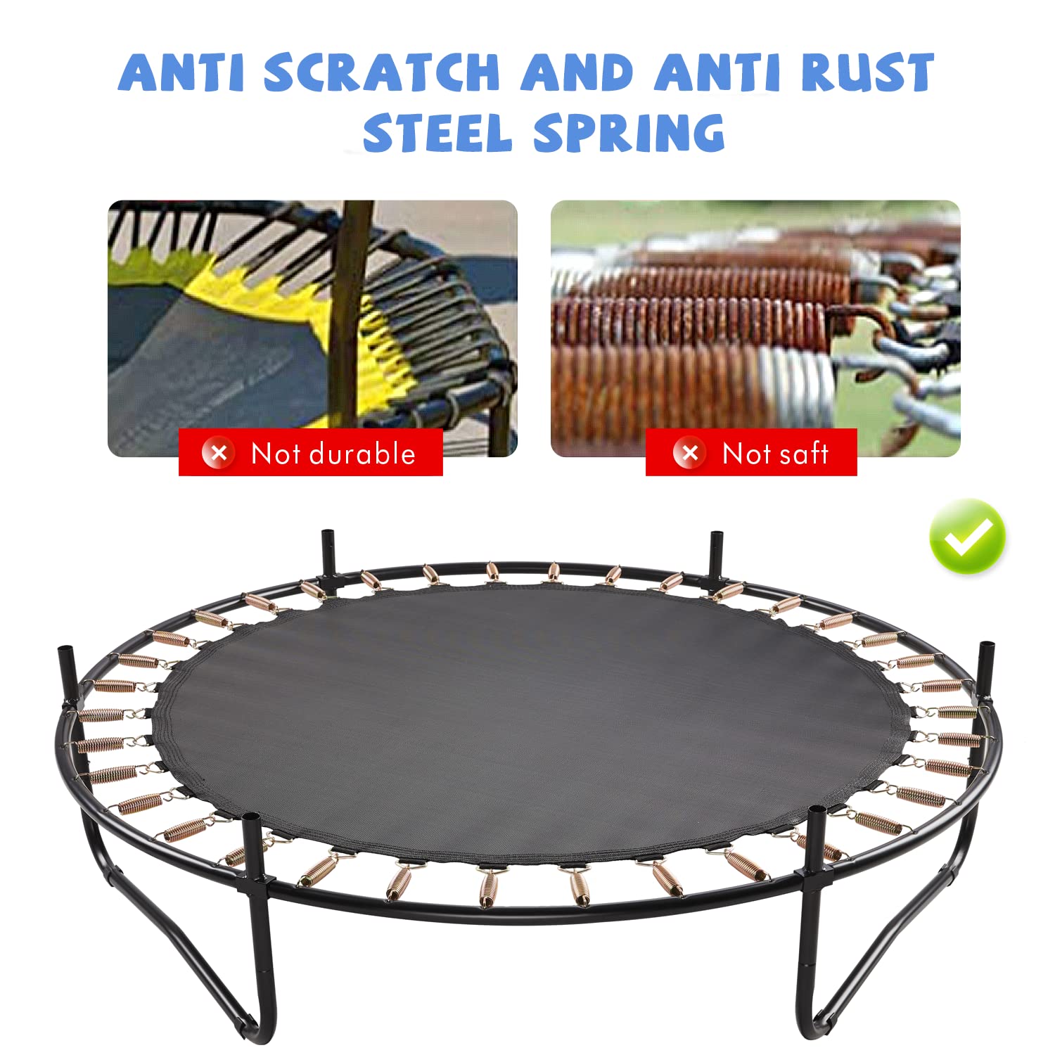 - u3010Excellent Bouncing Performanceu3011- The 36 heavy-duty, rust-resistant 4-inch springs are more durable, with long-lasting elasticity that won't deform and faster rebounding, providing excellent bouncing performance. The children's trampoline also includes an adjustable hanging basketball frame and ball, allowing kids to experience the fun of jumping and shooting.