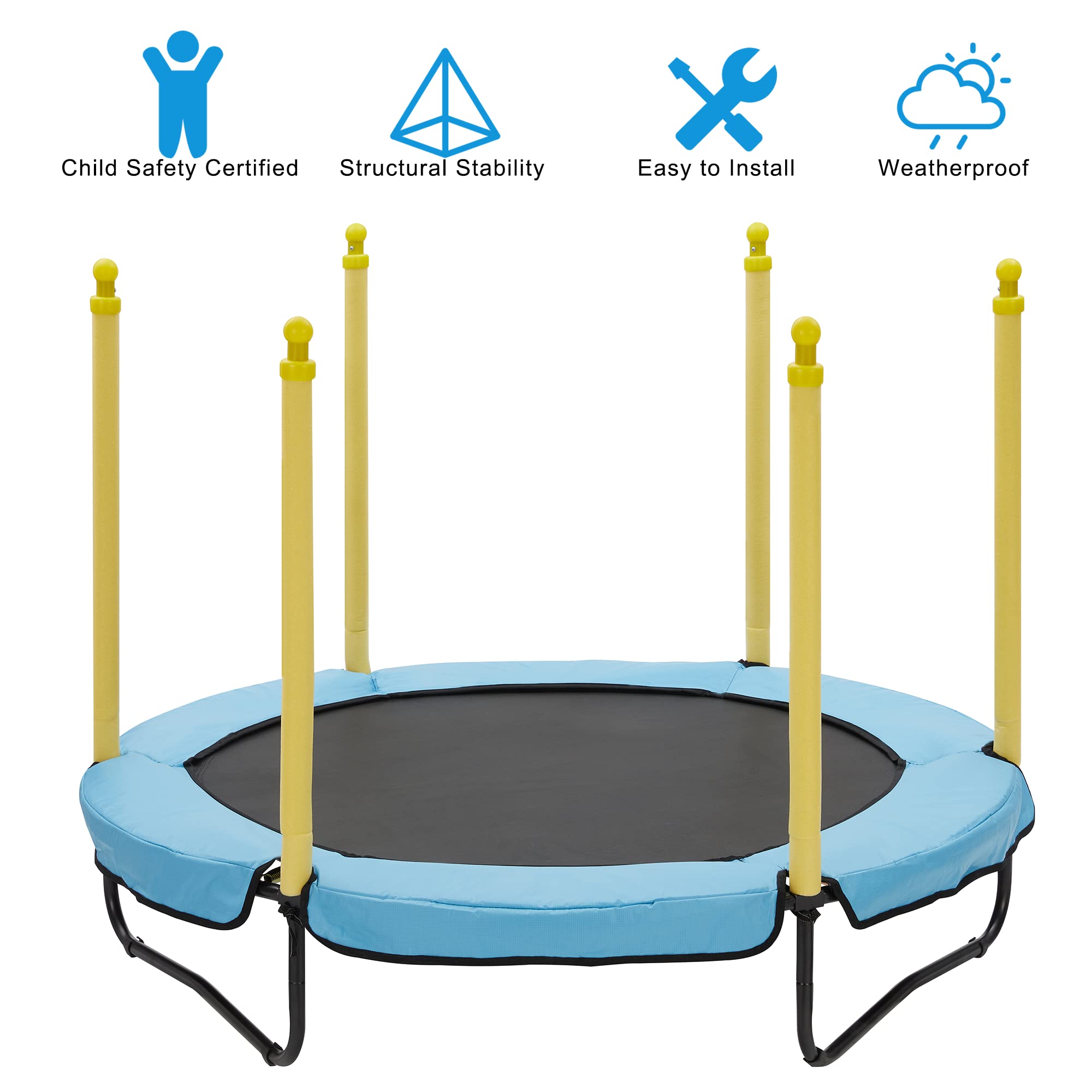 - u3010Safe & Reliableu3011- Thickened sponge pad eliminates the gap between the spring and jumping pad, which can well protect the child's feet from getting stuck. 360u00b0 soft-touch enclosure net ensures that your child will not fall off the trampoline. Environmental protection sponge tube to provide more intimate protection, so that the baby play safe and secure.