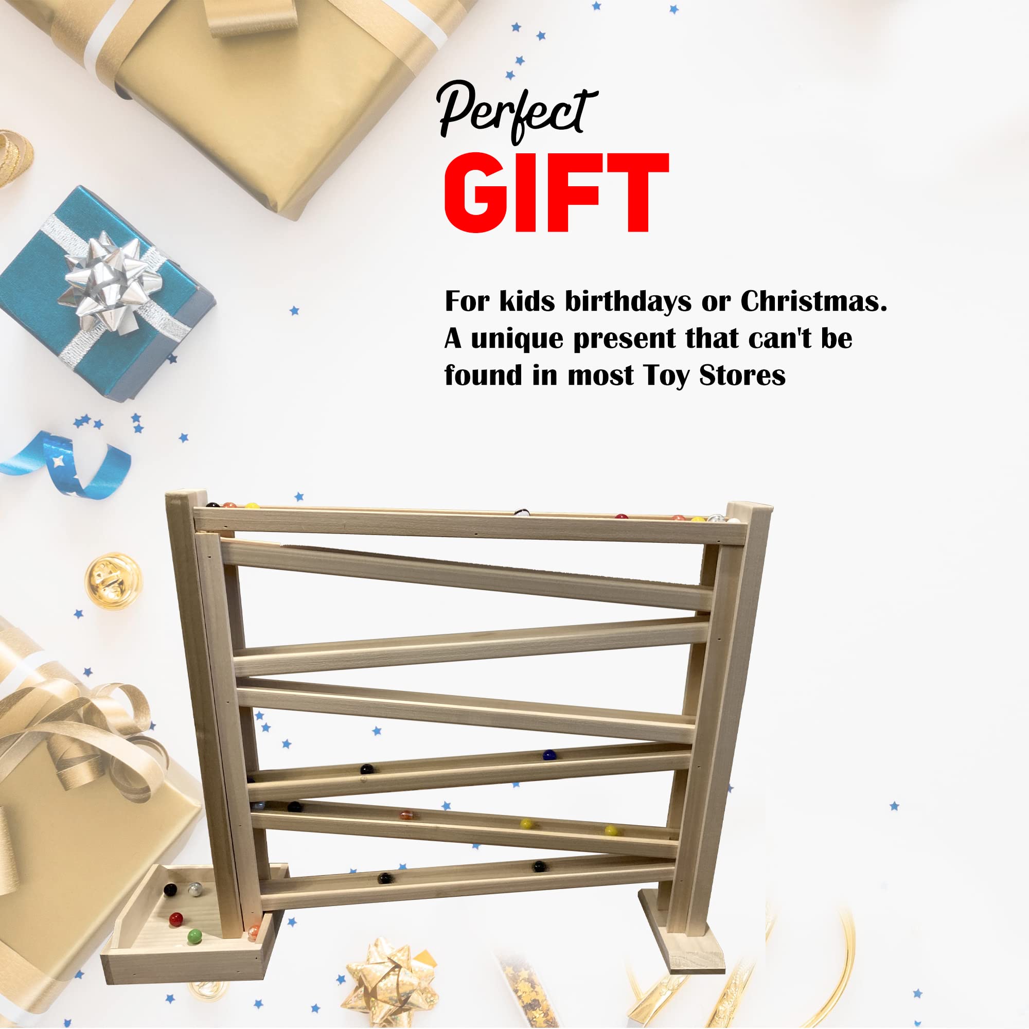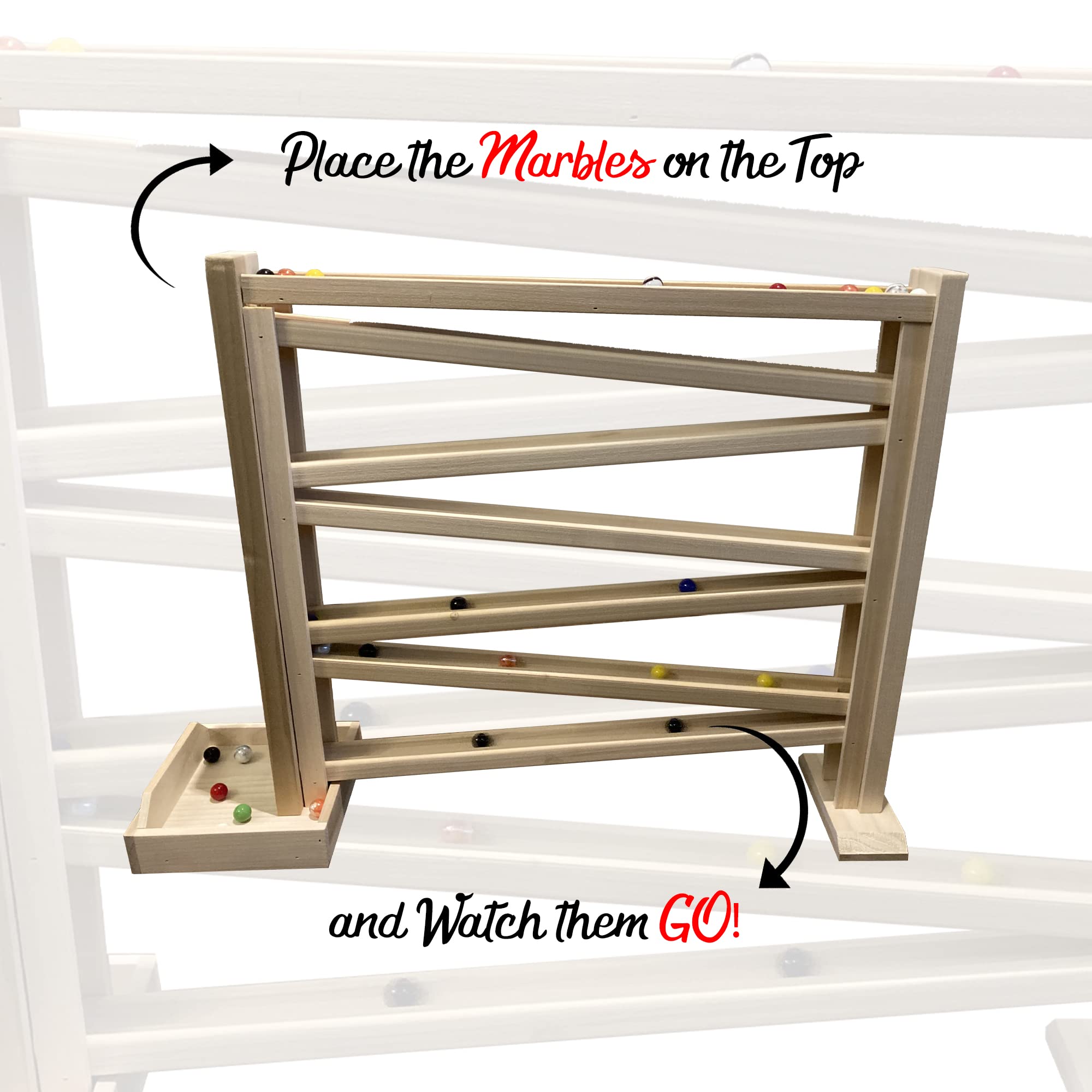 - Marble Run Track: Marbles zig zag through a track. Place the marbles on the top and watch them go!