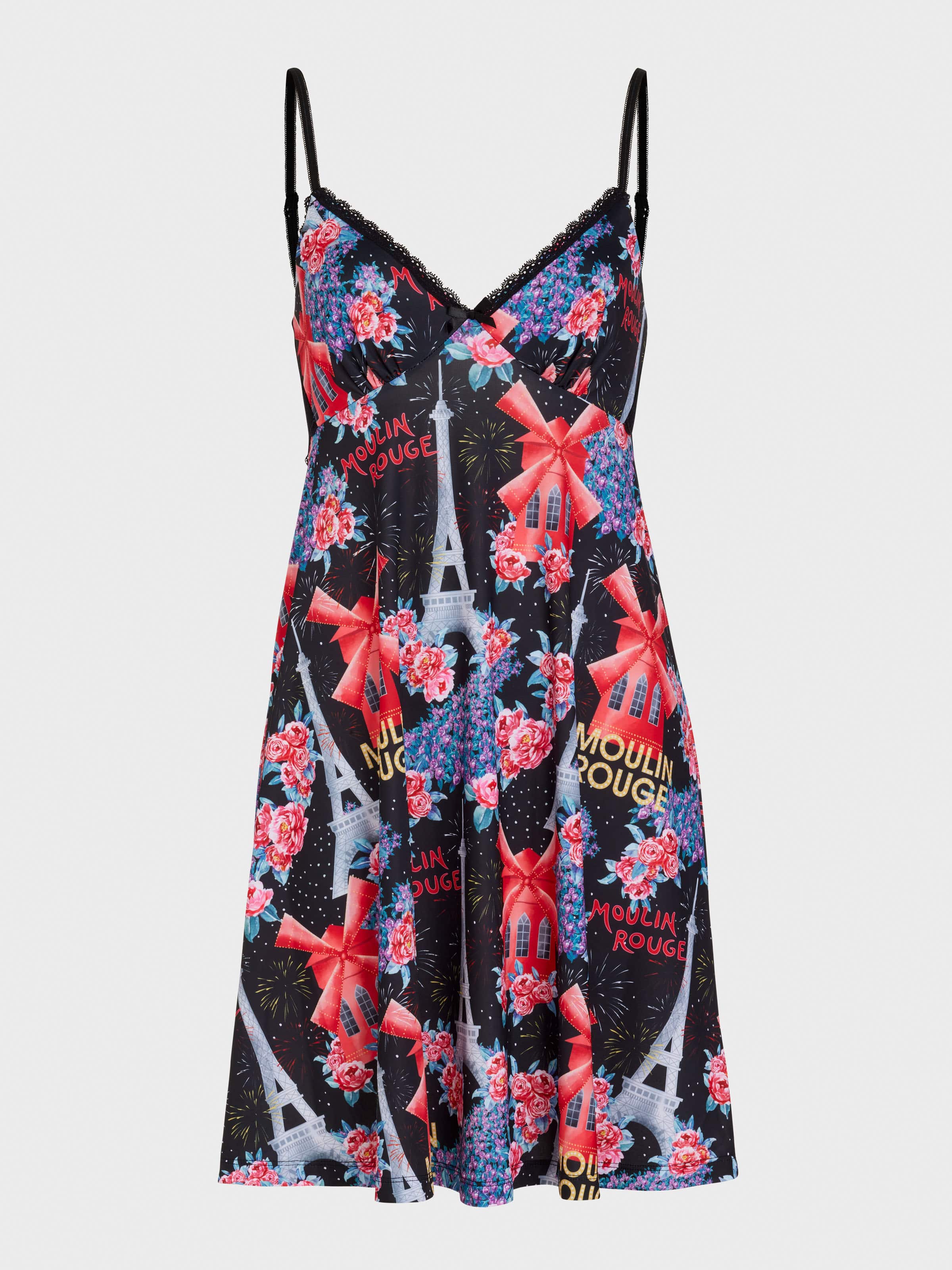 Fall in Louvre with this Moulin Rouge printed babydoll slinky. Featuring a sheer lace back and an all over Parisian print, this piece is sure to make it a night-ie to remember.??