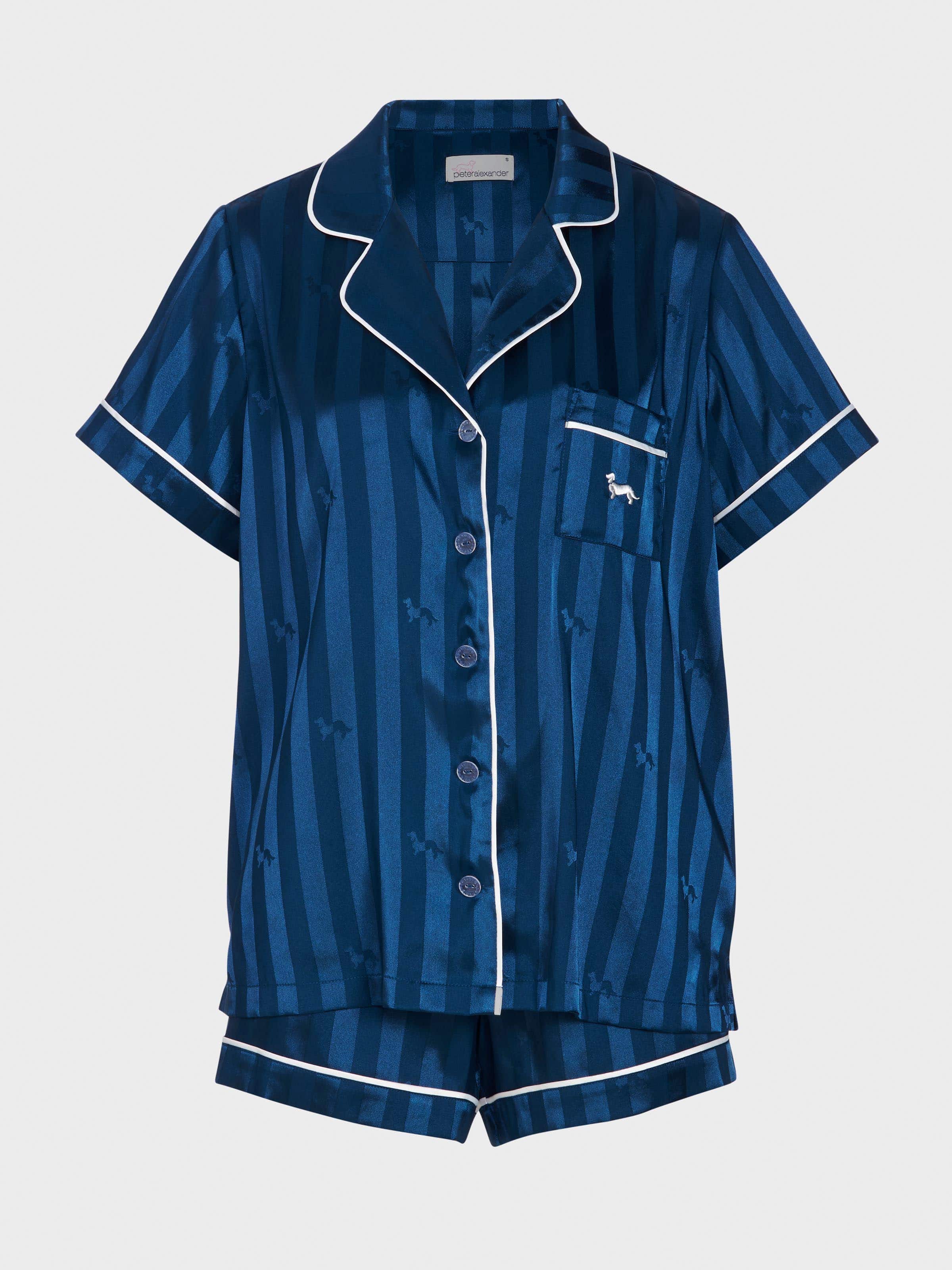 Our number one best selling pyjama set ever has had a glow up! A twist on your favourite style, this new navy shade features a soft self stripe effect with mini penny dogs all over- making it a P.A. exclusive product. White trims and a matching gift box add the extra special touch to produce the perfect gift for any woman, including yourself.? ?