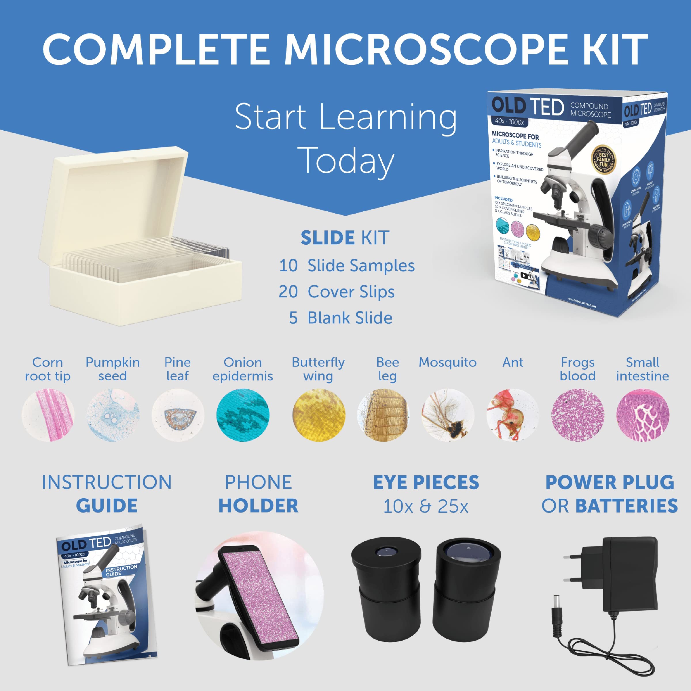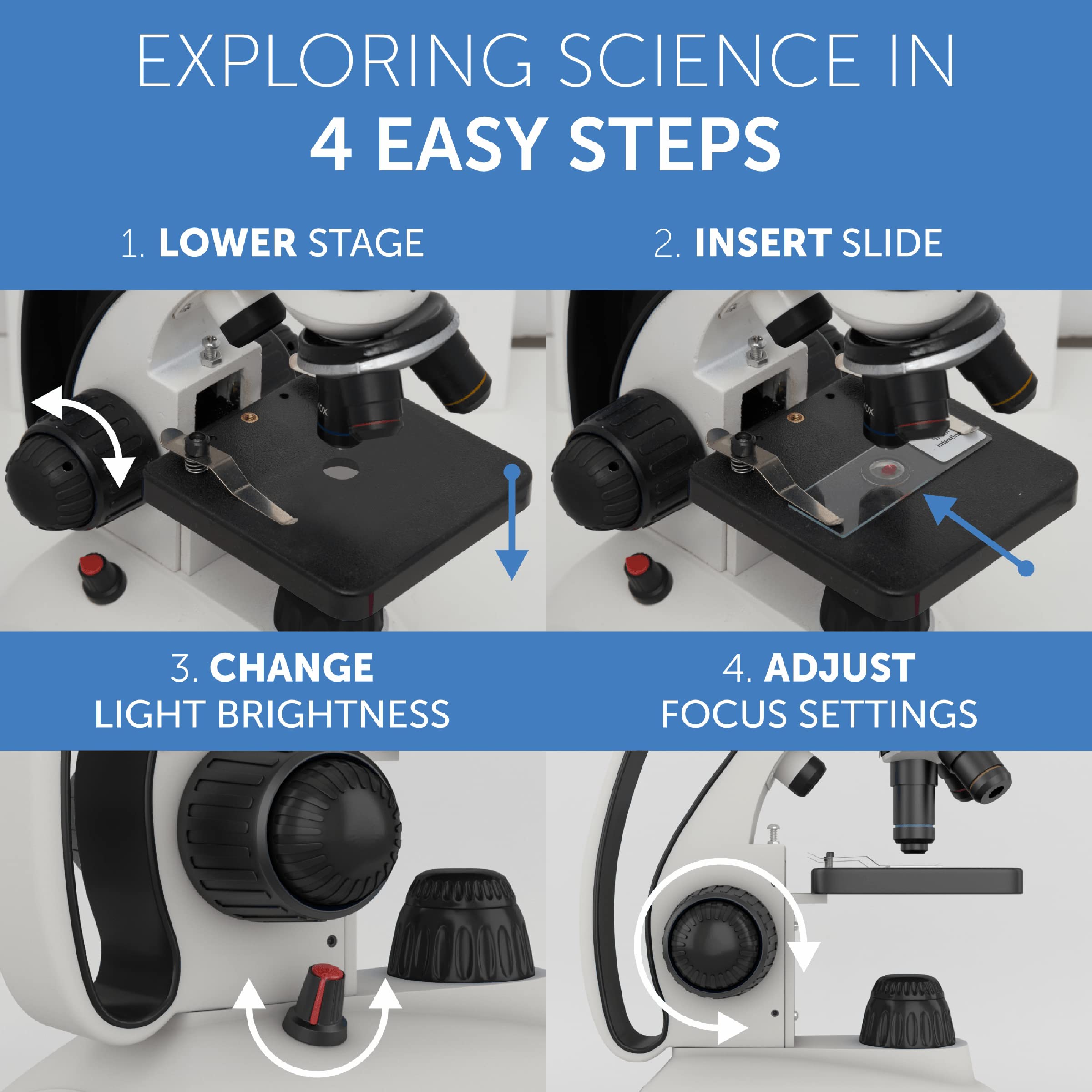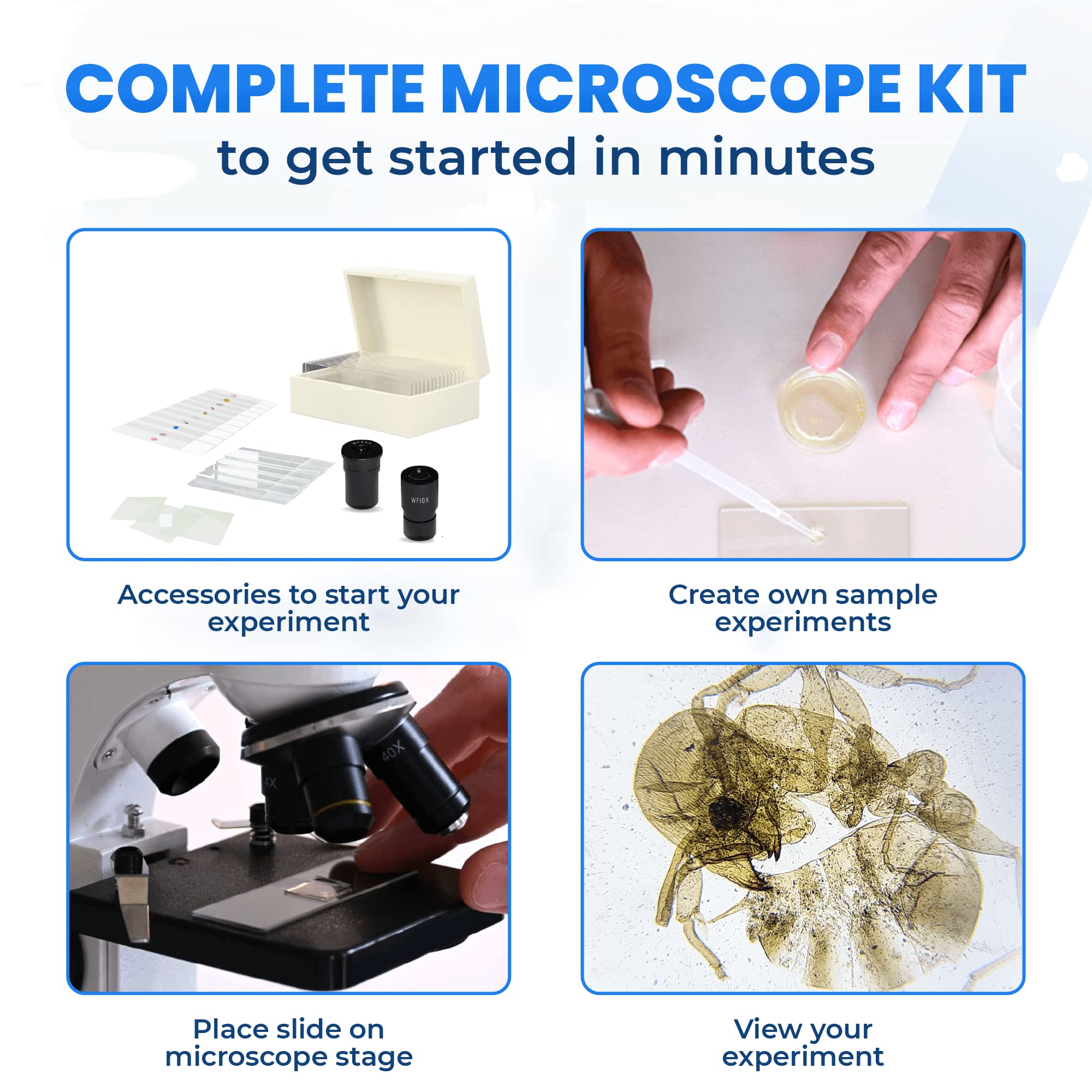 - Super Fun & Easy to Use: Complete with a detailed 16 Page user instructions guide, explaining how to setup your microsope and step by step examples of experiments - foster your STEM learning. Additional x5 blank slides and cover slips included to make your own slide experiments