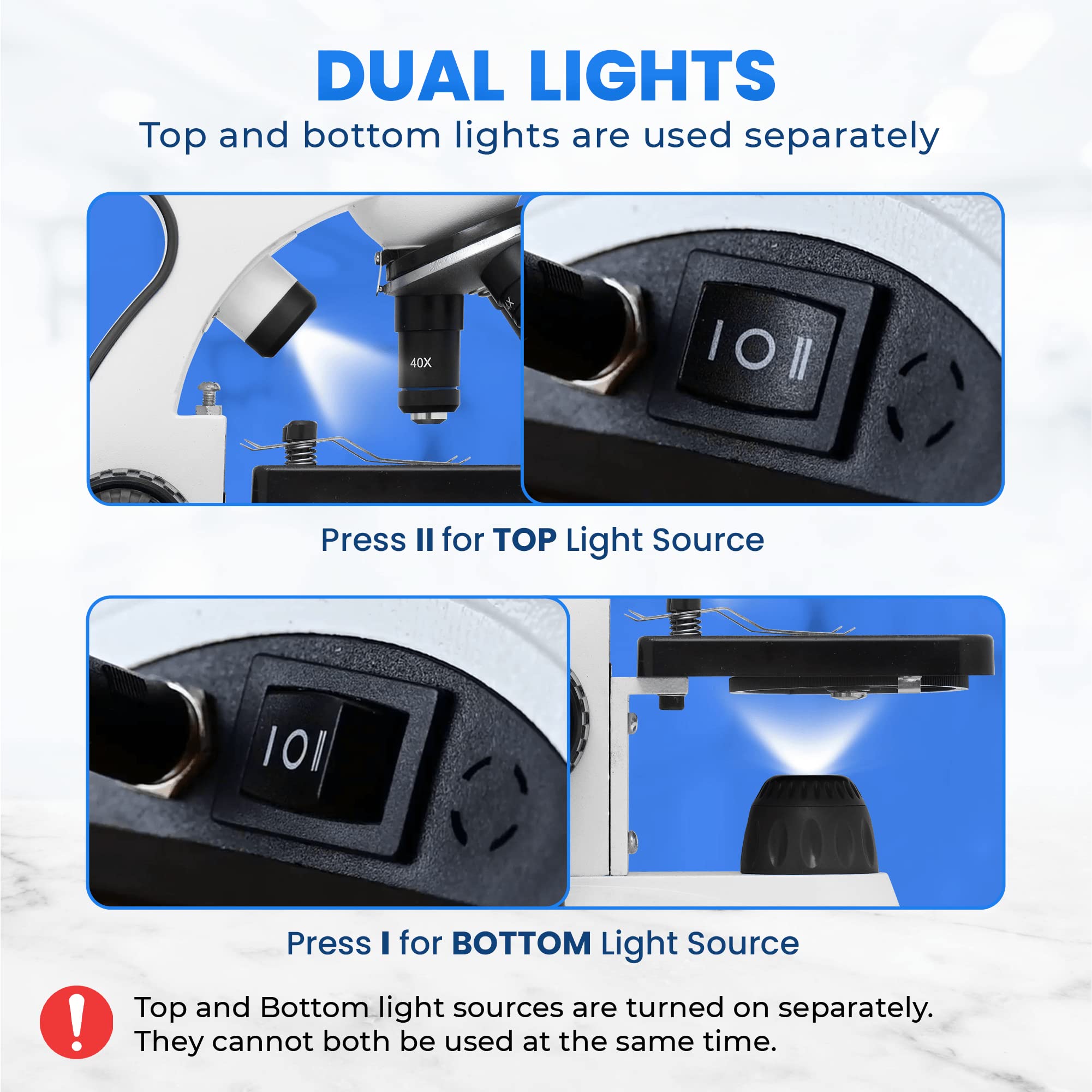 - STEM & Family Learning: View the Microscopic world with the x10 prepared slides. Ranging from Bee legs to Corn root tips. Crystal clean visibility through the 4x, 25x or 40x objective lens and genuine 10x and 25x Eyepieces. NOTE: Top and Bottom Lights are Used Separately. Controlled by Switch I and II