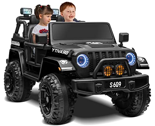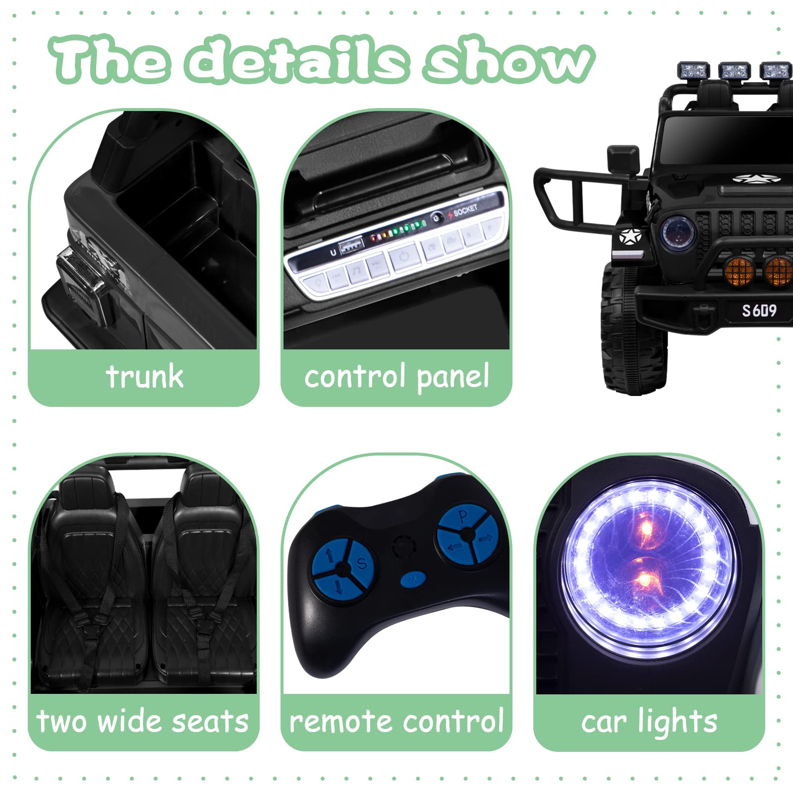 - u3010Large Cool Two Seater Caru3011The 2 seater battery operated kids car features wear-resistant wheels,which made of superior PP materials with no possibility of leaking or tire burst, eliminating the hassle of inflating. Cool Unique design look, featuring bright front & rear lights and double door with magnetic lock, this kids ride on car brings extra surprise to your baby, provide your children with the most authentic driving experience.