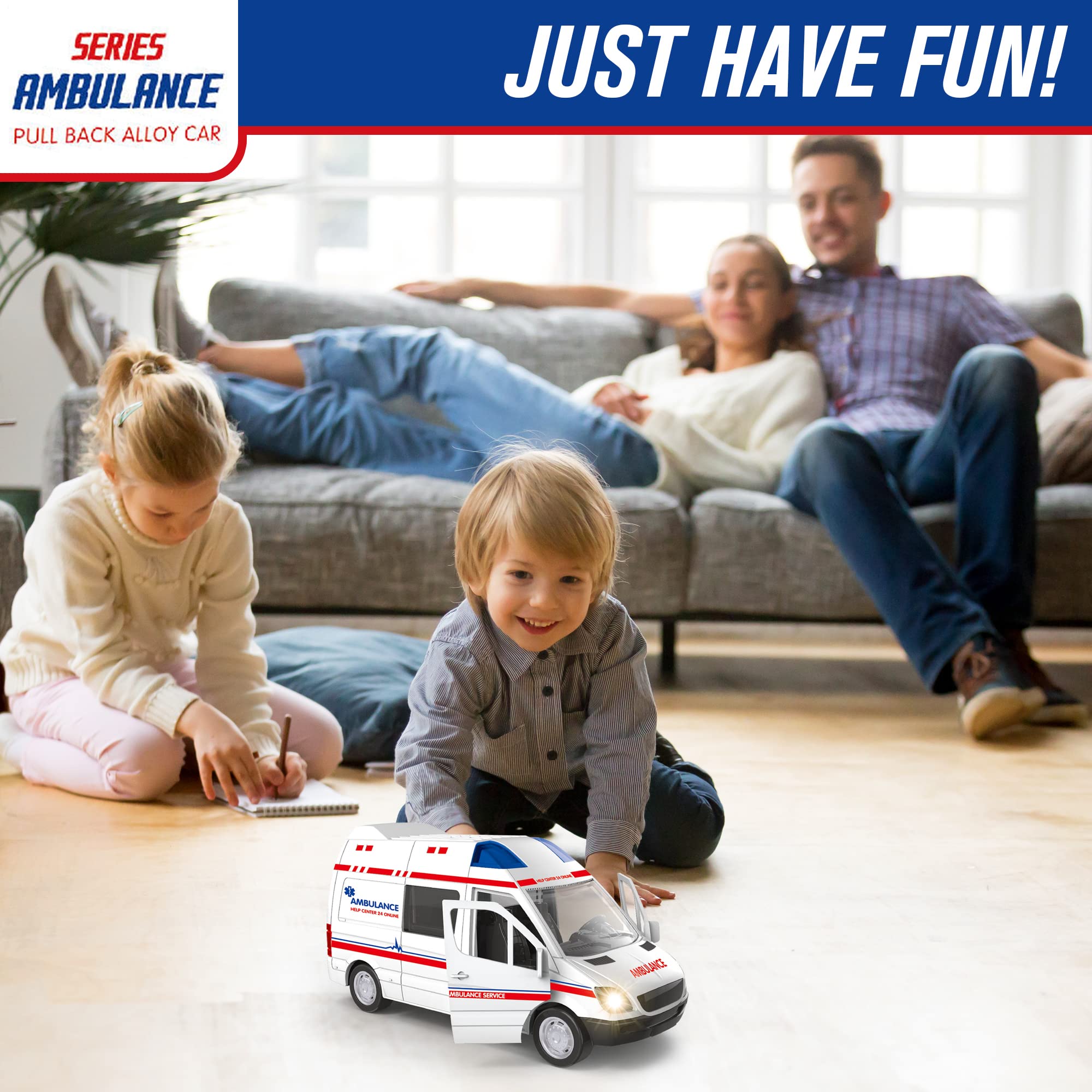 - FRICTION POWER FOR NON-STOP FUN: The ambulance is powered by friction, so your child can simply push it forward to get it going. This makes it easy for kids to play with and helps them develop their motor skills.
