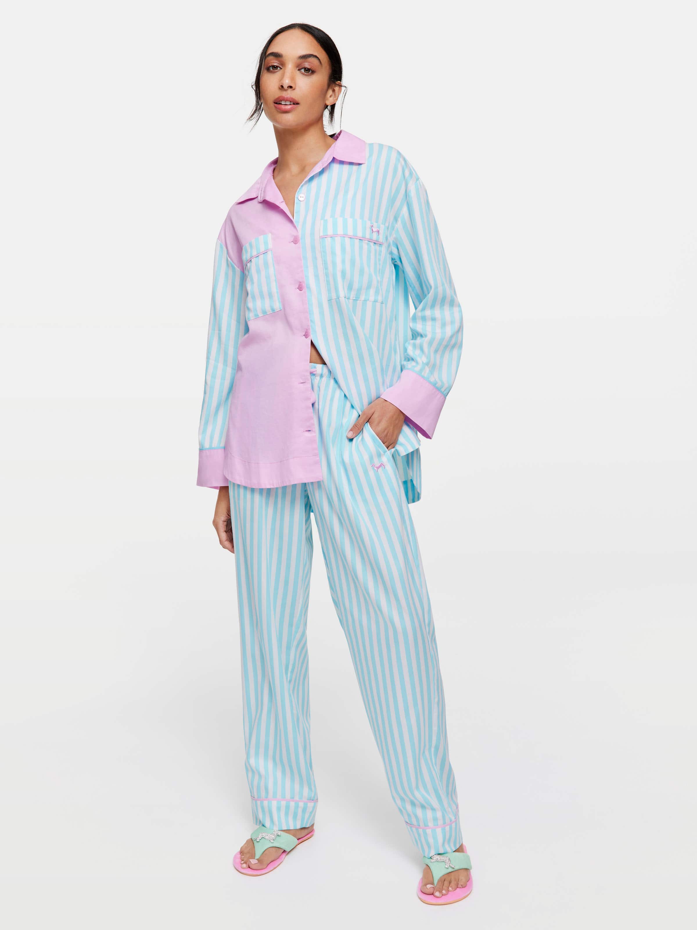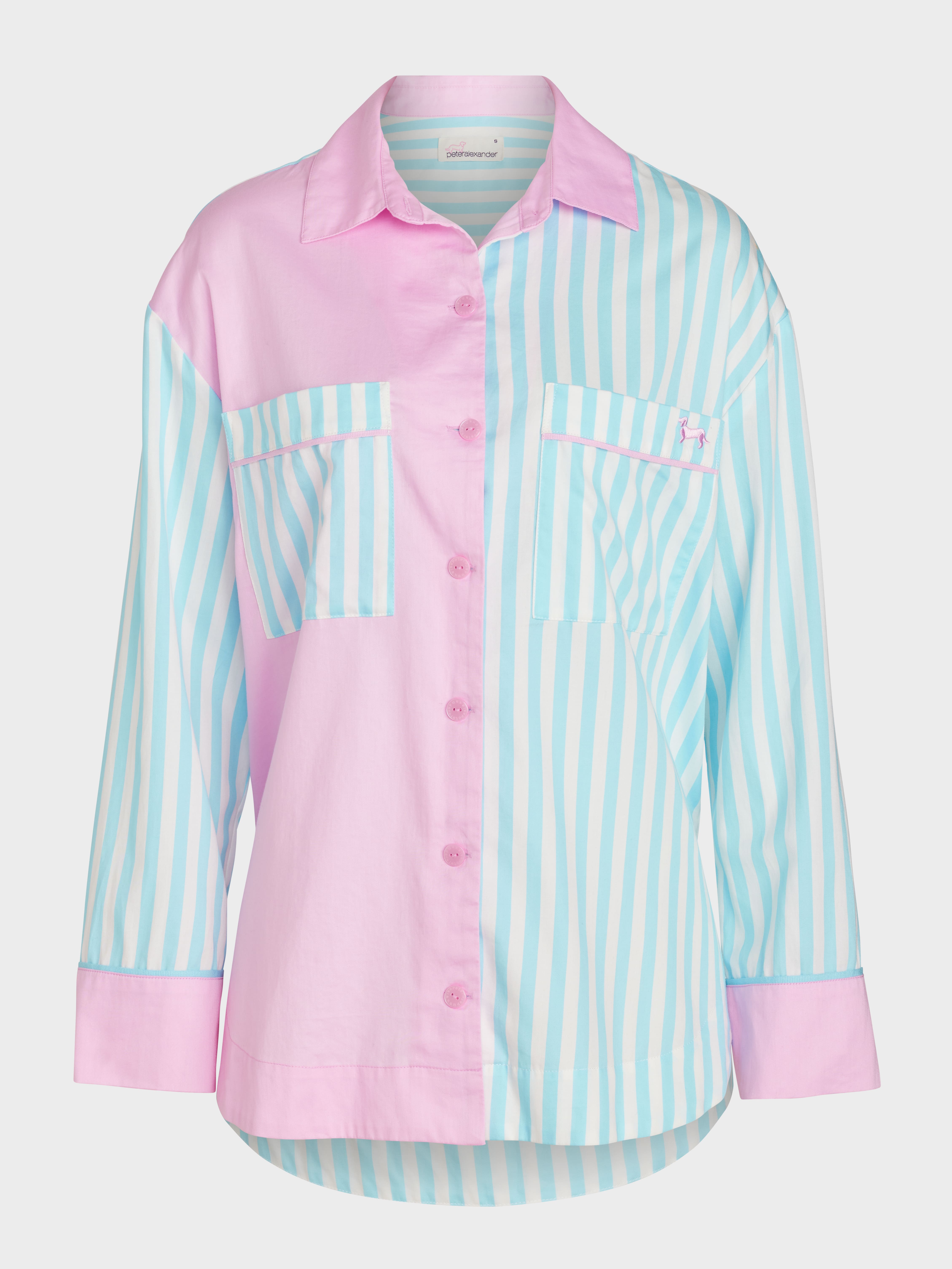 Stripe a pose in this chic color block shirt. Whether you're feeling blue, or love a pop of pink, you get the best of both worlds with this cotton boyfriend fit fashion style.?