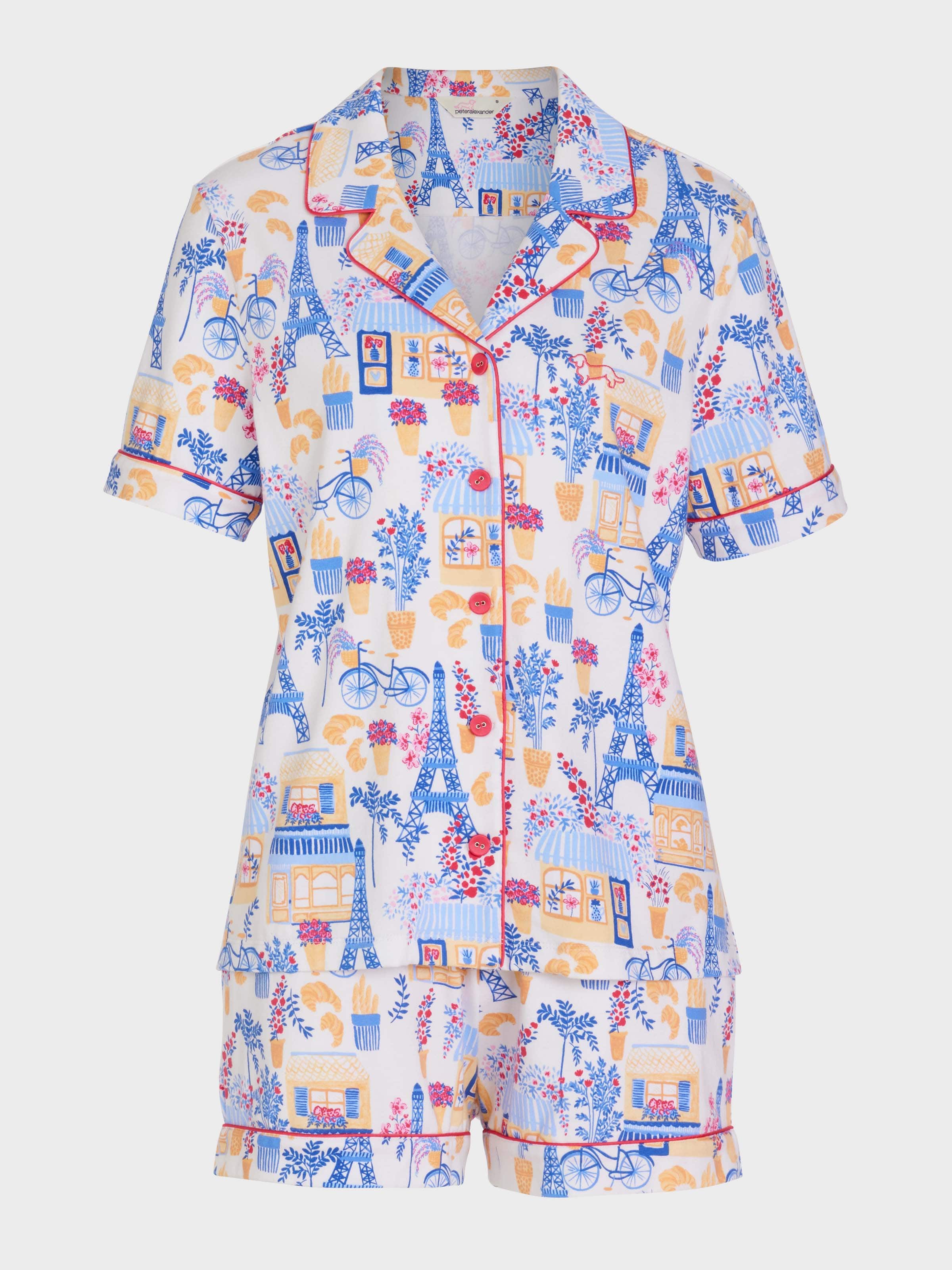 Say Bonjour to a good night's sleep in this Parisian inspired PJ set. The matching shirt and mid shorts feature all the things you love about the French city, including croissants, the Eiffel Tower & pretty florals.?