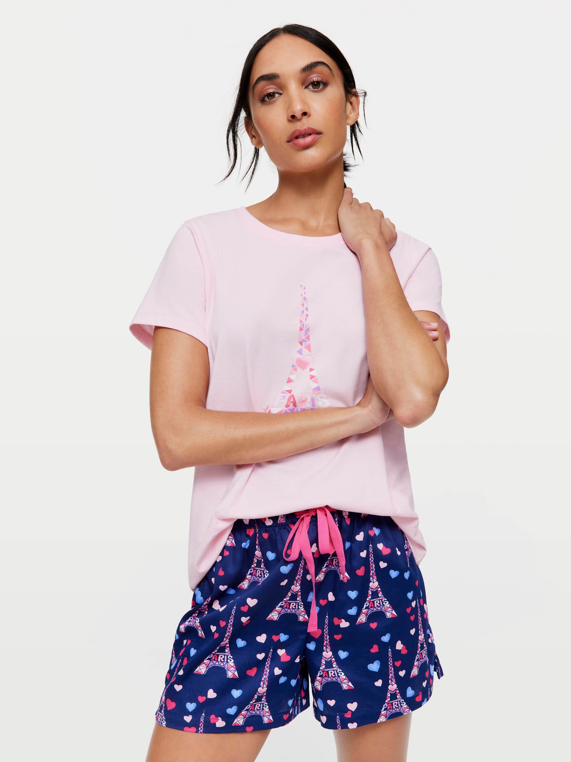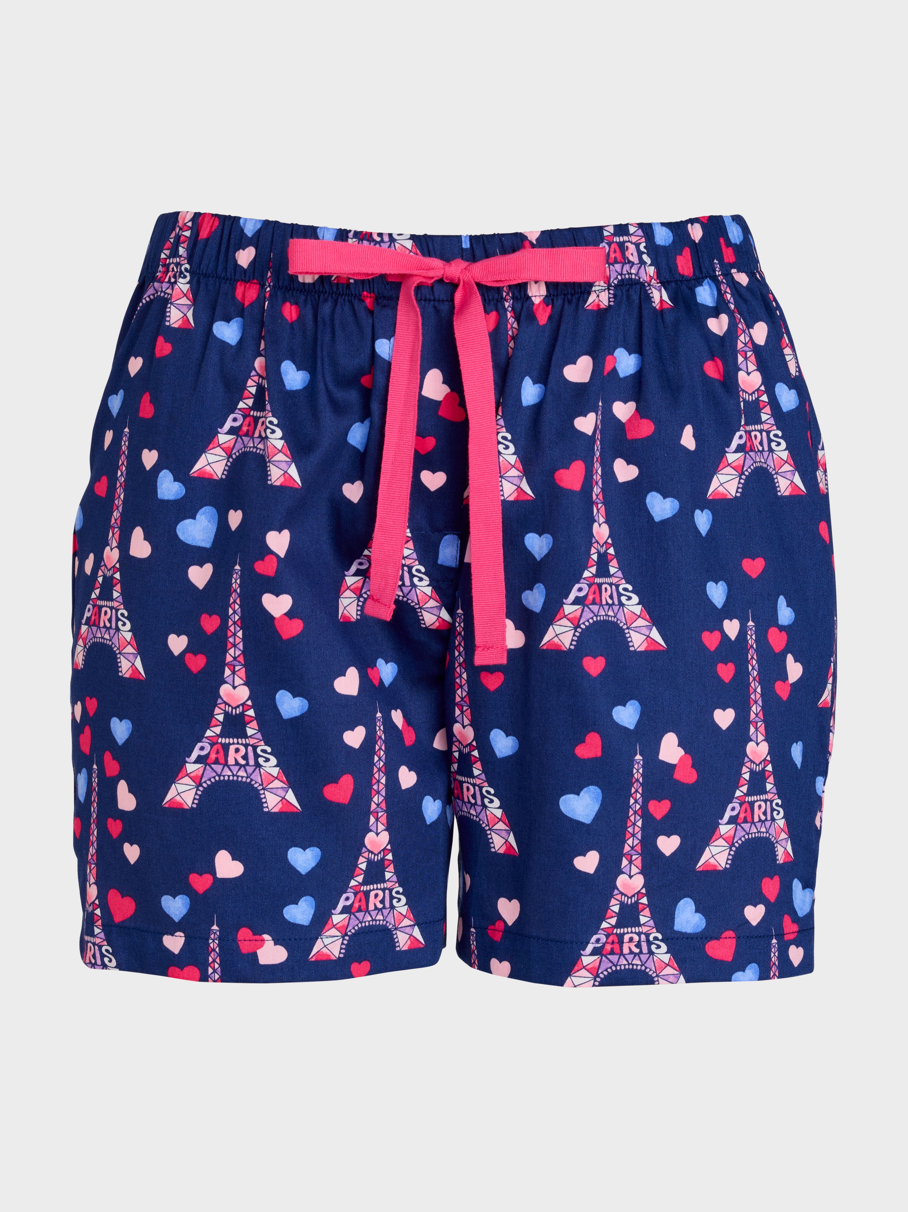 P.A. and Paris, the perfect pair! These classic cotton sateen shorts feature a colourful Eiffel Tower print, ideal for any Francophile, and go best with the matching pink tee.