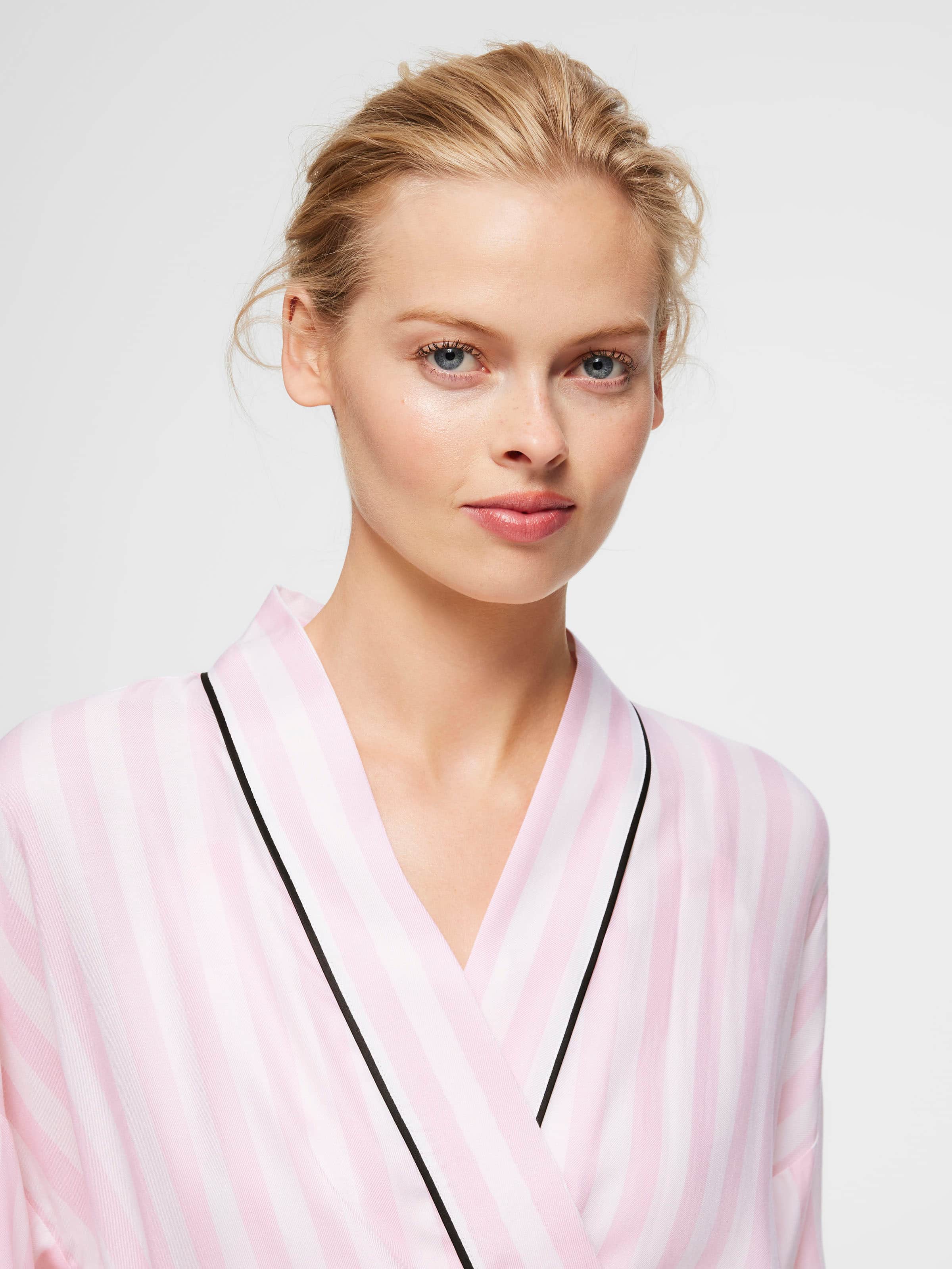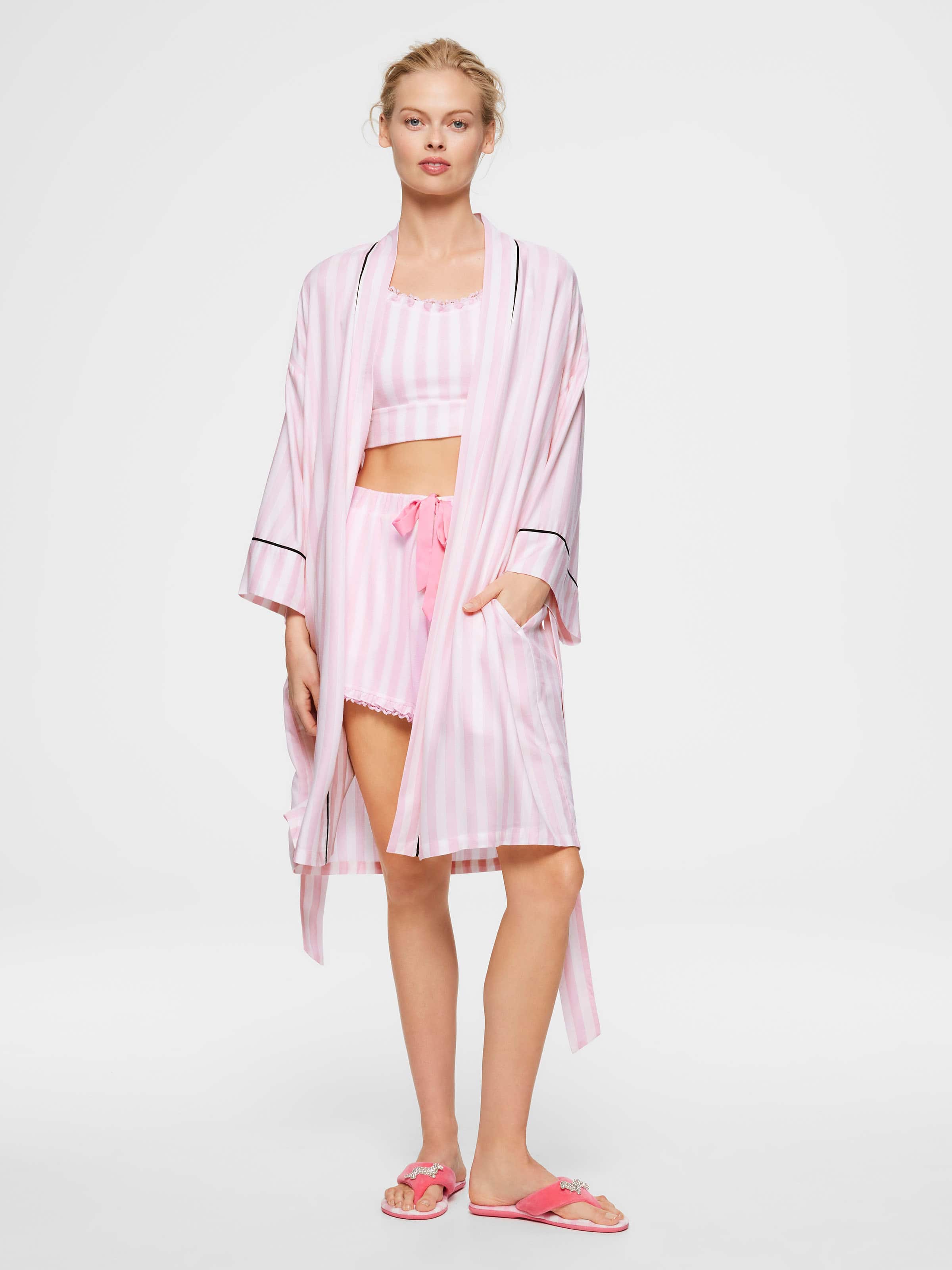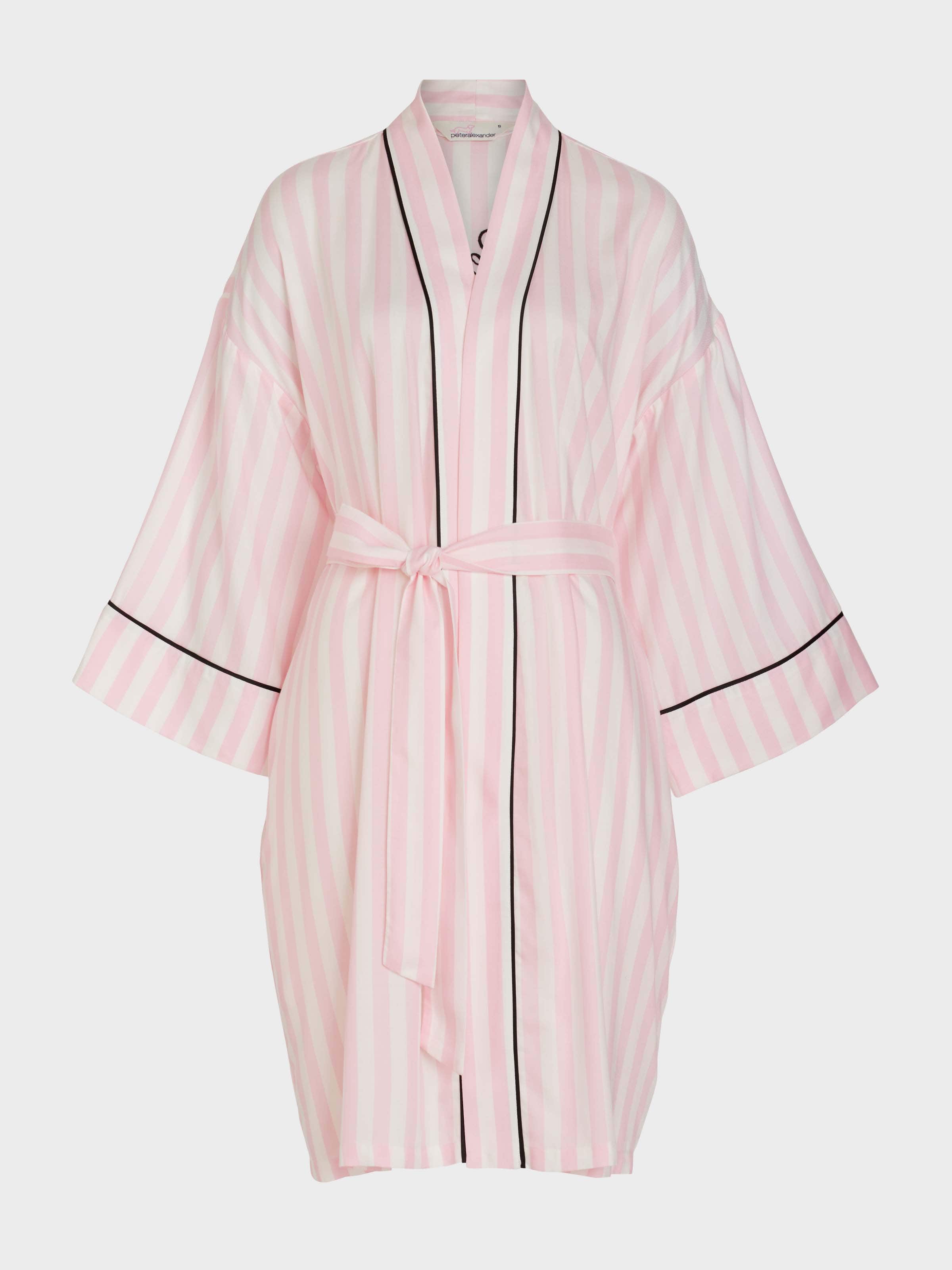 Getting ready has never looked better! Cover up in this stripe print kimono gown that will have you feeling like a star.?