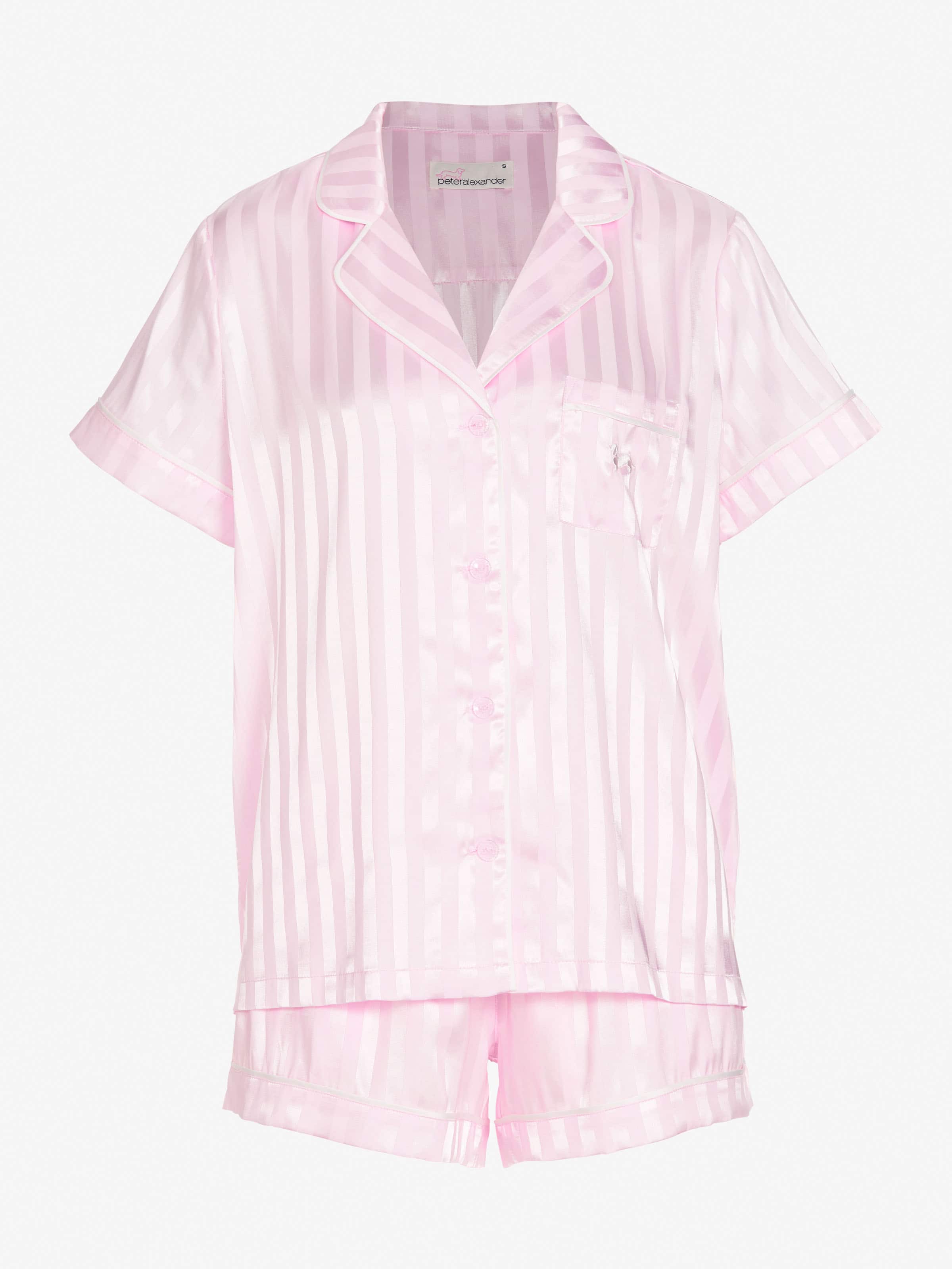 Our ever popular signature style satin pyjama set for women is now available in this new pink shade that is the prettiest of pinks with a soft stripe effect.??
