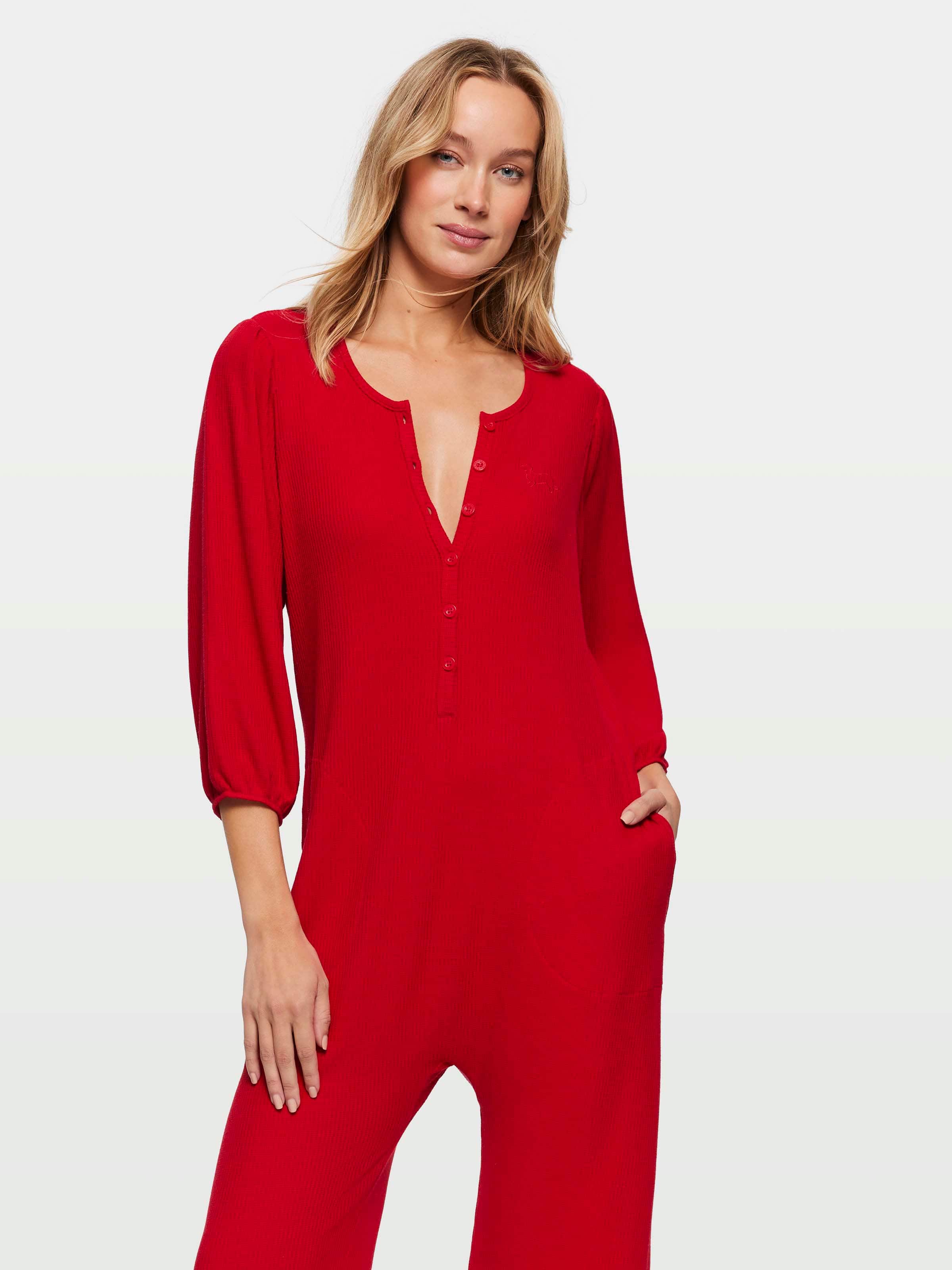 Live out your Christmas dreams in radiant red this silly season! This women's waffle onesie features a gathered neckline with henley buttons, and wide-legged pants to keep you comfy and cool.?