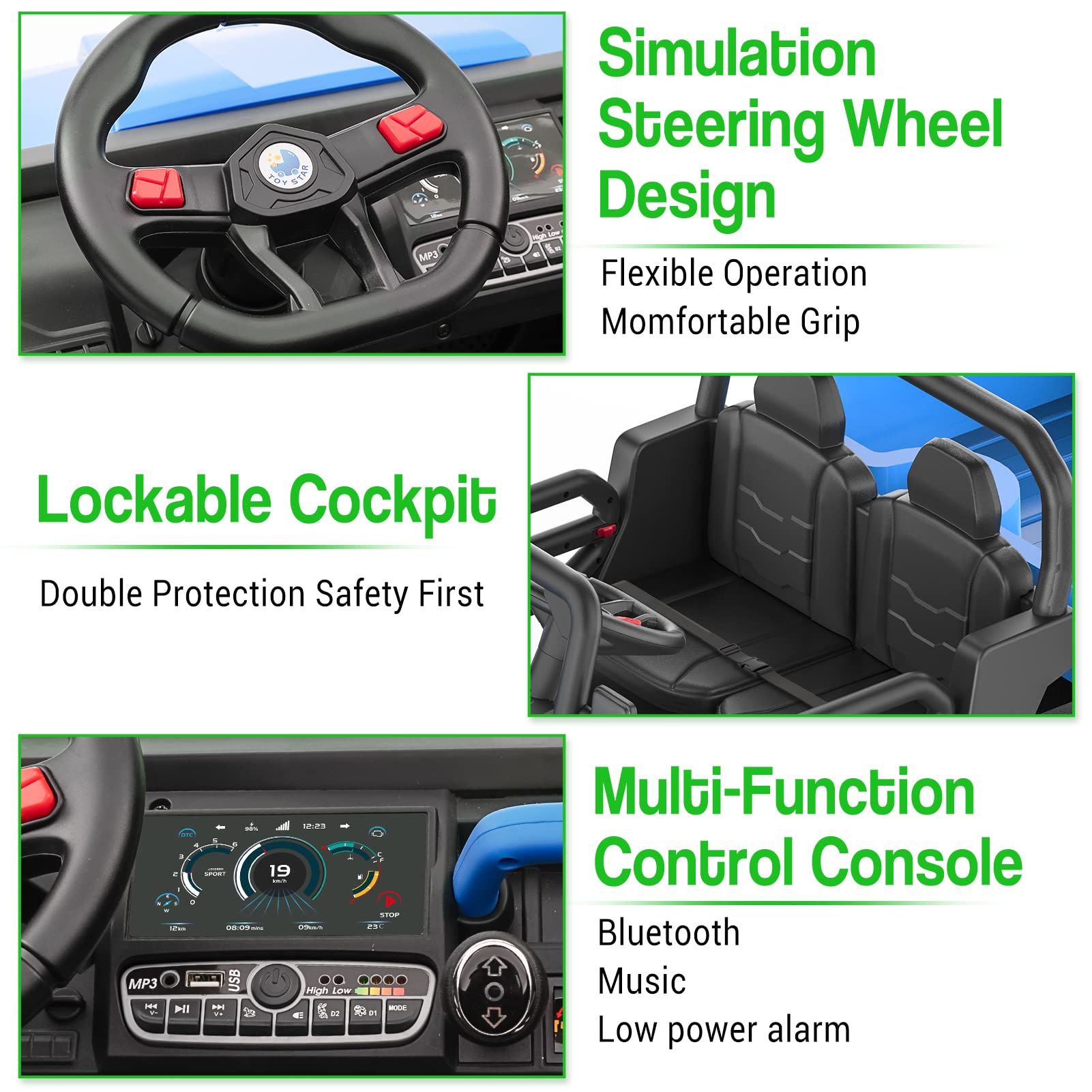 - 2 Seaters Truck w/ Electric Dump Bed: Jojokau00a0ride on truck equipped with 2 seaters and came with the a safety belt that can protect kids during driving.u00a0Tipping bucket trunk design, can let the children experience the real joy of loading and unloading.u00a0u00a0