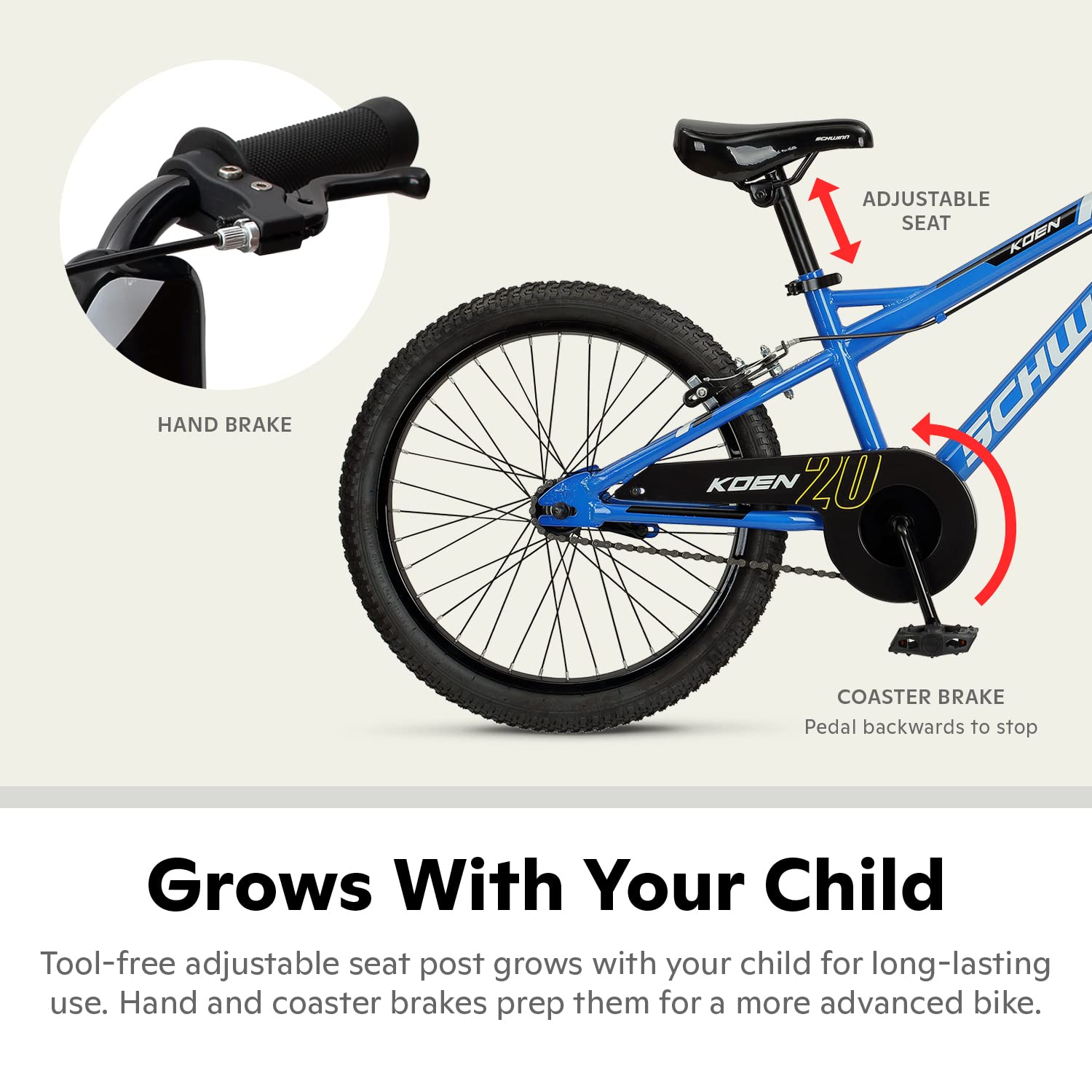 - Rear coaster foot brake, front caliper brake, easing the transition to a bigger hand brake when ready