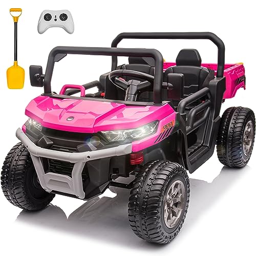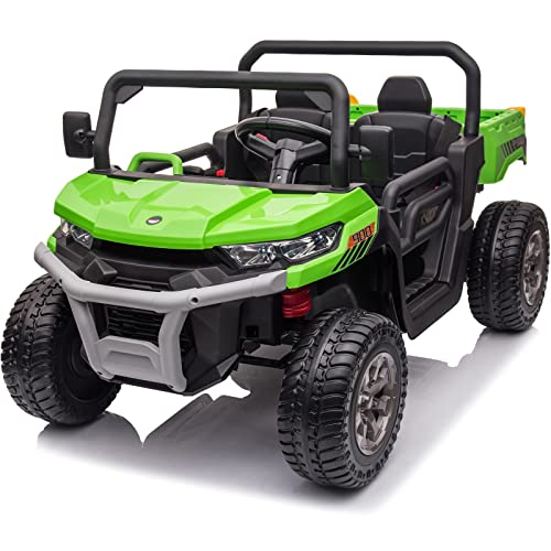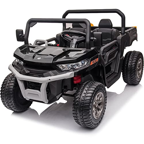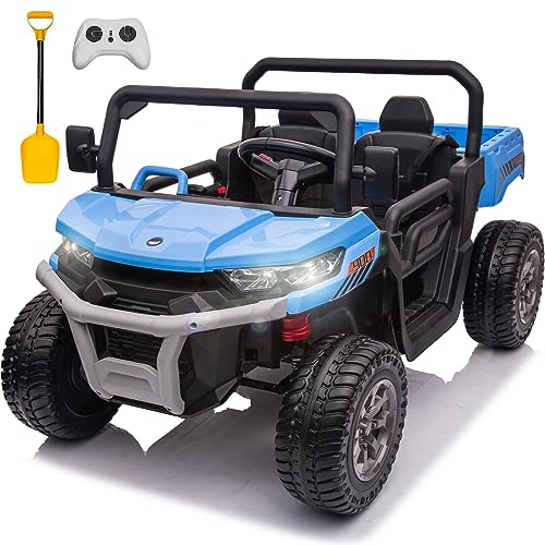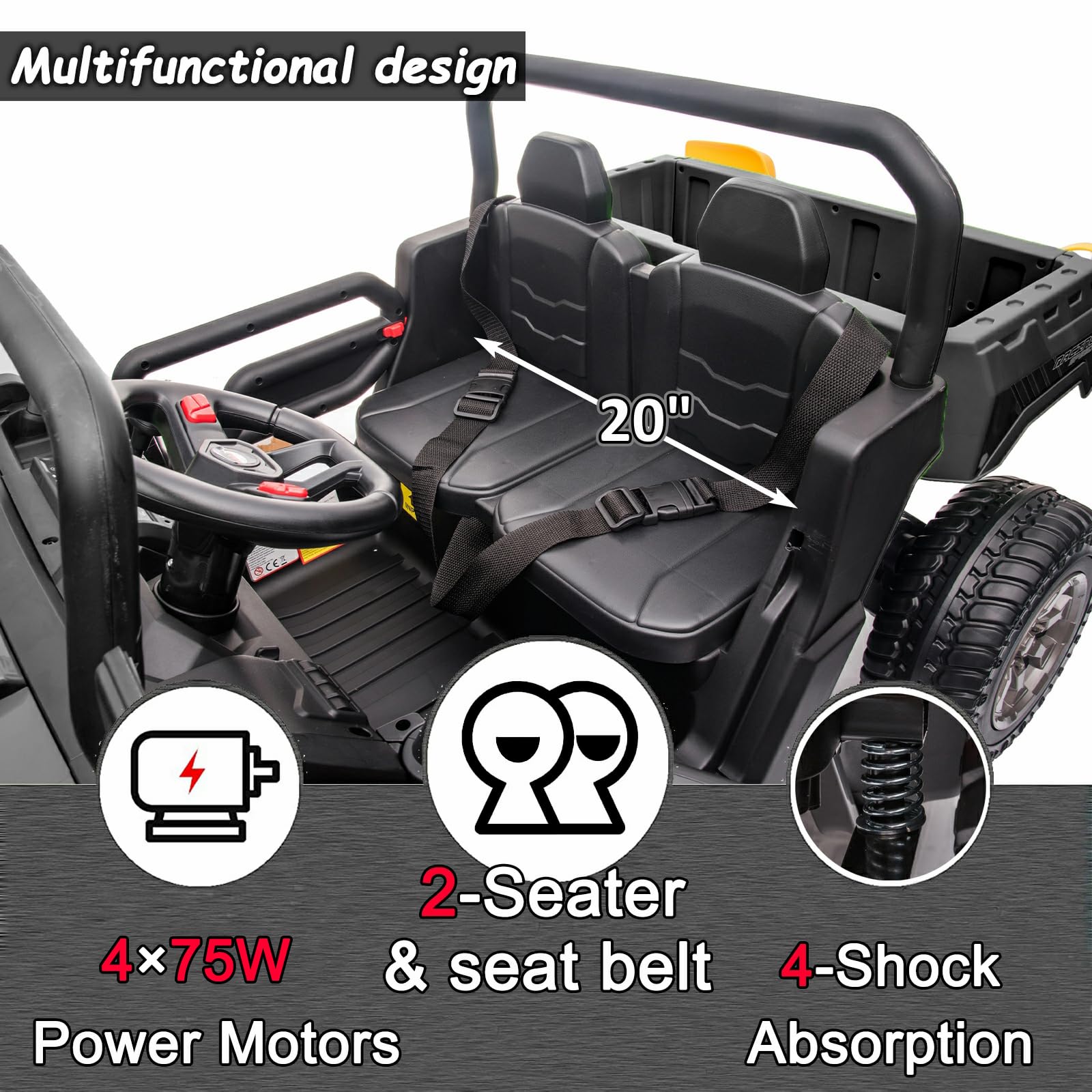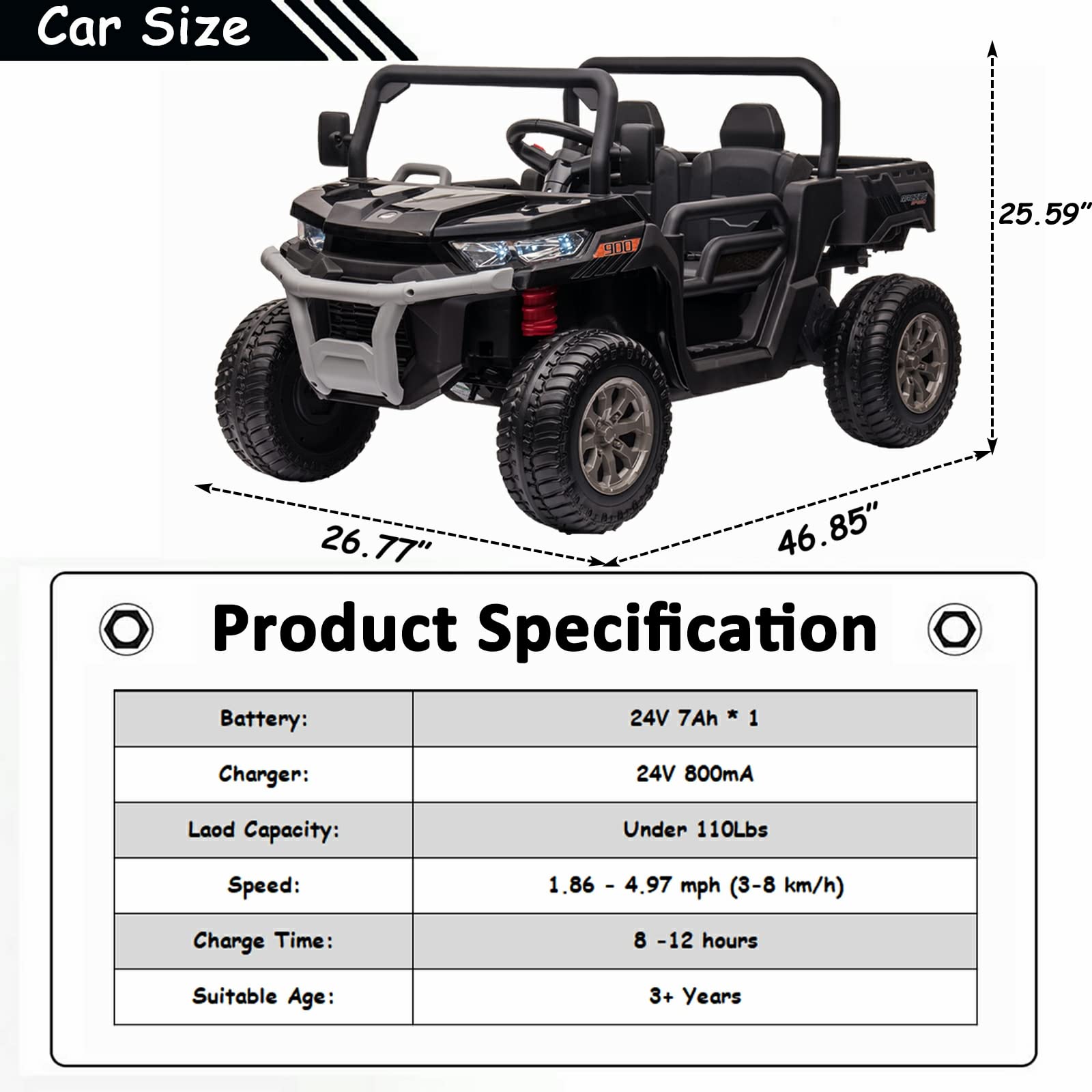 - ud83cudf81u30102-Seater UTV w/ Electric Dump Bedu3011This 2 Seater ride on dump truck is equipped with 4 strong spring suspension wich allow it to bear a maximum load of 110Lbs, ensure children of all ages can enjoy themselves. Our 24V ride on truck also equipped with an electric auto lifting dump bed and extra shovel, your kids will enjoy a transport experience with this dump truck.