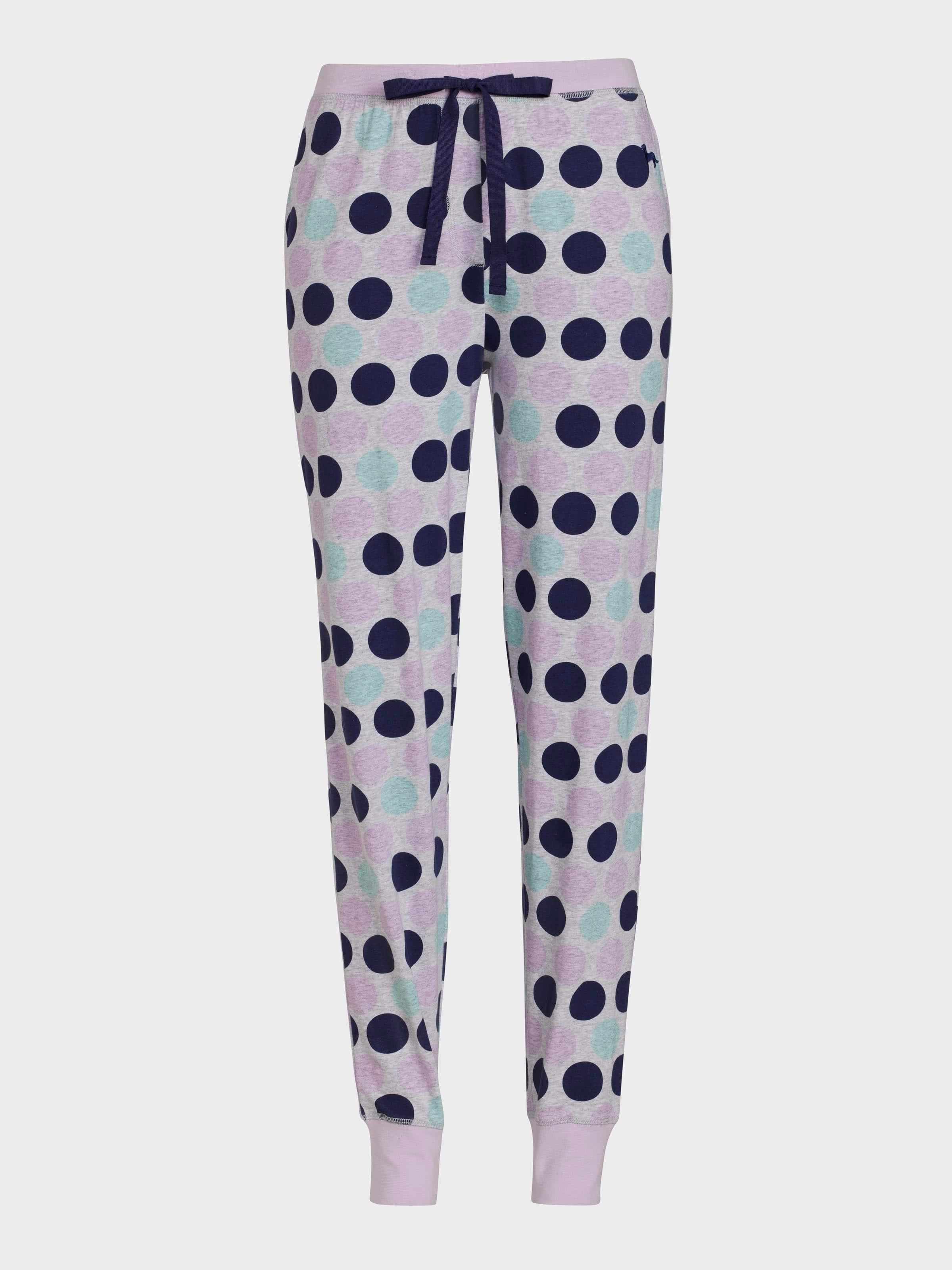 These comfy women's easy pants feature a spotty print in lavender, navy blue and soft green. Mix and match with any of these colours for a perfect pair this winter.