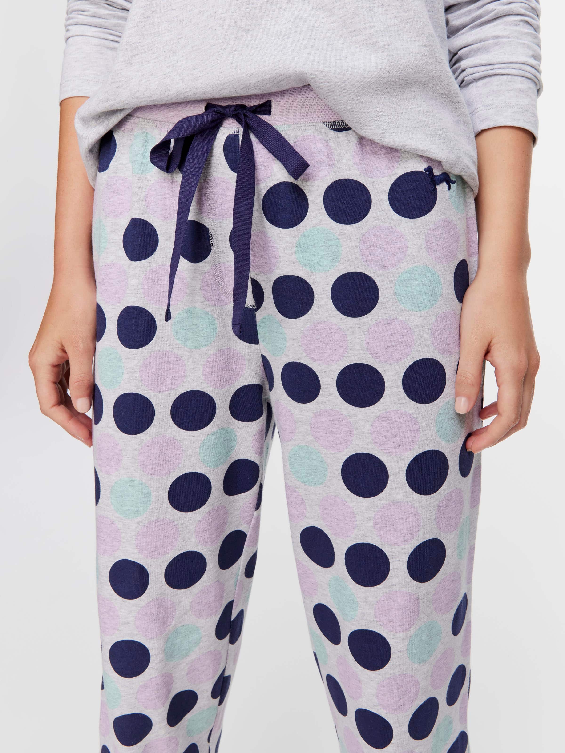 These comfy women's easy pants feature a spotty print in lavender, navy blue and soft green. Mix and match with any of these colours for a perfect pair this winter.