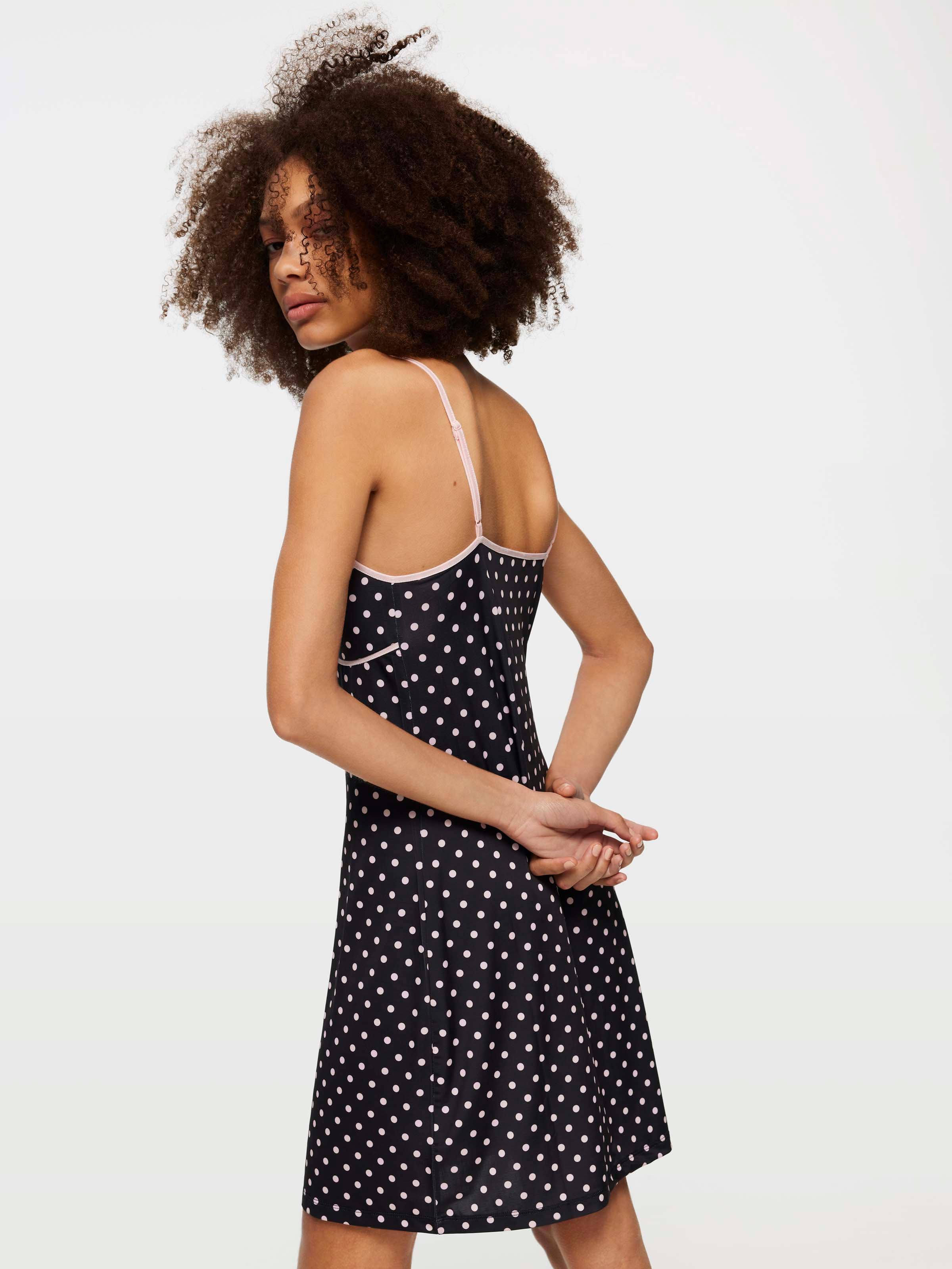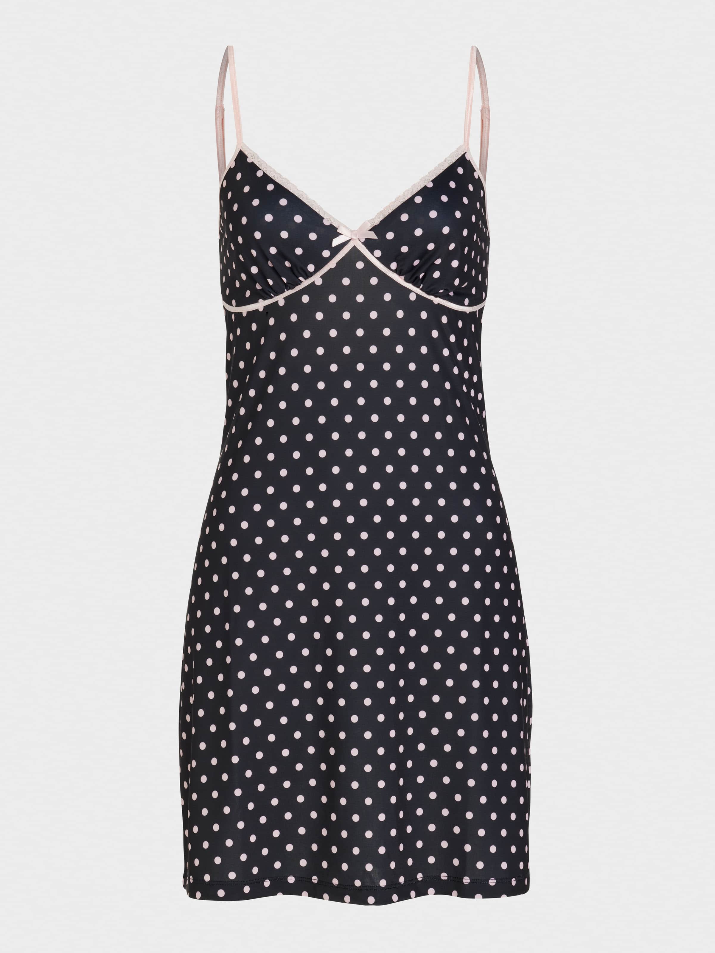 Slip into something a little more comfortable this summer with our signature slinky nightie! Our classic style returns with this sleek spot print, underbust detailing and adjustable spaghetti straps.