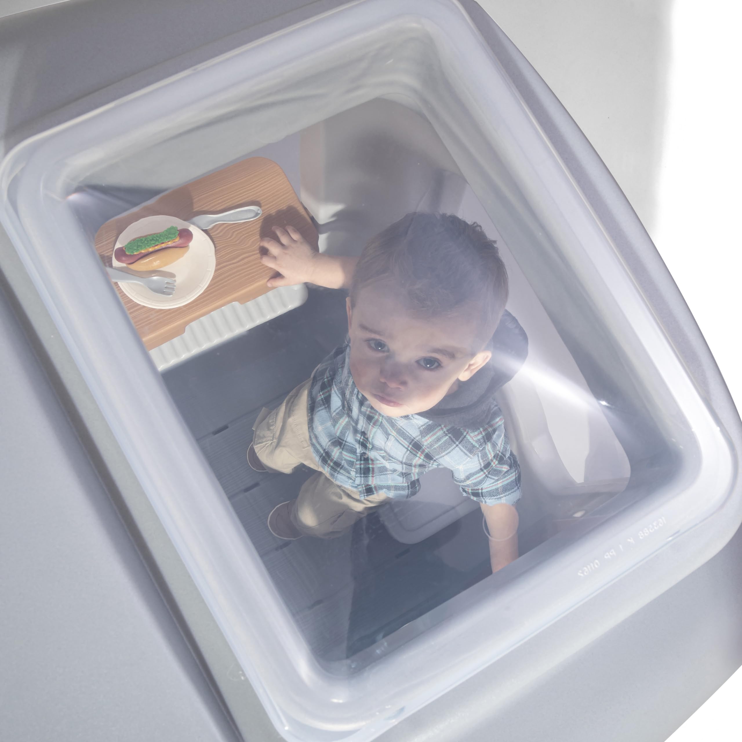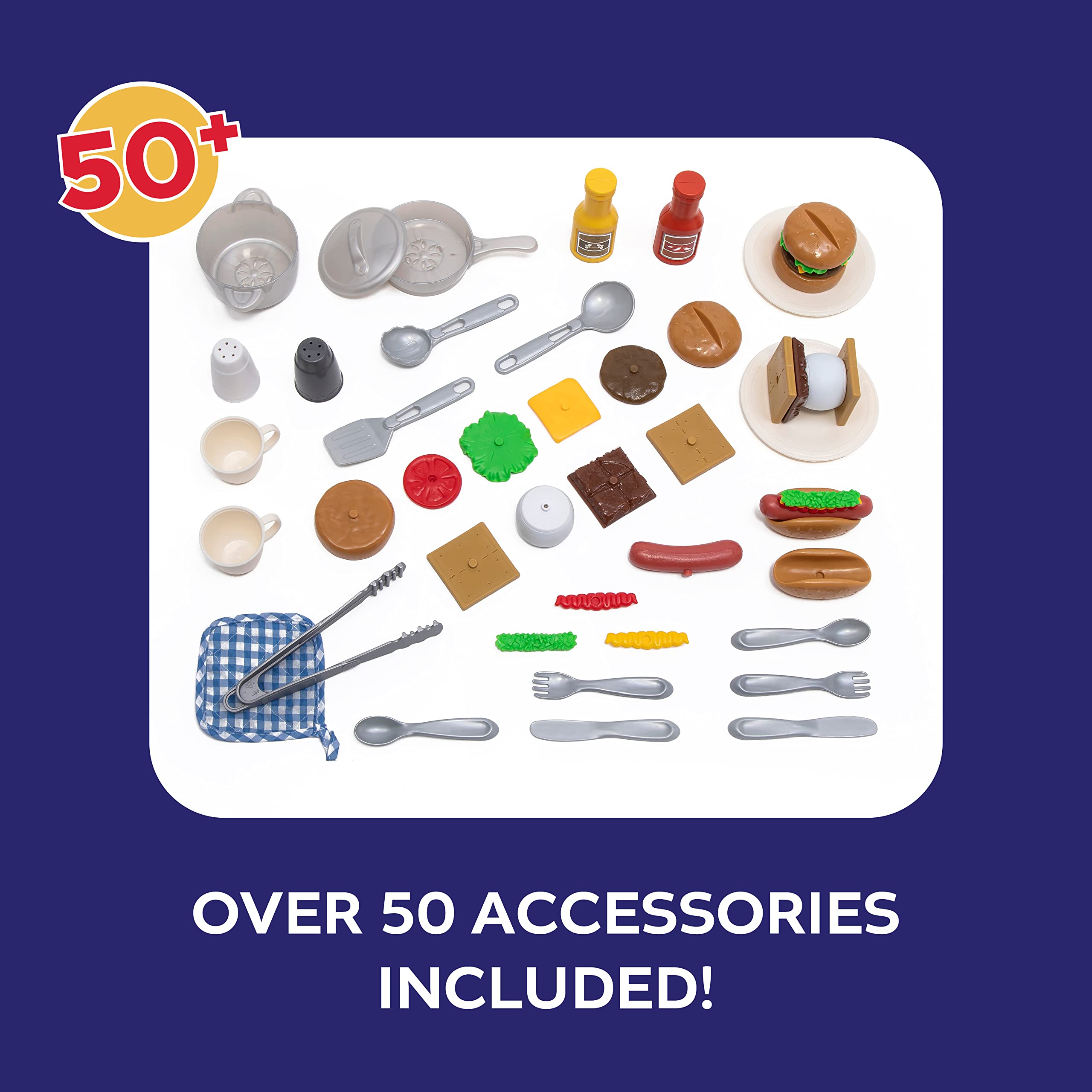 - REALISTIC: Stovetop, working doorbell, sensory clicking knobs, molded-in kitchen, grill, large storage bin, 50 piece toy accessory set including play food and utensils.
