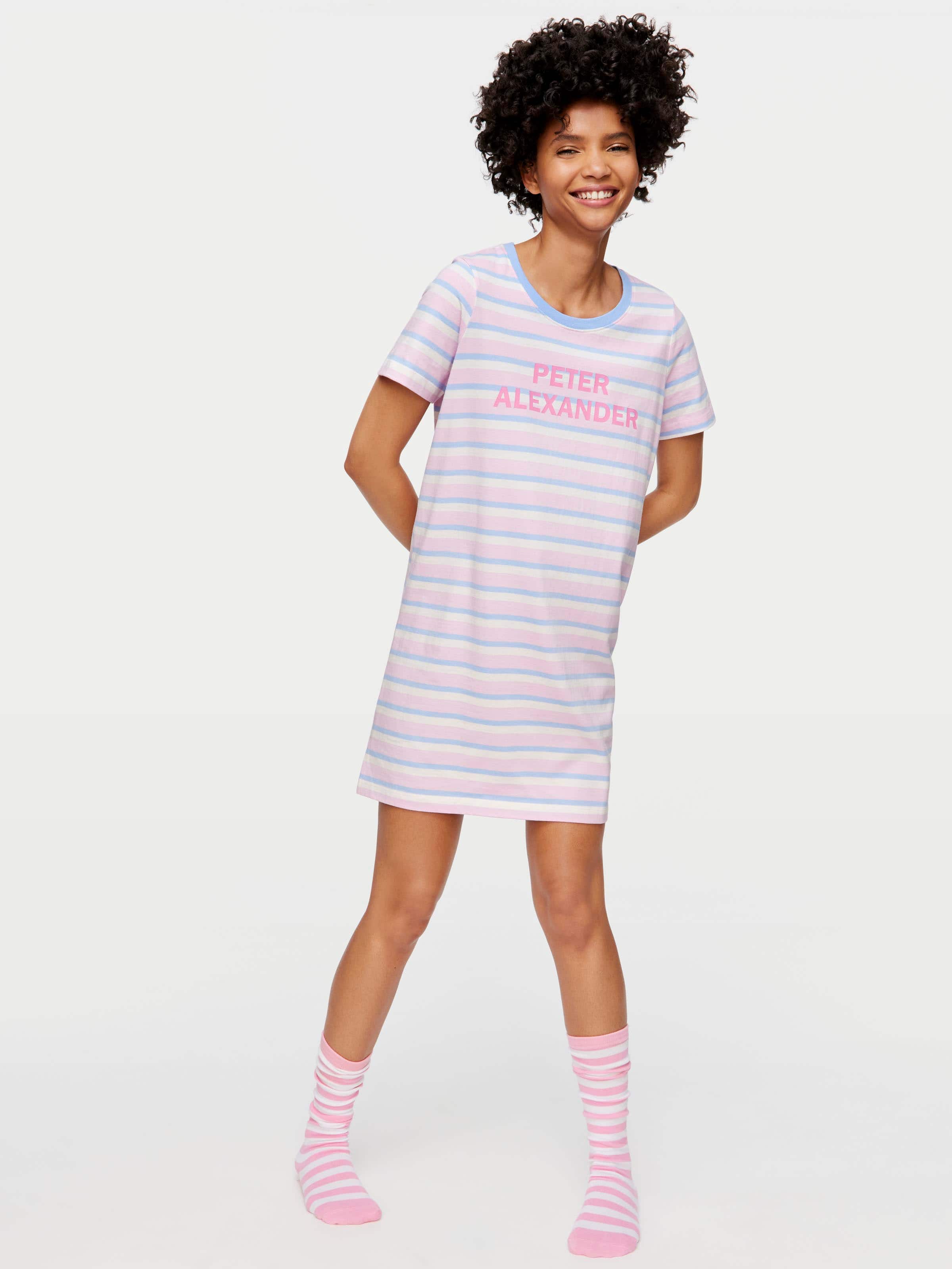 Stripe a pose in this slim fit sleep tee, featuring a pink and blue stripe pattern and Peter Alexander logo.?
