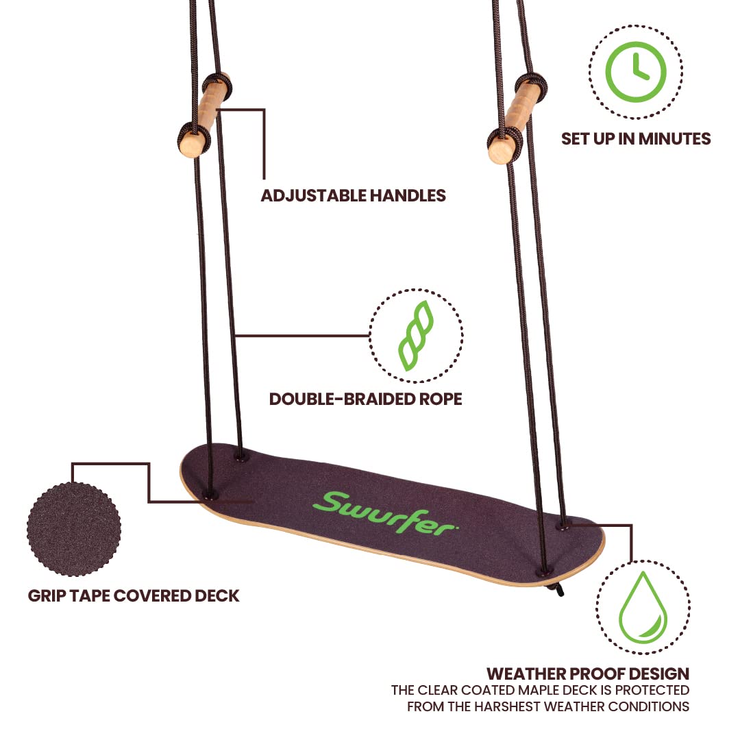 - Skateboard swing: Grip tape ensures your feet won't slip and provides traction to surf and skate the air. The weather resistant finish ensures this tree swing will last a long time.